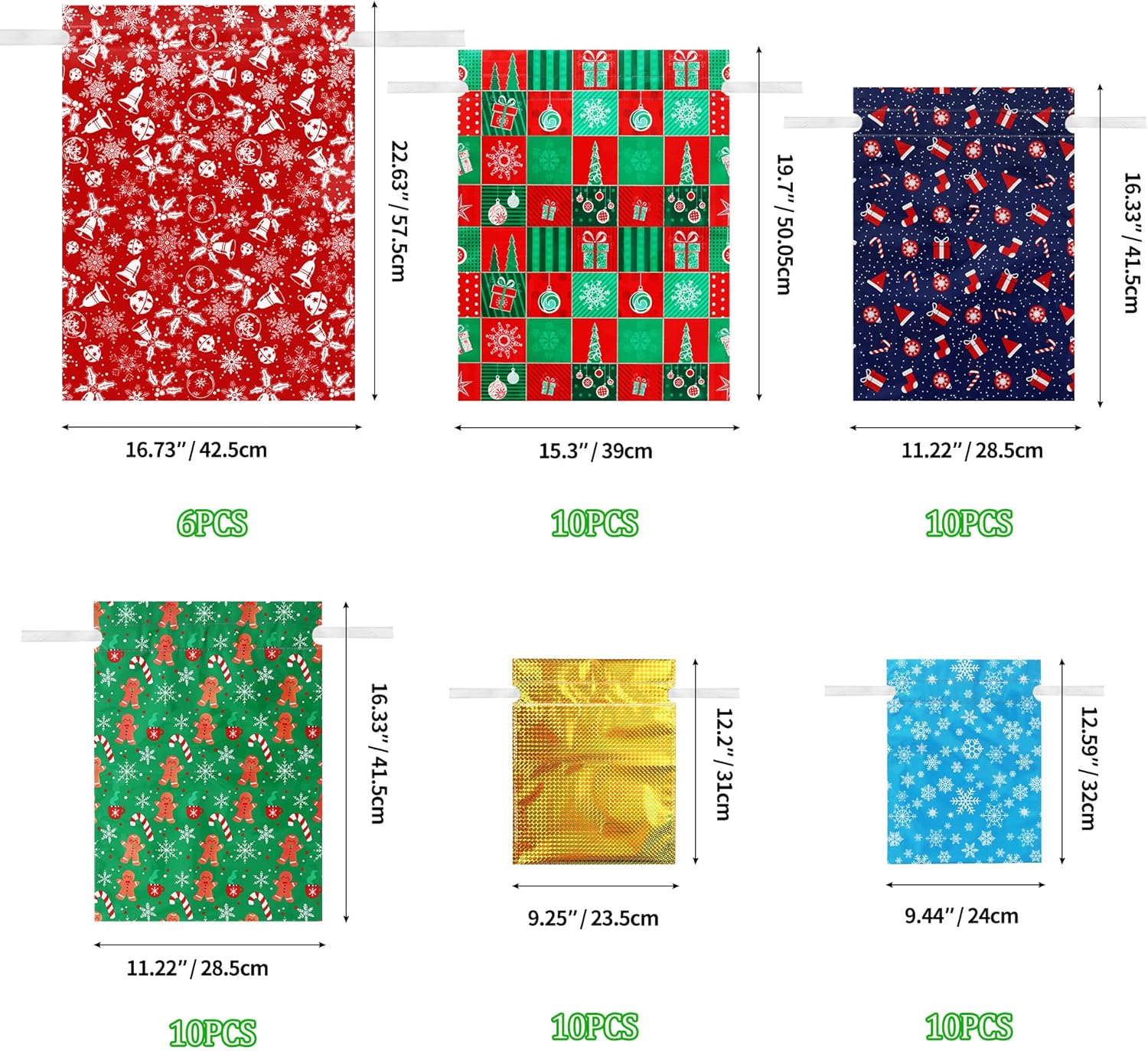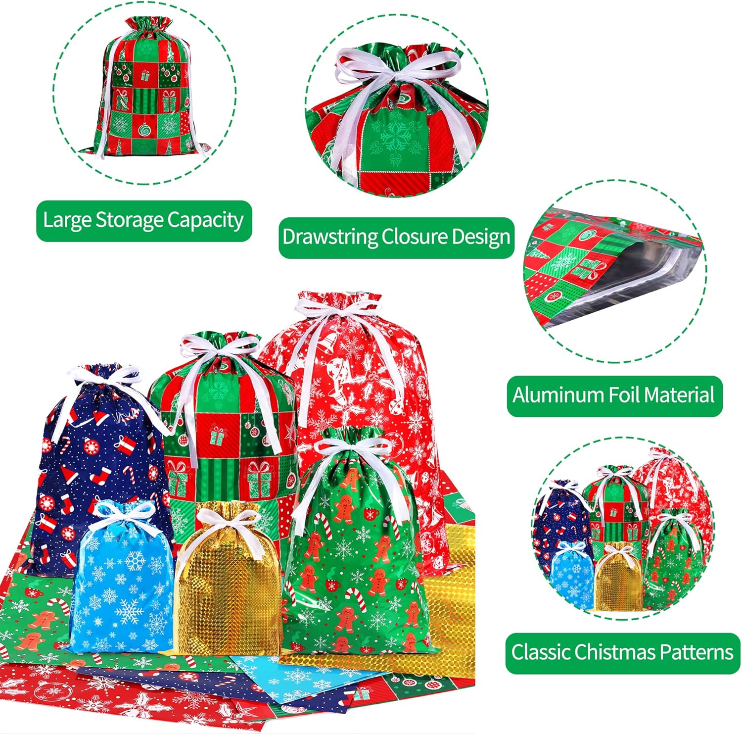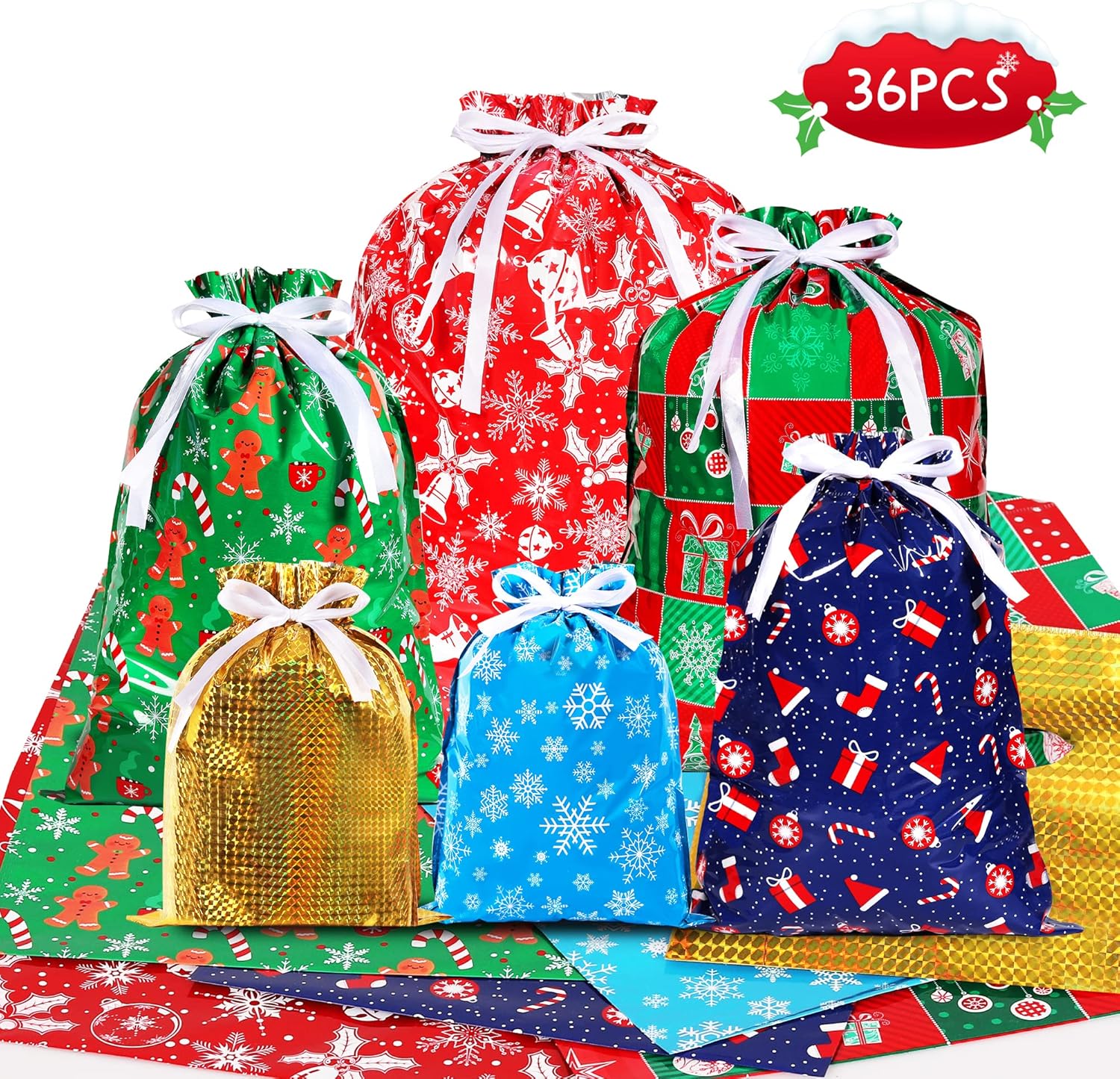 Regalo di Natale: Il set comprende 36 pezzi. sacchetti regalo natalizi assortiti. 6 sacchetti regalo extra-large misurano 58 x 43 cm, 10 sacchetti regalo grandi misurano 51 x 39 cm, 10 sacchetti regalo medi misurano 43 x 29 cm (2 modelli) e 10 sacchetti regalo piccoli misurano 32 x 24 cm (2 modelli). Durevole e riutilizzabile: tutte le borse regalo natalizie con coulisse realizzate in materiale di alluminio premium stampato riutilizzabile, ogni borsa ha due cinturini con coulisse che si inseriscono direttamente nella borsa, basta stringere il cordoncino e avvolgerlo immediatamente. Materiale premium: le borse natalizie con coulisse sono realizzate in polietilene, foglio di alluminio e pellicola di poliestere, costituite da tre strati di materiali, durevoli, non tossici, inodori, resistenti agli strappi e facili da pulire, possono contenere tutti i tipi di regali di Natale, scatole regalo, caramelle, sono durevoli e durevoli e fanno risparmiare denaro. Vari modelli e colori: i sacchetti regalo di Natale riutilizzabili sono stampati con vari motivi natalizi, come Babbo Natale, pupazzo di neve, fiocco di neve, omino di pan di zenzero e albero di Natale che è bello e accattivante, diverse dimensioni aiutano a confezionare regali diversi, pratici e convenienti. Migliora l'atmosfera di festival e armonia: i sacchetti regalo di Natale HCSSZ possono essere utilizzati per conservare regali di Natale di varie dimensioni, giocattoli di stoccaggio, bambole, cappelli di Natale, giocattoli per ragazzi e ragazze, dolci e regali in molte occasioni, come feste del Ringraziamento, feste di Natale, feste di compleanno, Capodanno, ecc.