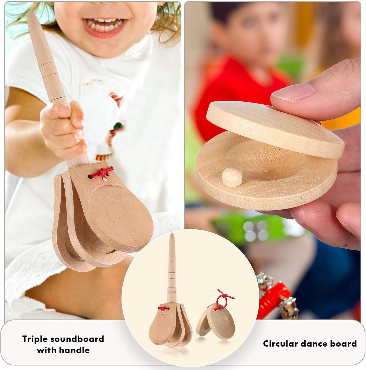 Ampia applicazione: gli strumenti musicali possono essere utilizzati come strumenti musicali in classe, adatti per esercitarsi nell'apprendimento di strumenti a percussione, piccoli strumenti a percussione e nacchere a percussione. Queste nacchere in legno sono realizzate con materiali robusti, non sono facili da deformare o rompere, possono essere riutilizzate e sono durevoli per un uso a lungo termine. strumenti musicali per principianti, strumenti musicali Unico: superficie liscia, le nacchere in legno sono confortevoli, non fanno male alle mani, sono adatte come un bel regalo, piccole nacchere, strumenti a percussione per suscitare interesse per la musica: le nacchere in legno possono avere un suono chiaro, coltivare interesse e talento per la musica, nacchere in legno con manico, nacchere strumenti musicali Lunga durata: materiali in legno, durevoli Per una lunga durata, le nacchere in legno offrono molto comfort durante la pratica e, nacchere, strumenti musicali strumenti, piccoli strumenti