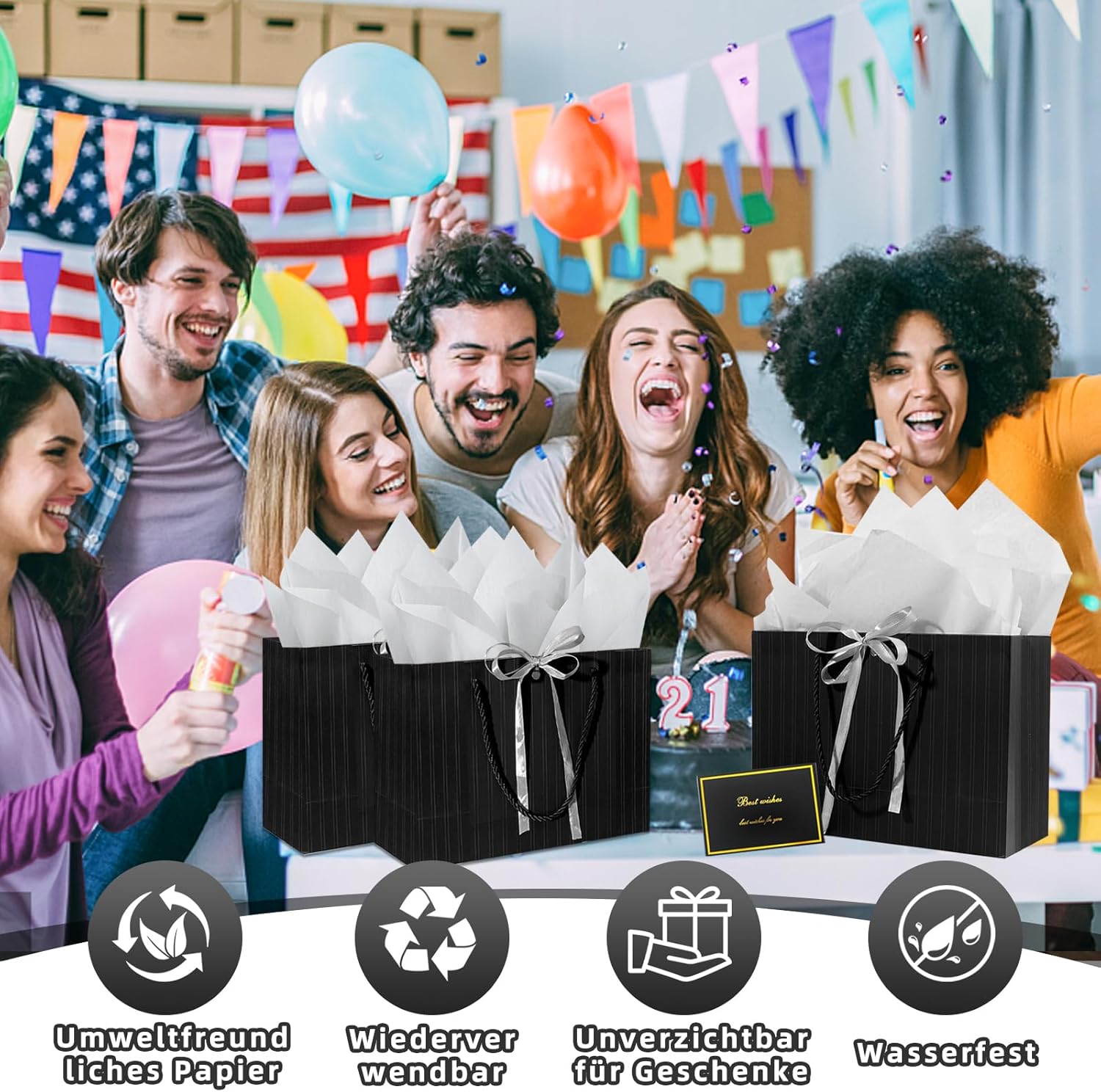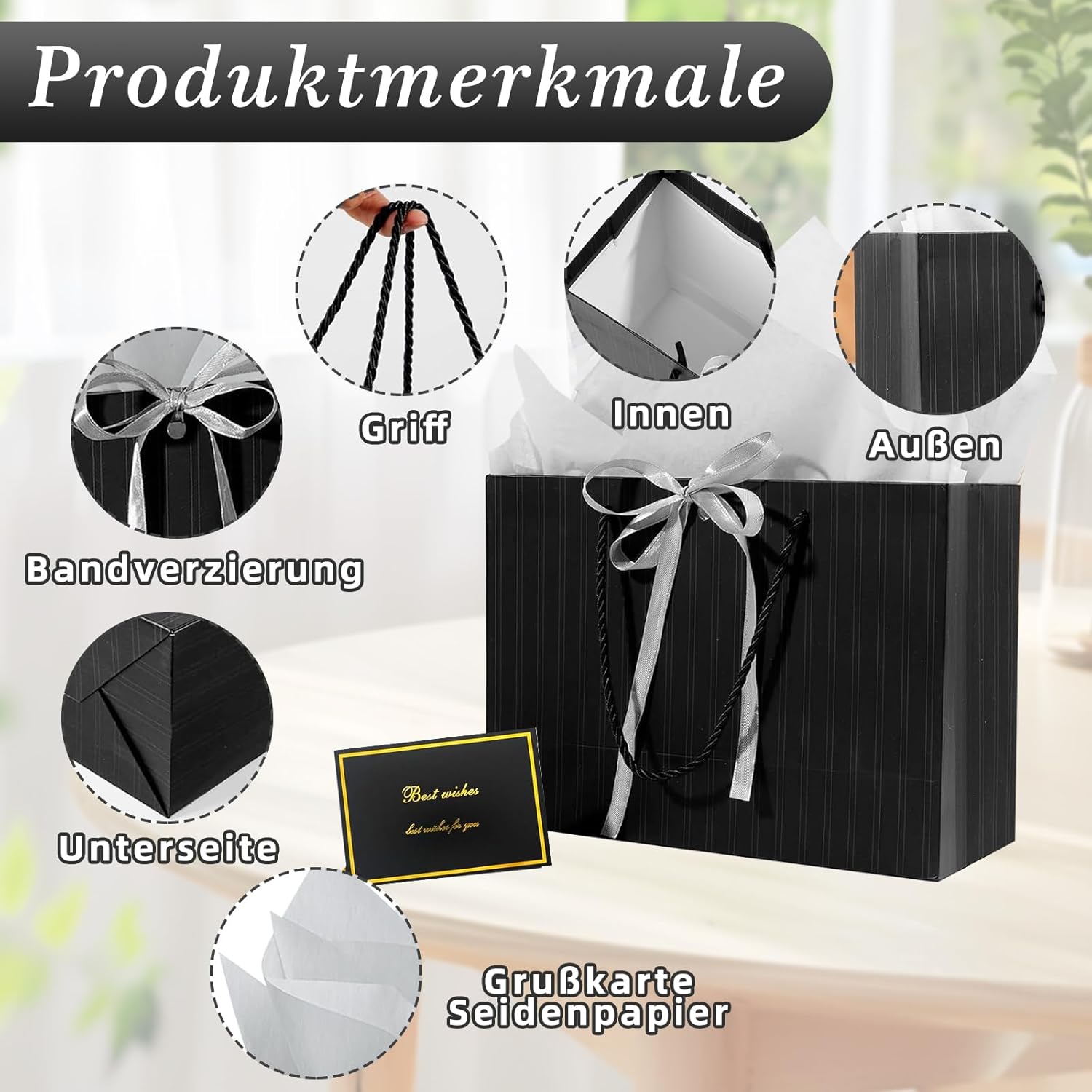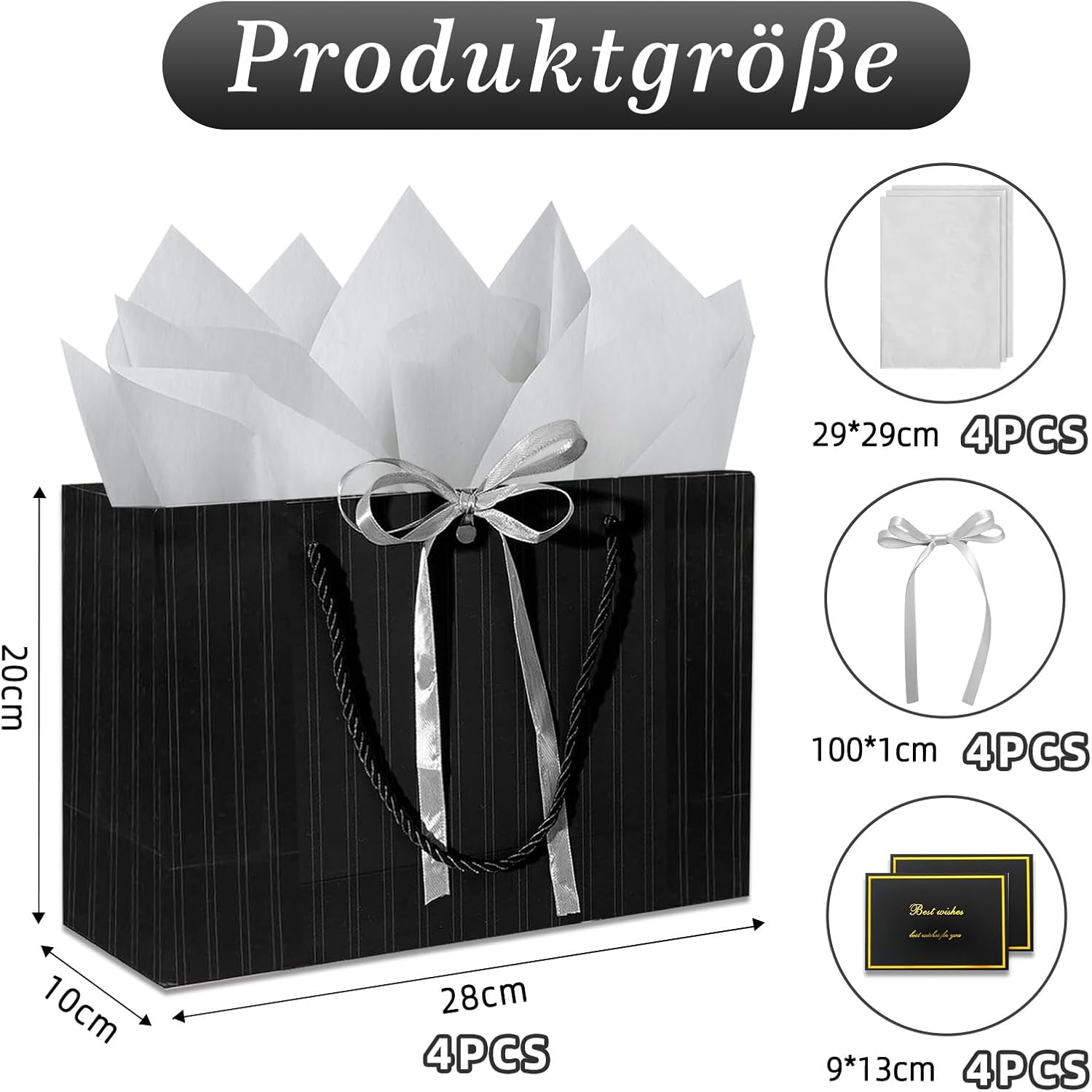Il set contiene: 4 sacchetti regalo neri (28x20x10 cm), 8 carte veline di alta qualità, 4 nastri lisci e sottili e 4 biglietti di auguri dal design accattivante. Questo non solo conferisce al tuo regalo più profondità ed estetica, ma puoi anche scriverci sopra i tuoi auguri più calorosi, creando un regalo perfetto. Materiale di alta qualità: i grandi sacchetti regalo hanno un motivo a strisce verticali grigio scuro e sembrano semplici ed eleganti. Il destinatario sarà sopraffatto dalla sorpresa e dal calore quando disimballa la confezione. e rinforzato alla base e alle maniglie, il che rende l'imballaggio molto più pratico e stabile. Risparmia tempo ed è efficiente: set combinato di sacchetti regalo per compleanno. Un set soddisfa diverse esigenze di confezione regalo e ti fa risparmiare tempo e costi aggiuntivi per la decorazione. Puoi preparare i regali rapidamente assicurandoti che il destinatario si senta curato e sorpreso. Riutilizzabile: il sacchetto regalo è realizzato in carta spessa e resistente. Questo set di sacchetti regalo riduce lo spreco di risorse. La sua struttura robusta e durevole non solo ha un bell'aspetto, ma protegge anche efficacemente i regali da urti, graffi o contaminazione da polvere durante il trasporto. Adatto a molte occasioni: questi sacchetti regalo neri sono ideali per amici, famiglia, partner, colleghi, bambini e anziani. È perfetto per feste di compleanno, matrimoni romantici, San Valentino, Natale, anniversari, lauree e feste ed eventi vari per rendere speciale qualsiasi regalo.