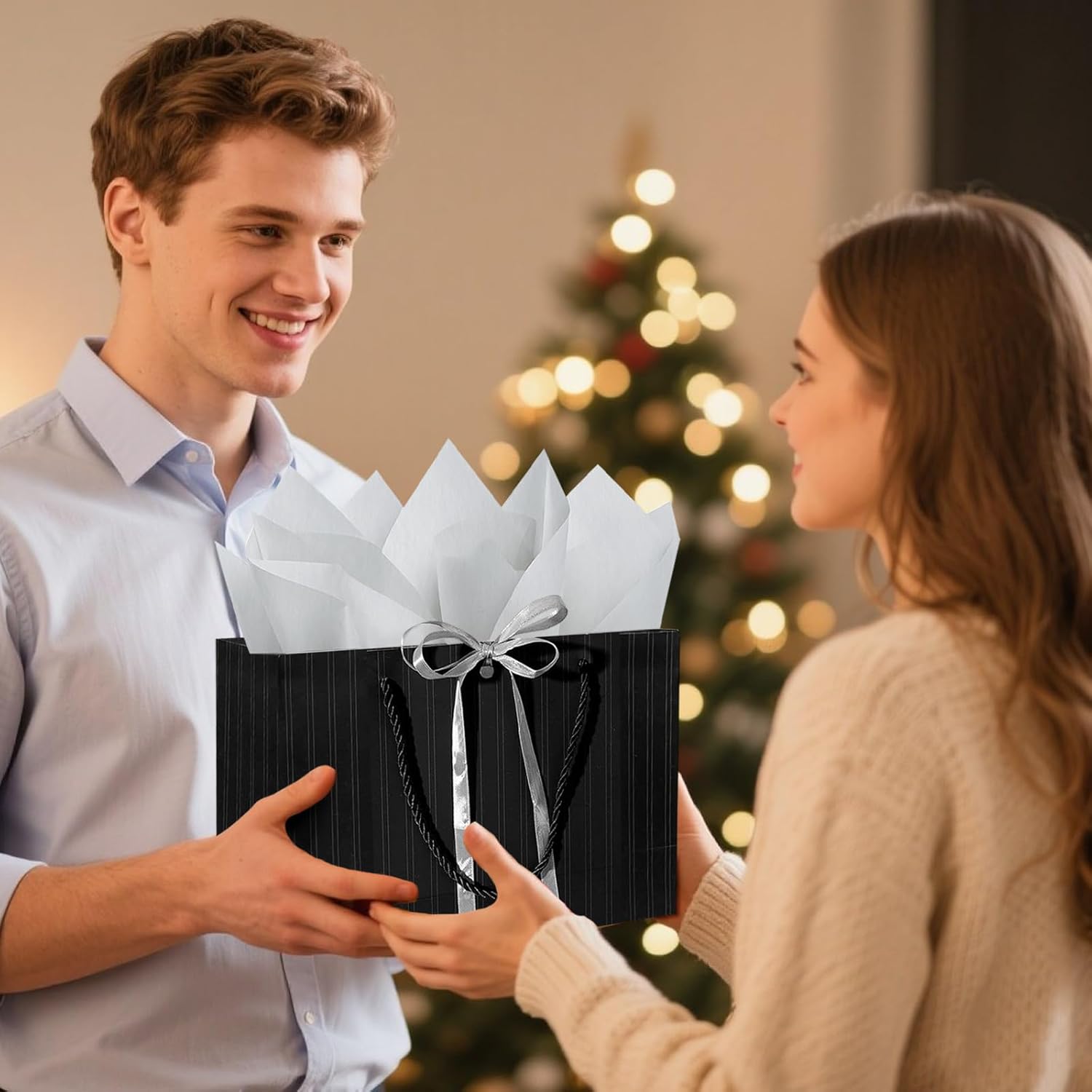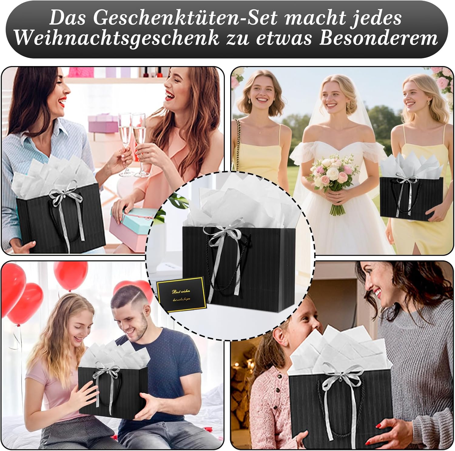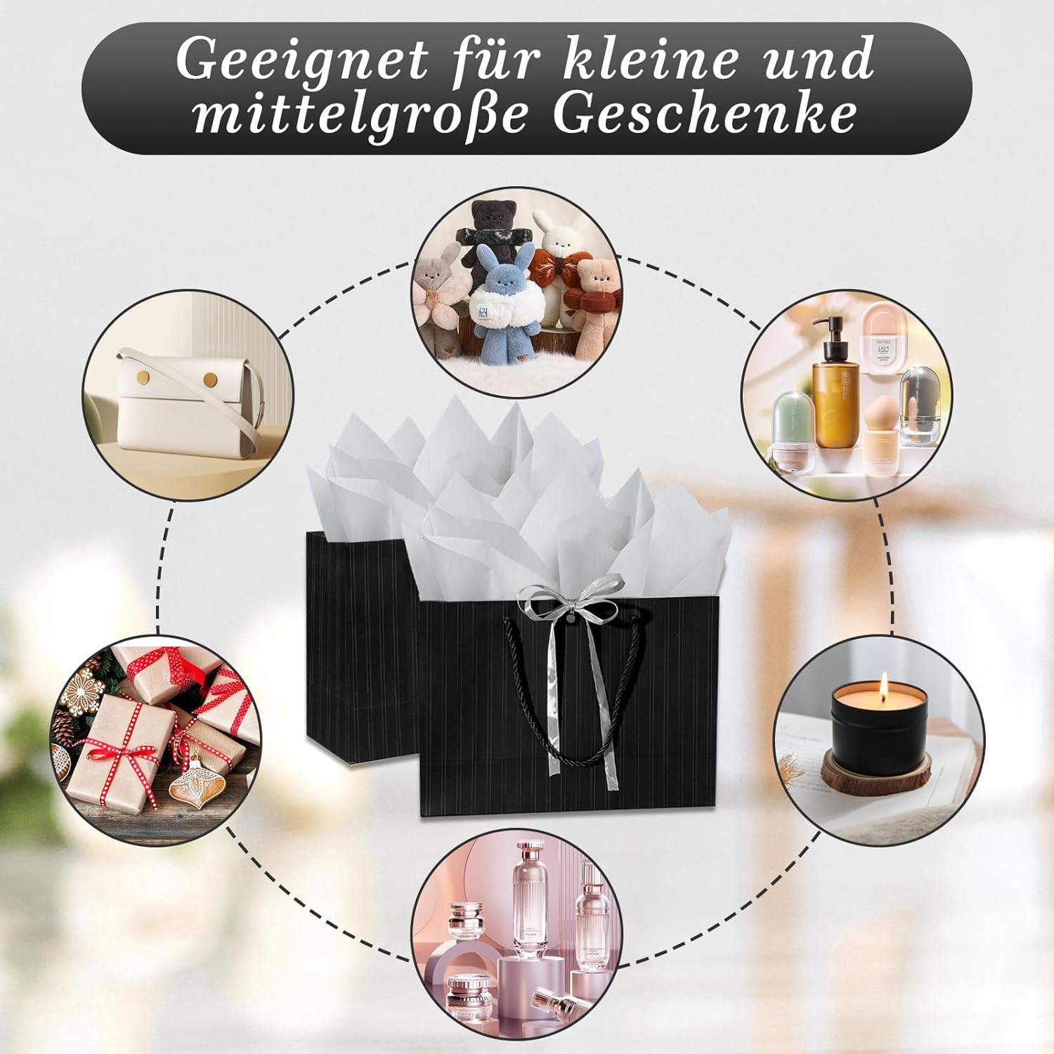 Il set contiene: 4 sacchetti regalo neri (28x20x10 cm), 8 carte veline di alta qualità, 4 nastri lisci e sottili e 4 biglietti di auguri dal design accattivante. Questo non solo conferisce al tuo regalo più profondità ed estetica, ma puoi anche scriverci sopra i tuoi auguri più calorosi, creando un regalo perfetto. Materiale di alta qualità: i grandi sacchetti regalo hanno un motivo a strisce verticali grigio scuro e sembrano semplici ed eleganti. Il destinatario sarà sopraffatto dalla sorpresa e dal calore quando disimballa la confezione. e rinforzato alla base e alle maniglie, il che rende l'imballaggio molto più pratico e stabile. Risparmia tempo ed è efficiente: set combinato di sacchetti regalo per compleanno. Un set soddisfa diverse esigenze di confezione regalo e ti fa risparmiare tempo e costi aggiuntivi per la decorazione. Puoi preparare i regali rapidamente assicurandoti che il destinatario si senta curato e sorpreso. Riutilizzabile: il sacchetto regalo è realizzato in carta spessa e resistente. Questo set di sacchetti regalo riduce lo spreco di risorse. La sua struttura robusta e durevole non solo ha un bell'aspetto, ma protegge anche efficacemente i regali da urti, graffi o contaminazione da polvere durante il trasporto. Adatto a molte occasioni: questi sacchetti regalo neri sono ideali per amici, famiglia, partner, colleghi, bambini e anziani. È perfetto per feste di compleanno, matrimoni romantici, San Valentino, Natale, anniversari, lauree e feste ed eventi vari per rendere speciale qualsiasi regalo.