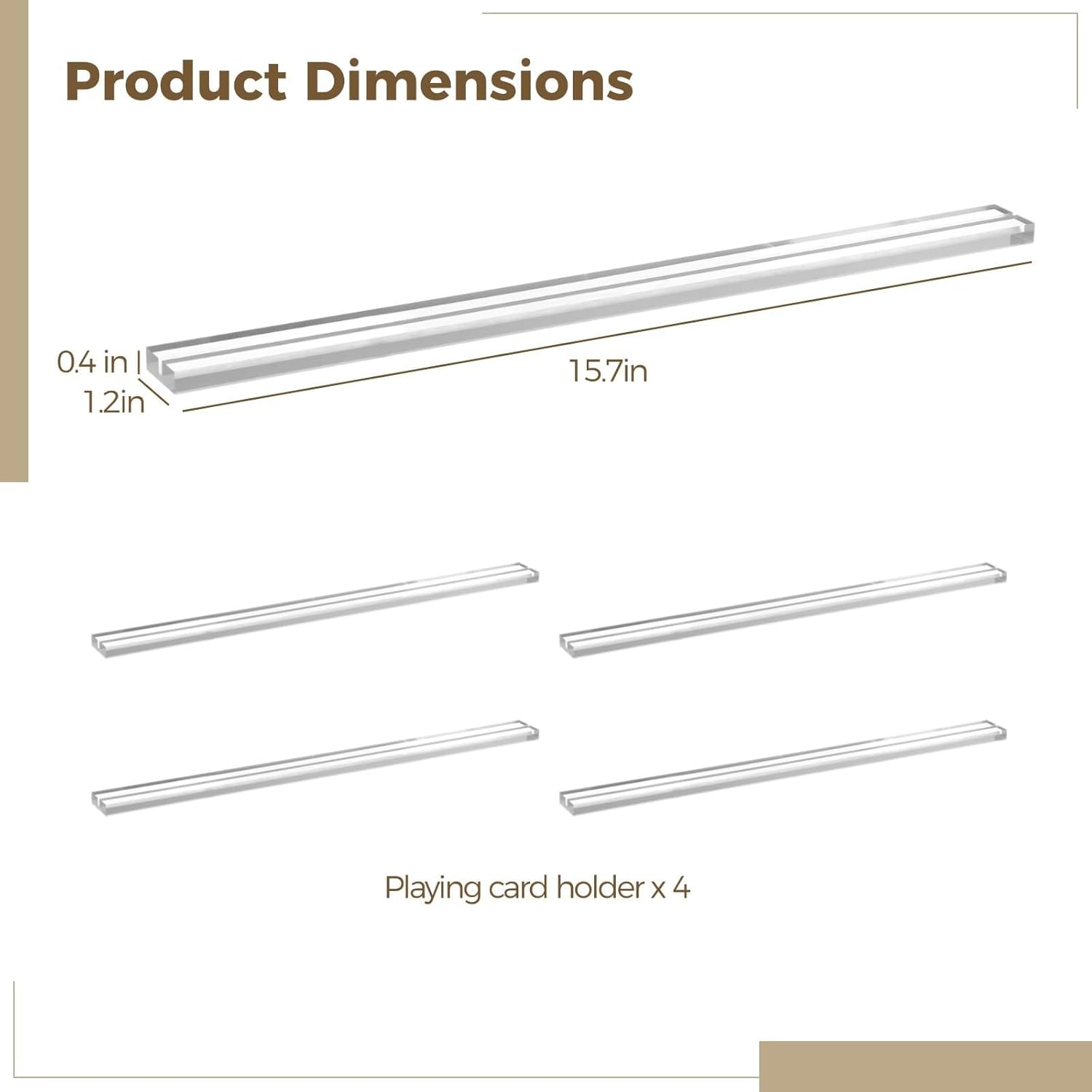 Organizzazione delle carte semplificata: mostra e organizza le tue carte ordinatamente con questi robusti supporti in acrilico; per poker e altri giochi di carte Acrilico di alta qualità: realizzato in acrilico robusto; progettato per durare nel tempo; resiste a crepe, scheggiature o sbiadimento nel tempo Dimensioni ideali per la maggior parte delle carte: misura 39,9 x 3 x 1 cm; la larghezza dello slot di 0,3 cm tiene le carte in modo sicuro; ideale per riporre in modo efficiente Viene fornito con 4 supporti: il set include quattro supporti in acrilico; per l'uso a casa o durante le serate di gioco con amici e familiari Trasparente ed elegante: la struttura in acrilico trasparente completa l'arredamento della tua area di gioco; le carte rimangono visibili e facilmente accessibili