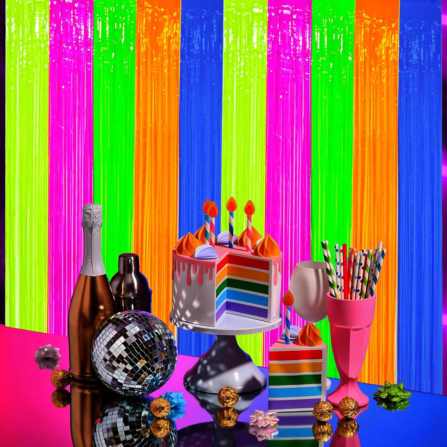 Colori vivaci al neon: illumina la tua festa con questi abbaglianti stelle filanti al neon, caratterizzate da un arcobaleno di viola, giallo, verde, arancione e blu; sotto la luce nera, i colori brillano ancora più intensamente, creando un'affascinante atmosfera al neon che stupirà i tuoi ospiti; perfetto per cabine fotografiche, fondali di palcoscenico e decorazioni da discoteca! Lamina metallica di qualità: realizzate in resistente lamina metallica spessa 0,3 mm, queste tende con frange al neon sono leggere ma resistenti agli strappi; la superficie riflettente cattura e rifrange la luce magnificamente, aggiungendo profondità scintillante a qualsiasi festa o celebrazione a tema neon. Facile da appendere: ogni confezione include 3 tende con frangia in lamina pre-tagliate, la lunghezza di ogni tenda è di 1 x 2 m, pronta per decorare in pochi secondi; basta staccare il supporto adesivo e attaccarle a pareti, porte o tavoli, senza bisogno di attrezzi Grande decorazione per feste: trasforma la tua festa in un luminoso paese delle meraviglie al neon. Ideali per compleanni, matrimoni, lauree, addio al nubilato e serate in discoteca; queste accattivanti stelle filanti si illuminano al buio rendono indimenticabili sfondi per foto e momenti degni di nota sui social media. Ampie applicazioni: che si tratti di una festa luminosa, una discoteca anni '80 o una festa festiva, queste tende scintillanti aggiungono energia istantanea; usale per decorazioni di scena, accenti per camera da letto o sfondo bar per impressionare e creare ricordi duraturi!