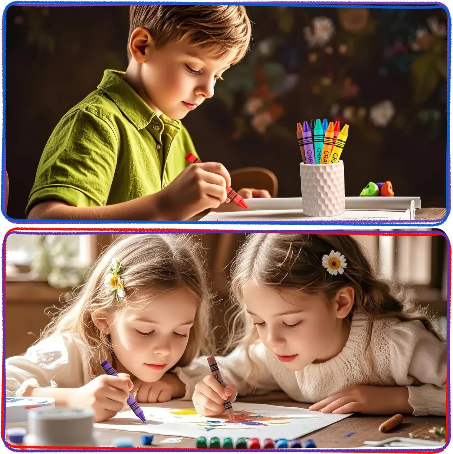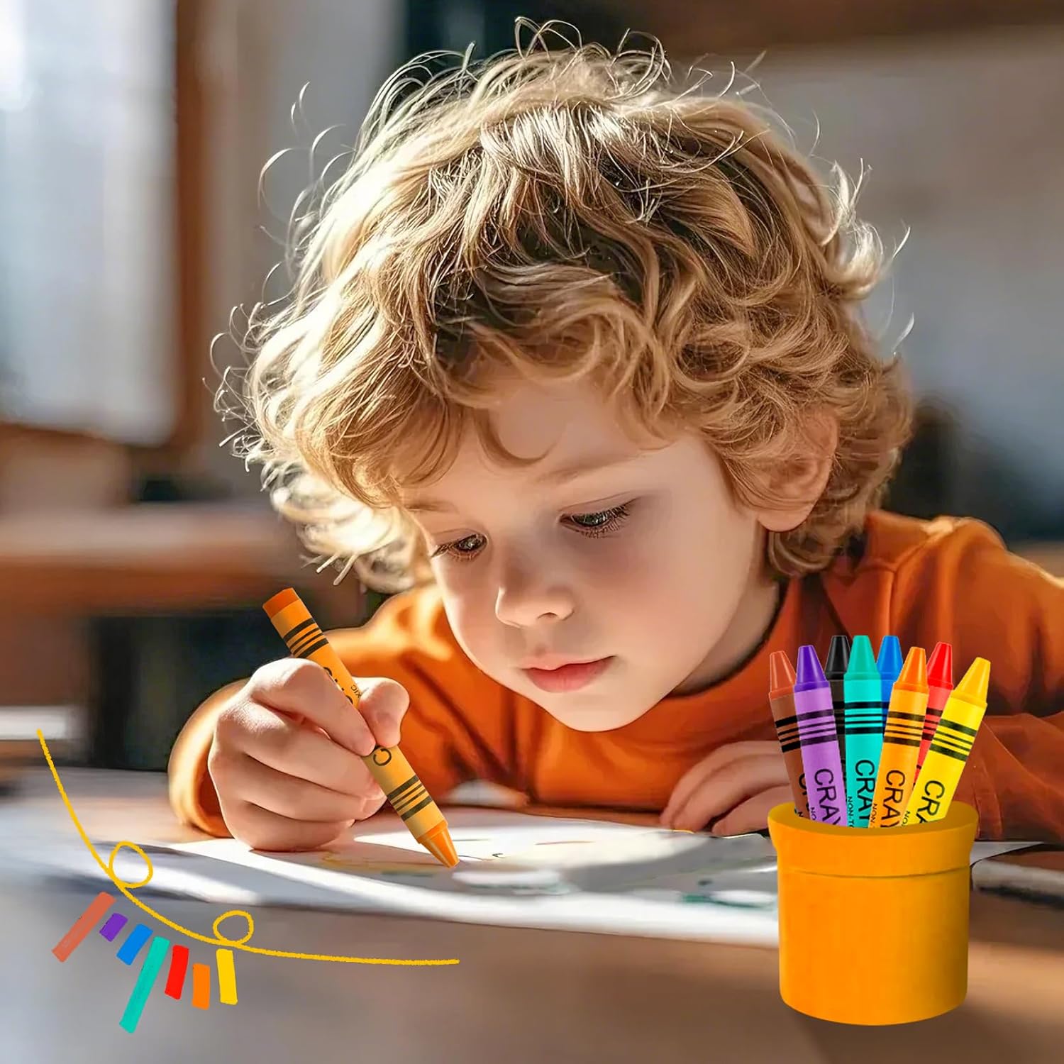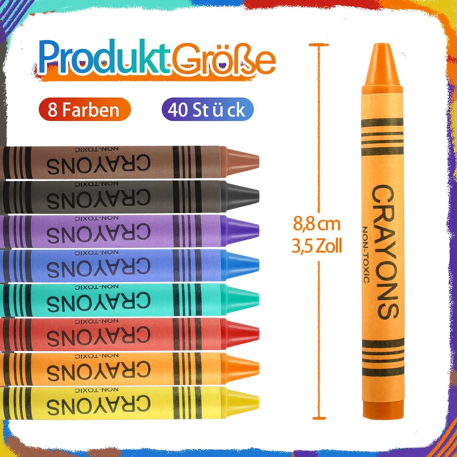Set di matite colorate: riceverete una grande confezione da 40 pastelli a cera, disponibili in 8 diversi colori. Disponibile in rosso, blu, verde, giallo, viola, marrone, grigio e arancione. Con questa grande quantità di matite colorate, il vostro piccolo avrà un divertimento senza fine. Alta qualità: questi crayon sono realizzati con materiali di alta qualità, belli, resistenti e non si rompono facilmente. Le matite di cera sono sicure per i vostri piccoli. Facile da tenere: i pastelli a cera sono lunghi circa 8,8 cm e hanno un diametro di 0,7 cm. Grazie a queste dimensioni compatte, sono ideali anche per piccole mani da afferrare e utilizzare. Perfetto per i più piccoli che stanno imparando a usare le matite colorate e disegnare. Esprimere la creatività ovunque: con 8 matite colorate luminose di grandi dimensioni, il vostro piccolo può scoprire la sua creatività e godersi la libertà di dipingere. Questo è un ottimo strumento educativo per aiutare i più piccoli a riconoscere i colori, migliorare la coordinazione occhio-mano, promuovere il pensiero artistico e stimolare la loro immaginazione e creatività. Ampiamente utilizzato: questi blocchi di cera sono ideali per feste, casa, attività extrascolastiche e altro ancora. Ideale per tutti coloro che desiderano ricostituire i materiali prescolari e per l'asilo per l'inizio della scuola. È anche un regalo meraviglioso per il vostro piccolo per l'inizio della scuola, per compleanni o altre feste.