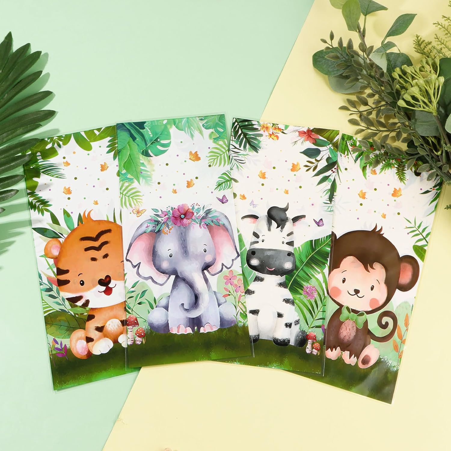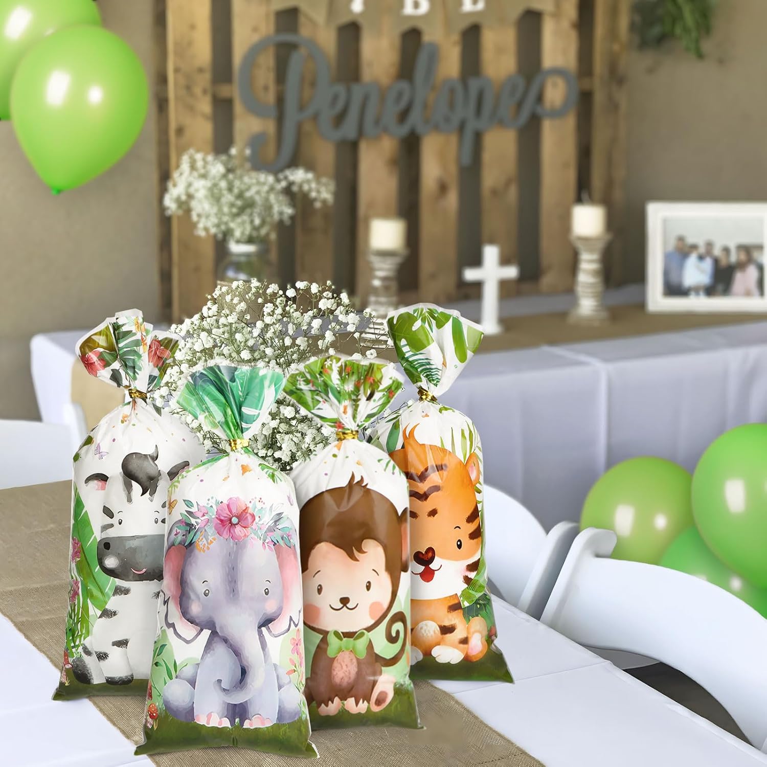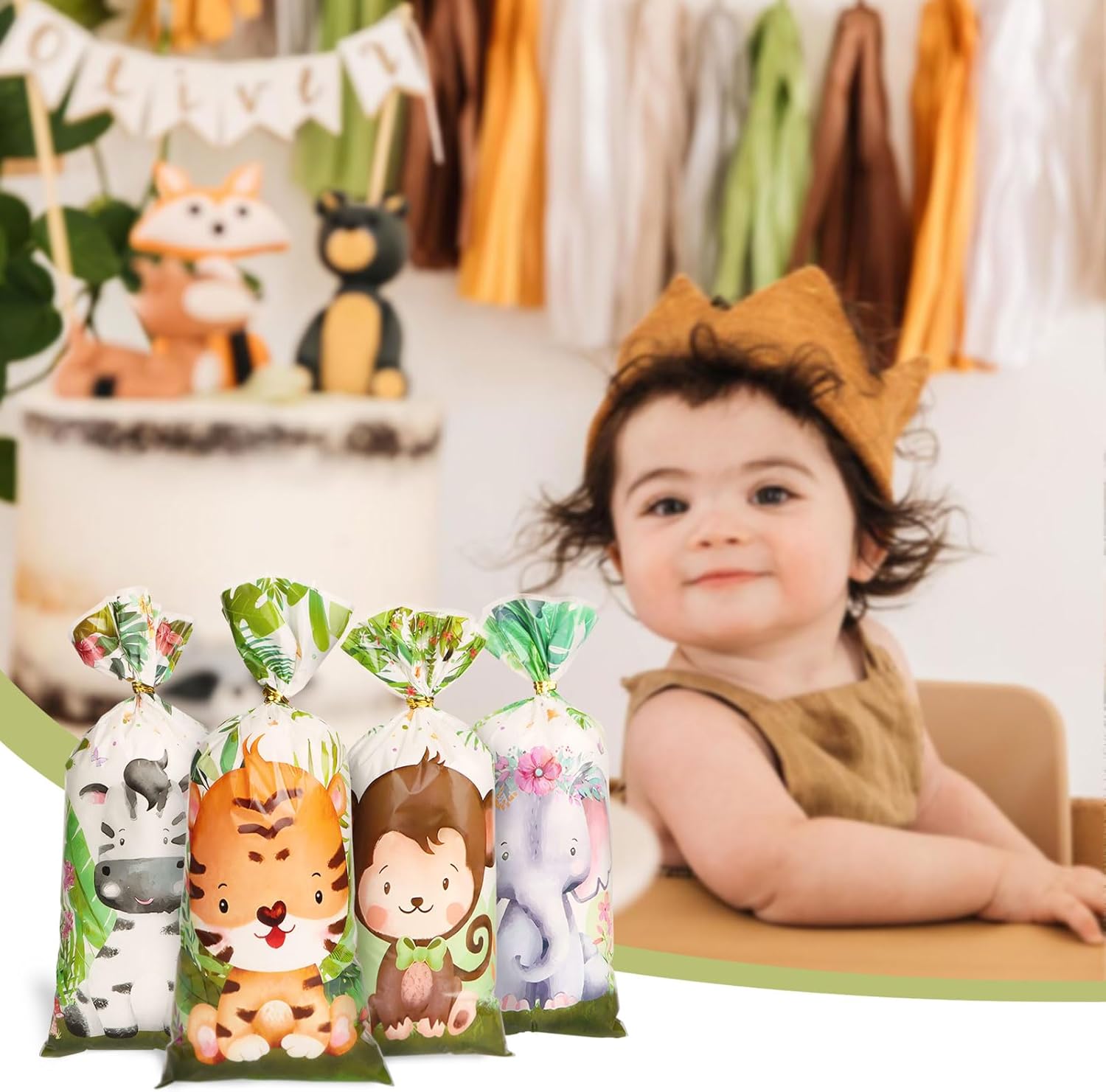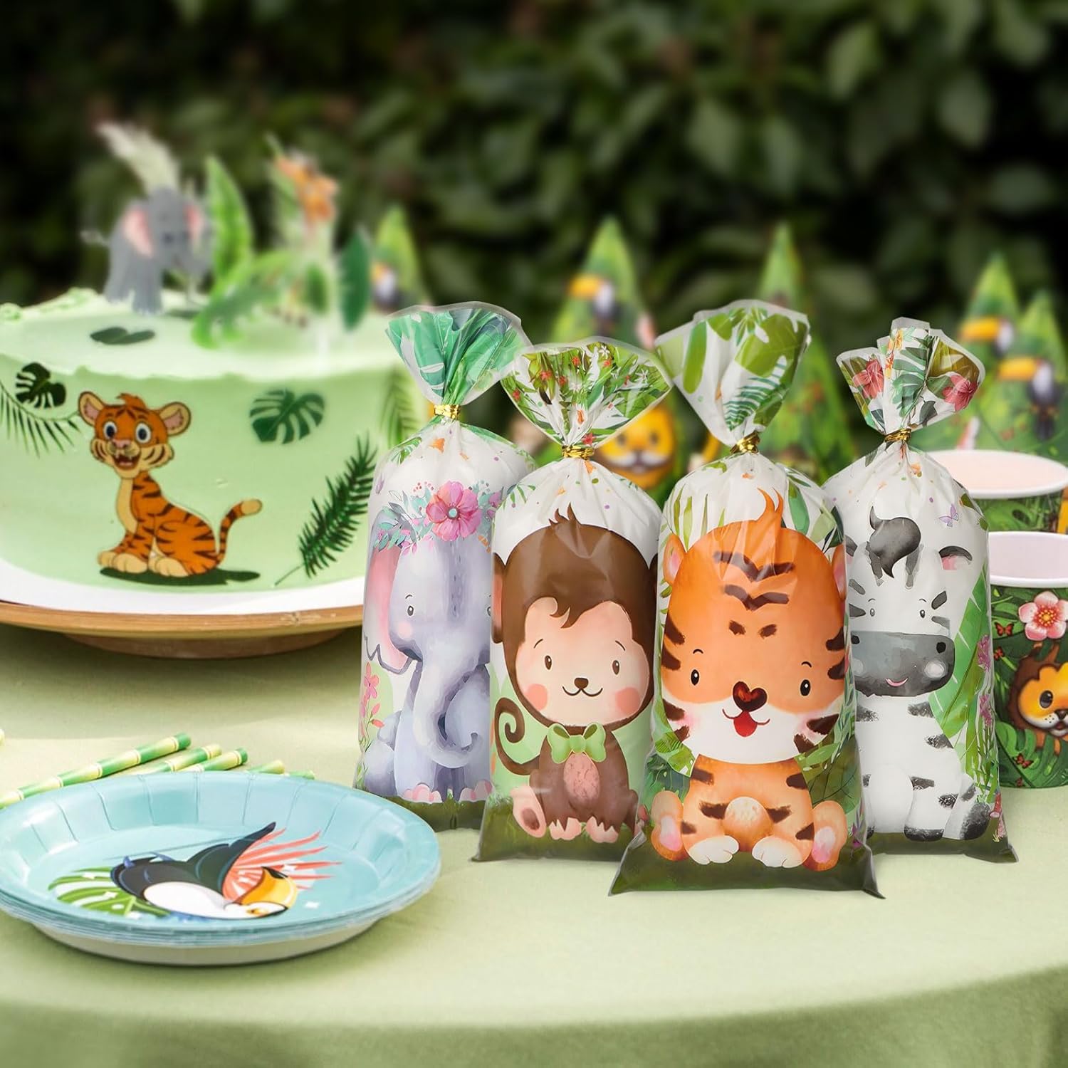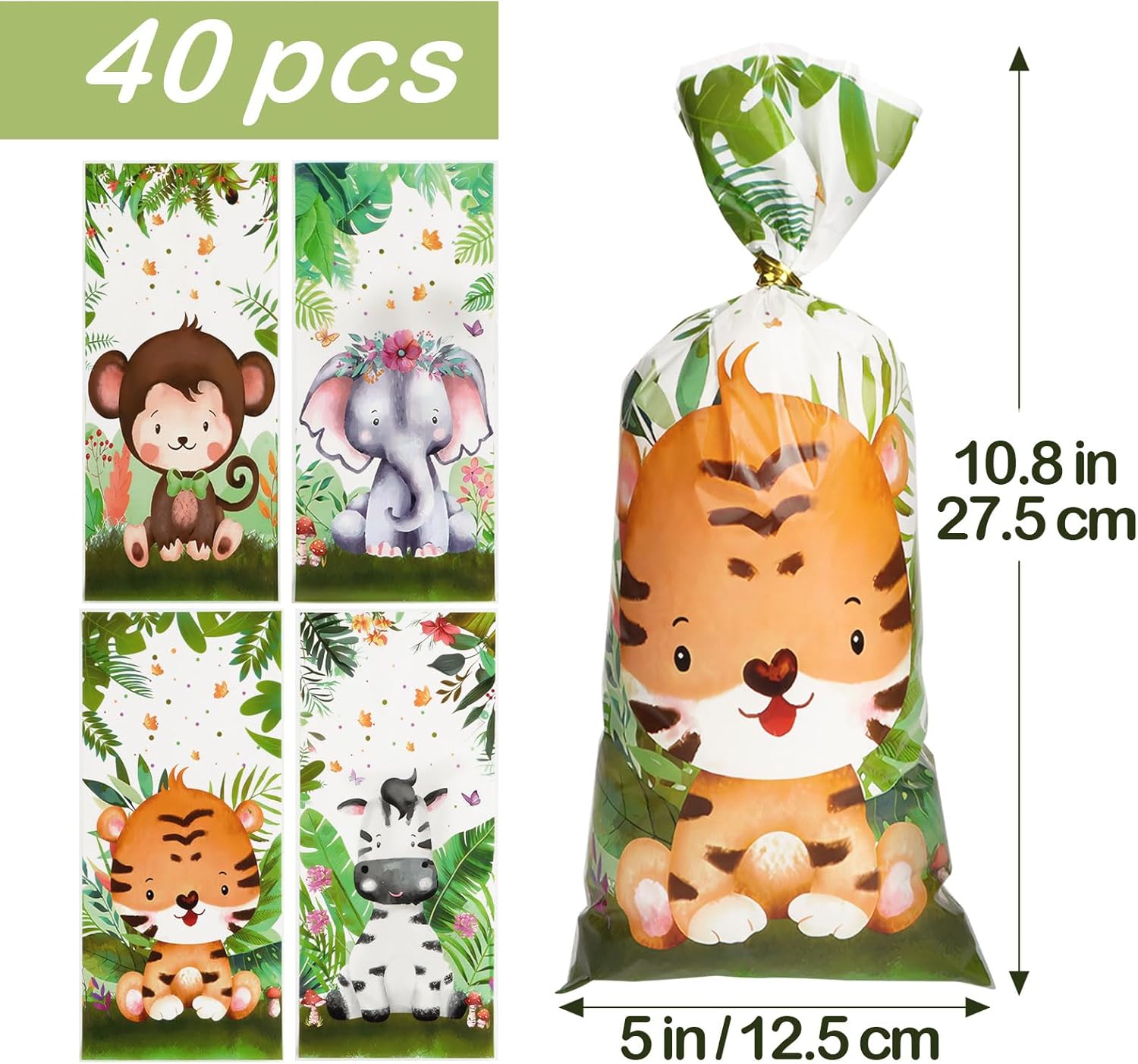 Confezione da 40 sacchetti regalo con 4 disegni della giungla, compleanno dei bambini, animali, sacchetti per dolci, sacchetti per caramelle, sacchetti per feste, sacchetti di cellophane, regali per il 1° compleanno, battesimo, nascita, festa.
