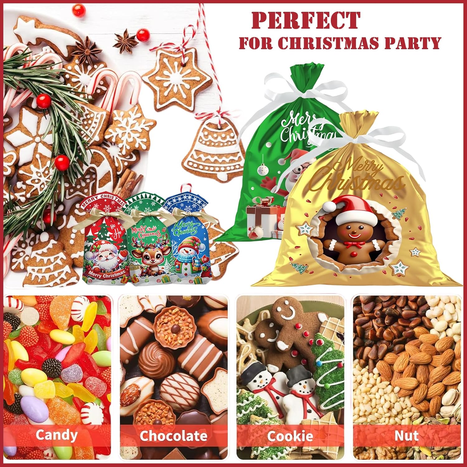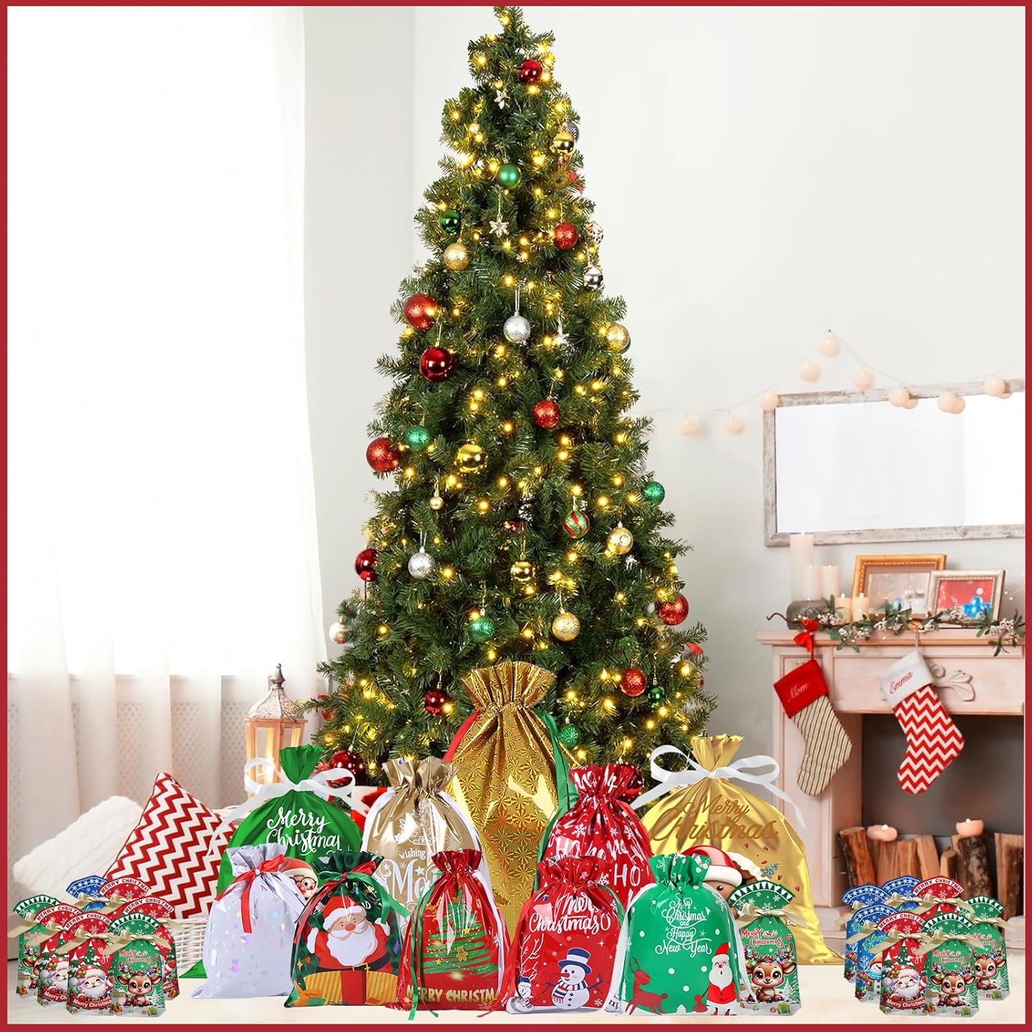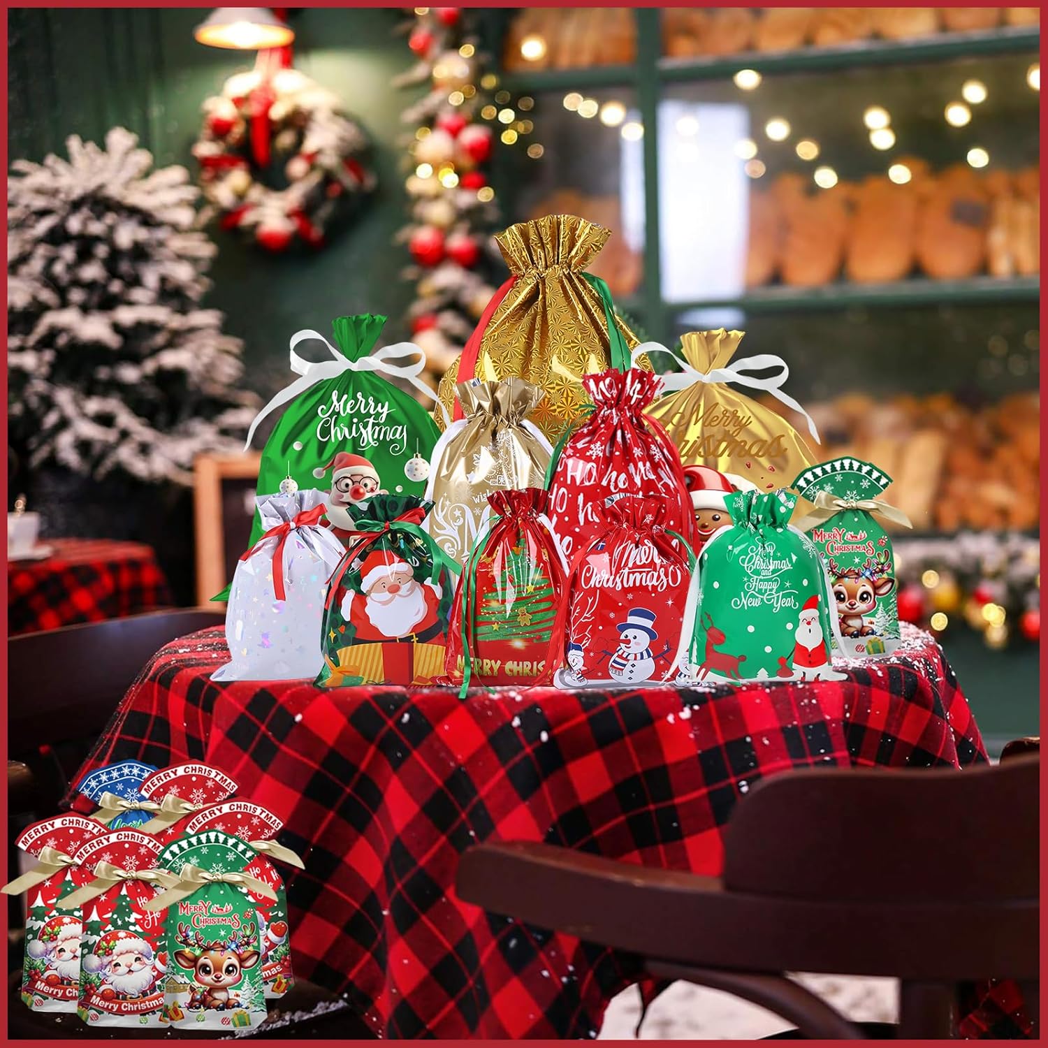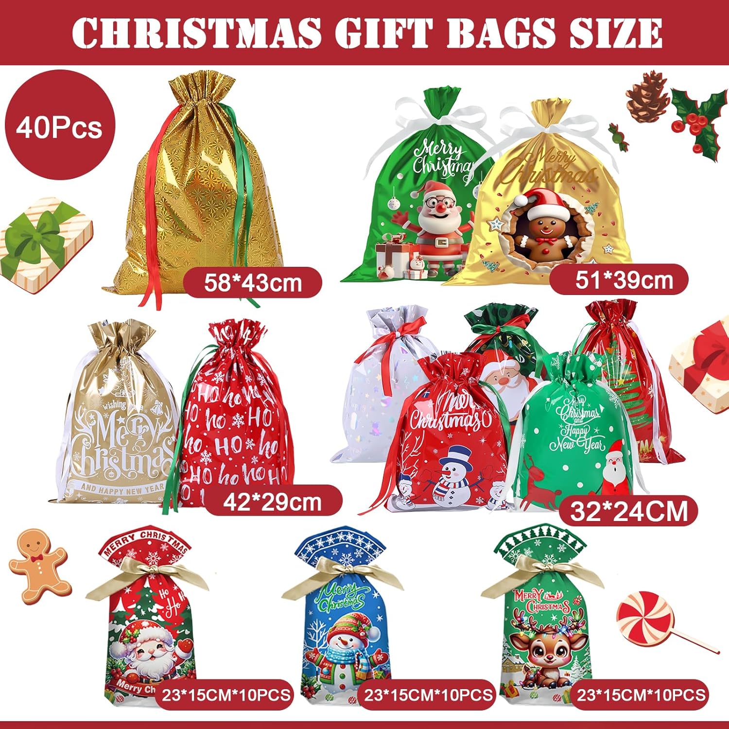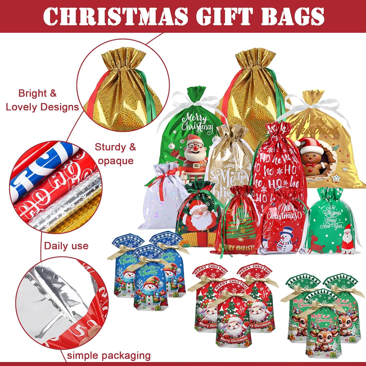 Materiale: il nostro sacchetto regalo natalizio in lamina è realizzato in plastica di alta qualità per garantire durata; A differenza dei sacchetti di carta, questi sacchetti regalo in plastica sono resistenti agli agenti atmosferici per garantire che il tuo regalo sia protetto; Forniscono una buona soluzione per confezionare regali durante il festival. Dimensioni grandi, medie e piccole: i sacchetti regalo in corda natalizia sono disponibili in 5 dimensioni, 12 in totale: 1 sacchetto regalo super grande (58x43 cm), 2 sacchetti regalo grandi (42x29 cm), 2 sacchetti regalo medi (32x24 cm), 30 sacchetti regalo piccoli (23x15 cm). I sacchetti regalo di diverse dimensioni con graziosi motivi natalizi stampati possono essere rapidamente confezionati con forme regalo particolari, ideali per confezionare regali di Natale, regali di festa, ecc. Elementi natalizi classici: questi sacchetti natalizi sono progettati con elementi classici natalizi per aggiungere un'atmosfera più divertente e festosa alle tue vacanze; Belle e pratiche, queste borse aumenteranno il fascino del tuo regalo e lo renderanno speciale. Borsa in corda natalizia: la borsa in corda natalizia ha una fascetta all'apertura, che è facile da chiudere e aprire per proteggere gli oggetti interni ed evitare oggetti. Dotato di bellissimo nastro per aiutarti a riporre rapidamente i tuoi articoli e darti un bellissimo prodotto finito Multiuso: ideale per avvolgere pane, biscotti, caramelle, prodotti da forno, snack, popcorn, caramelle, caramelle, ecc.; I sacchetti di caramelle natalizi non sono adatti solo per confezionare biscotti, dolci, pasticcini, ciambelle fatti in casa, ma anche per Natale, feste di compleanno, regali nuziali, matrimoni, San Valentino, Pasqua, lauree e molto altro!