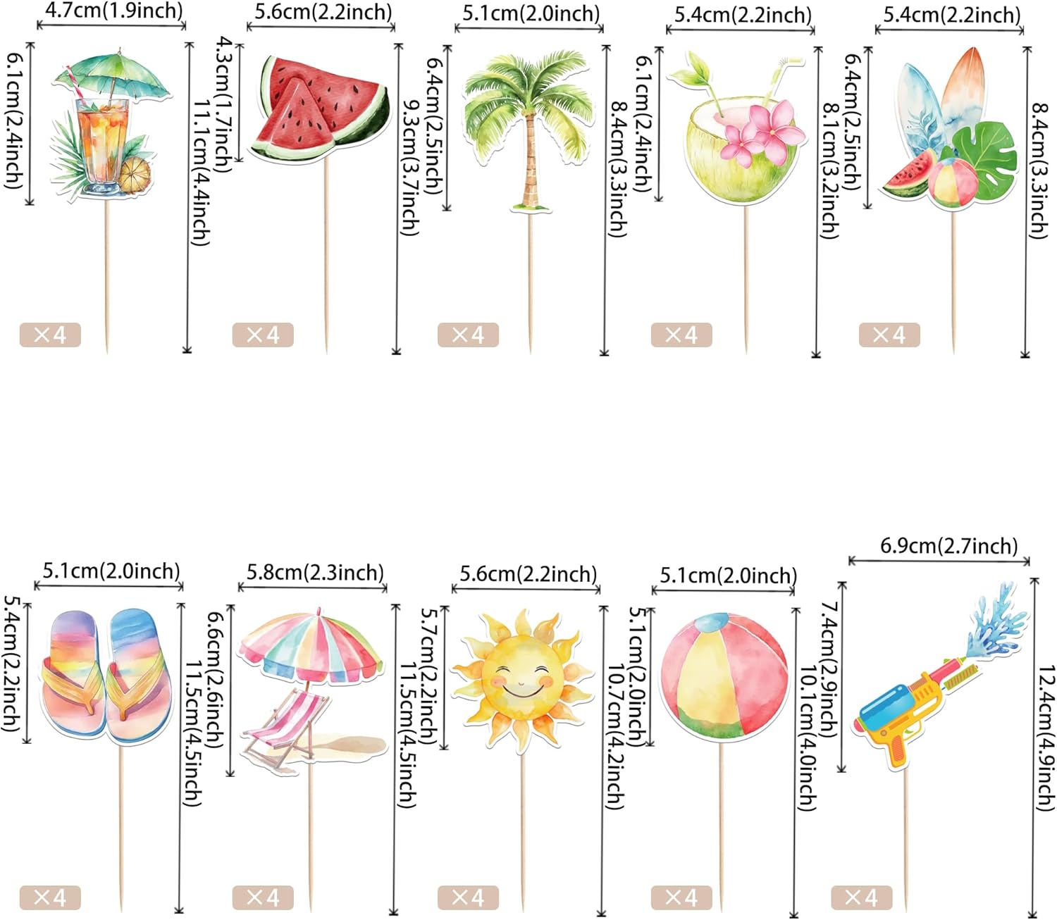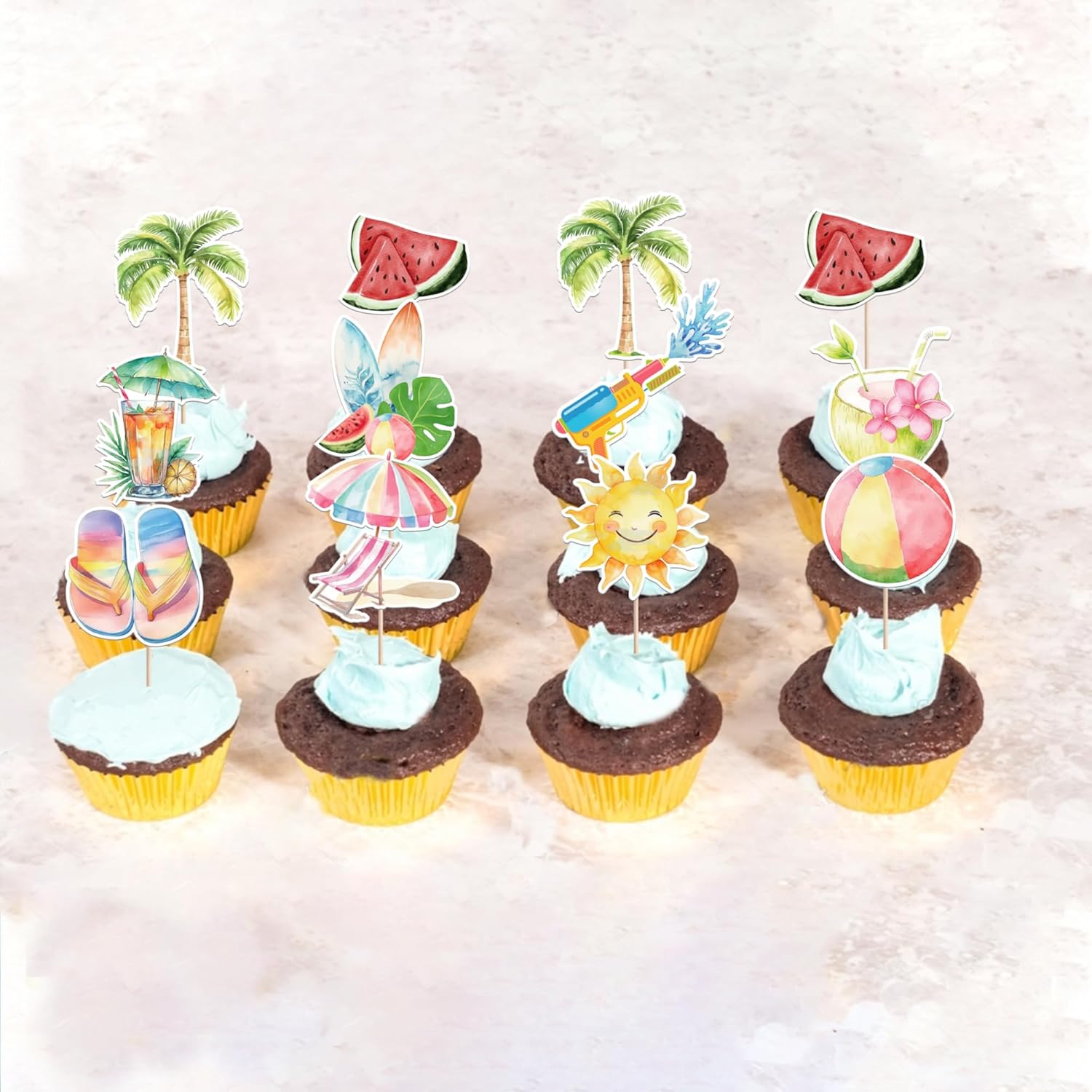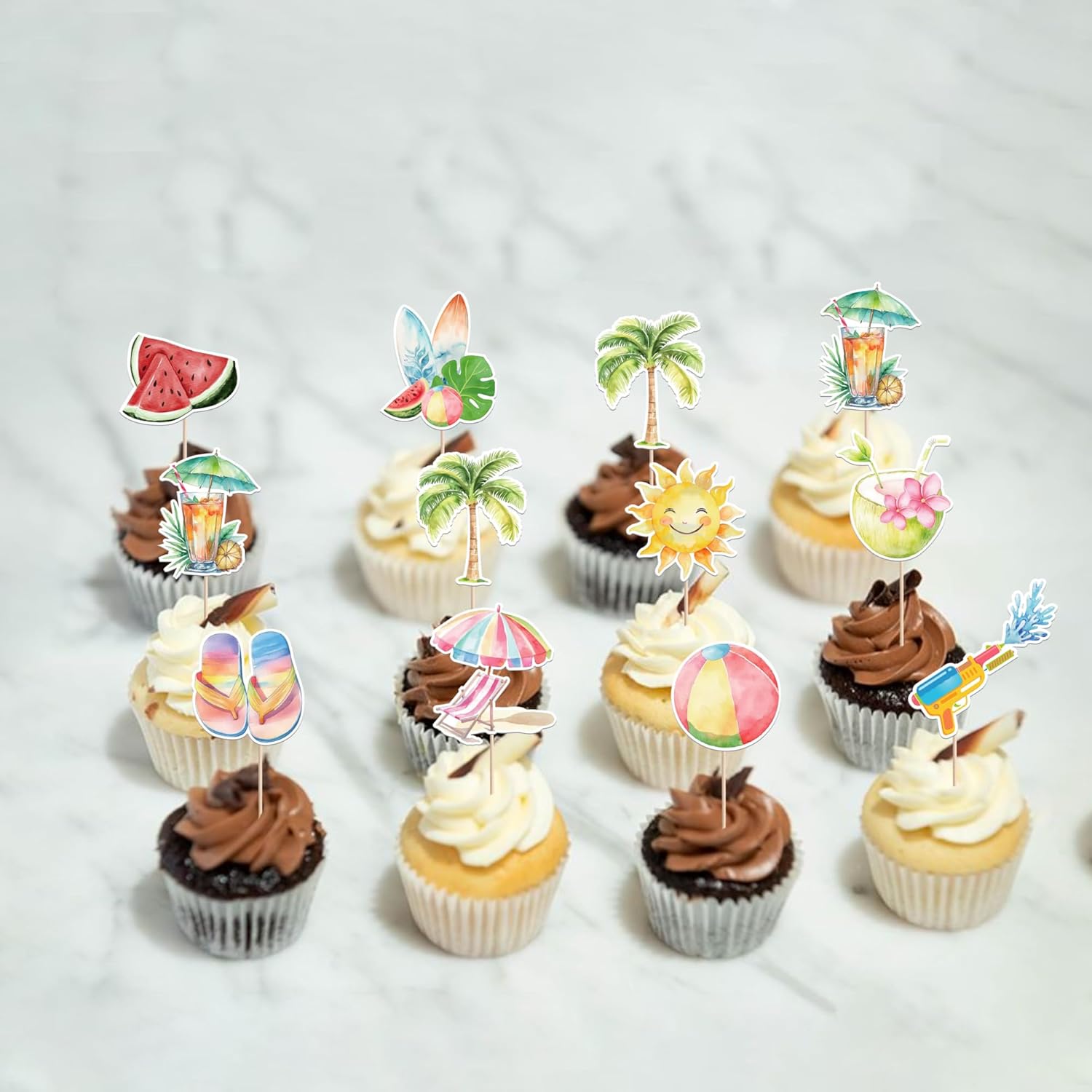 Confezione e dimensioni: include una confezione da 40 toppers cupcake estivi da spiaggia. Questi nuovi e graziosi plettri per cupcake aggiungono più divertimento. La dimensione è (compreso il bastone). Ampie applicazioni: questi toppers per cupcake sono così carini e perfetti per feste a tema estivo sulla spiaggia, feste a tema hawaiano, feste a tema natalizio, feste a tema di compleanno e decorazioni per cupcake. Sono una buona decorazione e rendono il tuo cupcake più attraente e interessante. Puoi anche usarli per gelati, frutta, biscotti e altri dessert. Materiale premium: questi toppers per cupcake sono realizzati in cartoncino glitterato di alta qualità da 300 grammi. Sono molto sicuri per cupcake, biscotti, torte, frutta, biscotti, gelati e altri dessert. NON fai da te: questi toppers per cupcake sono preassemblati, quindi puoi inserirli nel tuo cupcake immediatamente dopo averli ricevuti, il che può farti risparmiare tempo. Memoria! Questi toppers per cupcake sono stampati su entrambi i lati e presentano motivi su ciascun lato. È solo a scopo decorativo, non è commestibile e NON utilizzare nel forno o nel microonde.