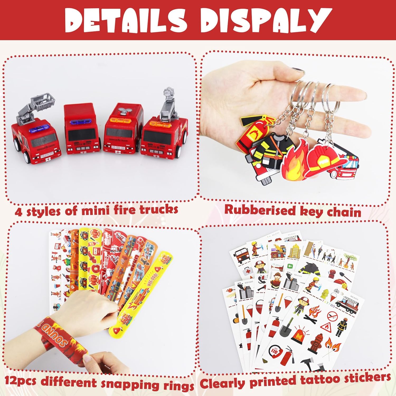 【Accessori per feste di fuoco da 48 pezzi】 Il nostro set include 12 mini giocattoli per camion dei pompieri rossi, 12 adesivi per tatuaggi antincendio, 12 portachiavi antincendio, 12 braccialetti schiaffo, l'intero gioco è molto carino e tutti gli accessori sono apprezzati dai ragazzi. 【Tema pompiere】 Tutte le bomboniere per bambini pompiere sono progettate con un tema pompiere. Le bomboniere dei pompieri hanno una grafica chiara, vivace e bella, e il design personalizzato fa risaltare le bomboniere per i piccoli ospiti, rendendole regali ideali per i bambini. 【Materiali di alta qualità】 Il set di giocattoli antincendio è realizzato con materiali di alta qualità e il set è ricco e diversificato. L'auto è mini e carina, la stampa degli adesivi è chiara e luminosa, il portachiavi e il braccialetto con fibbia del camion dei pompieri hanno bordi lisci, ben fatti e resistenti e la dimensione è perfetta per i bambini. 【Regalo perfetto】 I regali a tema dei vigili del fuoco sono ricchi e vari, interessanti e pratici, puoi regalarli ai tuoi amici o fan, quando apri il regalo e vedi che è il loro regalo preferito, i tuoi amici o fan saranno molto sorpresi quando riceveranno il regalo, è un regalo squisito e perfetto. 【Ampiamente usato】 Ideale per feste di compleanno per bambini, feste decorative a tema autopompa, feste scolastiche, decorazioni di compleanno, riempimenti di sacchetti regalo, regalo perfetto per i bambini che amano i vigili del fuoco o sognano di essere un eroe.