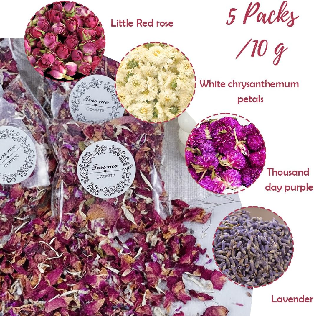 Petali naturali: realizzati con petali naturali di rosa, crisantemo bianco, amaranto, lavanda e altri, non contengono sostanze chimiche nocive, sono ecologici e possono essere degradati naturalmente dopo l'uso. Che si tratti di organizzare matrimoni, decorare feste o di utilizzarli in modo creativo ogni giorno, potrete godervi l'atmosfera romantica senza preoccuparvi dell'impatto ambientale. Applicabile a molteplici scene: questo tipo di coriandoli a forma di petalo ha una vasta gamma di utilizzi. Ai matrimoni può essere utilizzato come coriandoli per creare un'atmosfera sognante e romantica per gli sposi; alle feste, può essere utilizzato per la decorazione della tavola e per abbellire i regali per aggiungere gioia e raffinatezza Confezione raffinata: è confezionato in un sacchetto trasparente sigillato, attraverso il quale si possono vedere chiaramente i petali colorati all'interno, rendendo comoda la scelta intuitiva. Ogni sacchetto è confezionato singolarmente per facilitarne il trasporto e la conservazione, impedendo ai petali di inumidirsi o di spargersi, consentendo di accedervi facilmente durante l'uso e mantenendoli asciutti e intatti. Colori intensi: è una miscela di vari petali naturali, tra cui rosso, bianco, viola, lavanda e altri colori. La combinazione dei colori è armoniosa e bella. Che venga lanciato in aria per formare una splendida pioggia di fiori o sparso sul tavolo come decorazione, può creare un ricco effetto visivo e migliorare immediatamente lo stile dell'evento o della scena. Aroma gradevole: contiene petali di rosa, lavanda e altri petali con aroma naturale, che emanano una fragranza elegante e affascinante, che può aggiungere un'atmosfera piacevole alle tue attività o al tuo spazio. Utilizzarlo durante matrimoni, feste e altre occasioni non solo può portare piacere agli occhi, ma può anche creare un'atmosfera calda e romantica attraverso la fragranza, lasciando un'impressione profonda e meravigliosa sui partecipanti.
