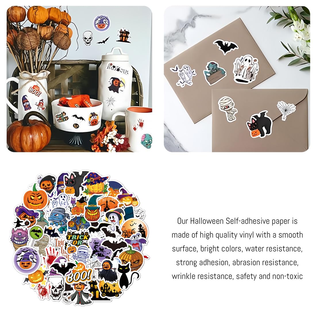 MATERIALI DI QUALITÀ: adesivi di Halloween realizzati con materiali di alta qualità, nessun residuo, nessun inquinamento, riutilizzabili, non lascia danni o colla. Un modo semplice per decorare la tua casa con i fantasmi di Halloween. Elementi di Halloween: pipistrelli, castelli, zucche, fantasmi, gatti, mummie e così via. Quando decorerai le tue finestre, sarà come se tutti i fantasmi di Halloween fossero entrati in casa tua. La confezione contiene 50 adesivi di Halloween: ogni foglio ha dimensioni e disegni diversi e gli elementi di Halloween in ogni adesivo sono sufficienti per decorare oggetti in tutta la stanza. Design fai-da-te che desideri utilizzare per le feste. Adesivi di Halloween FACILI DA USARE: pulisci le finestre e la polvere con un asciugamano umido, stacca gli adesivi di Halloween dalla carta da forno e attacca gli adesivi di Halloween su oggetti lisci. Gli adesivi di Halloween aderiscono grazie all'elettricità statica a superfici lisce e prive di adesivo e possono essere rimossi facilmente e senza lasciare residui. APPLICAZIONE VERSATILE: adesivi ideali per finestre, vetri, porte, specchi e altre superfici in vetro, perfetti per feste di Halloween e decorazioni domestiche di Halloween. Può essere applicato anche a decorazioni per feste come la tazza per l'acqua della scatola di prugne natalizie.