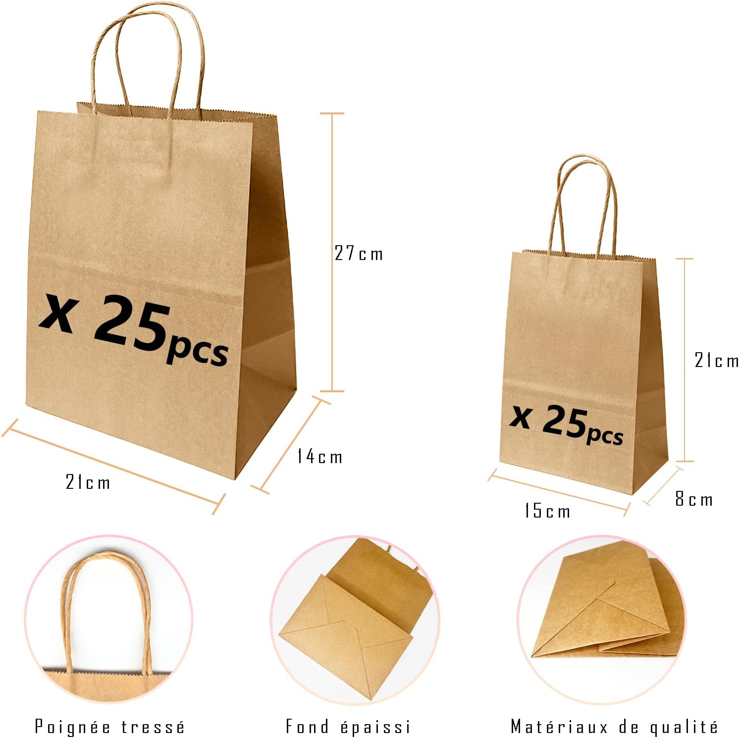🍒 Dimensioni dei sacchetti di carta: Grande: 27 x 21 x 14 cm Piccolo: 21 x 15 x 8 cm; Questi sacchetti di carta ecologici con manici sono perfetti per lo shopping quotidiano, le occasioni speciali o come eleganti confezioni regalo. Ideale anche in viaggio per trasportare comodamente i tuoi acquisti 🍒 Sacchetti di carta kraft di qualità con manico: i nostri sacchetti di carta sono realizzati in carta kraft marrone naturale e non contengono sostanze nocive. Sono estremamente resistenti e possono essere riutilizzati più volte, il che rappresenta affidabilità e consapevolezza ambientale 🍒 Una confezione da 50 in 2 dimensioni: scegli il nostro set di sacchetti di carta di alta qualità e ottieni una pratica versatilità: 50 pezzi in 2 diverse dimensioni. Perfette per soddisfare le tue esigenze quotidiane di borse della spesa in modo flessibile 🍒 Buste di carta grandi marroni: le nostre borse di carta con manici sono realizzate in robusta carta kraft e la robusta maniglia intrecciata garantisce una lunga durata. Il design del fondo più spesso consente di riporre facilmente oggetti pesanti 🍒 Applicazioni versatili: questi sacchetti di carta kraft di alta qualità offrono un'eccellente sensazione al tatto e sono ottimi sacchetti per la spesa, caramelle o regali per la famiglia e gli amici. Possono essere utilizzate anche come borsa da vendita o da asporto. La semplice funzione fai-da-te consente perfetti progetti di artigianato creativo e personalizzazione delle borse regalo