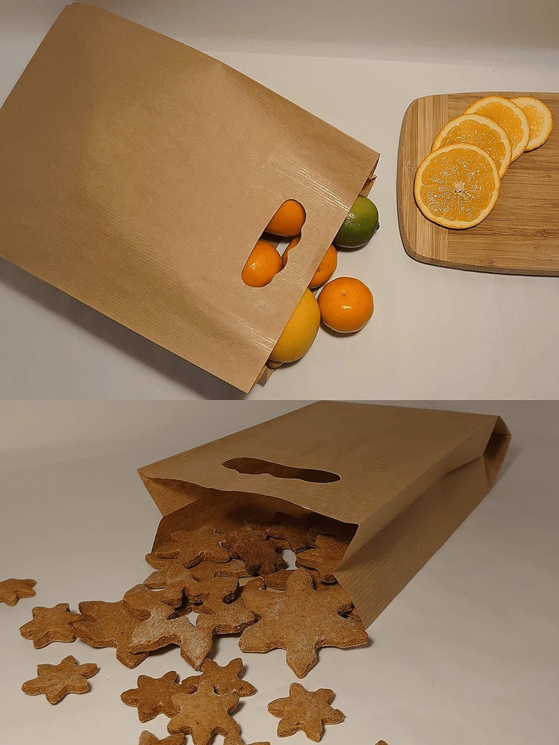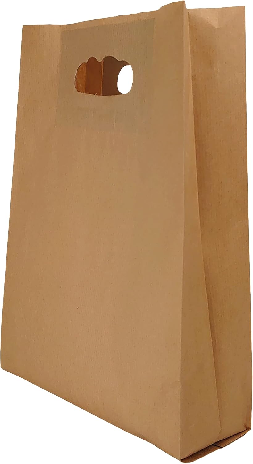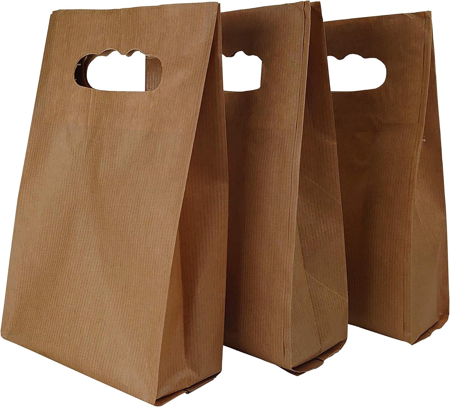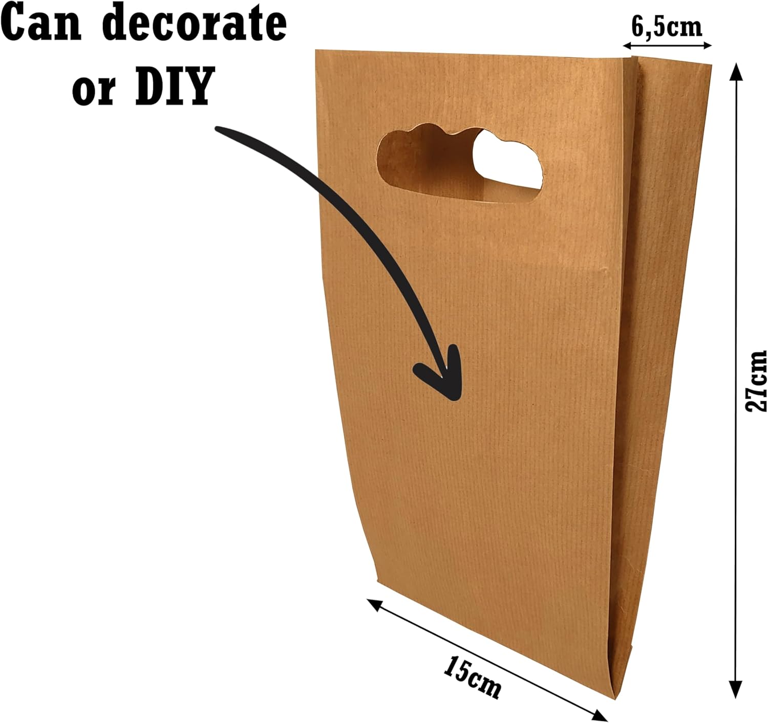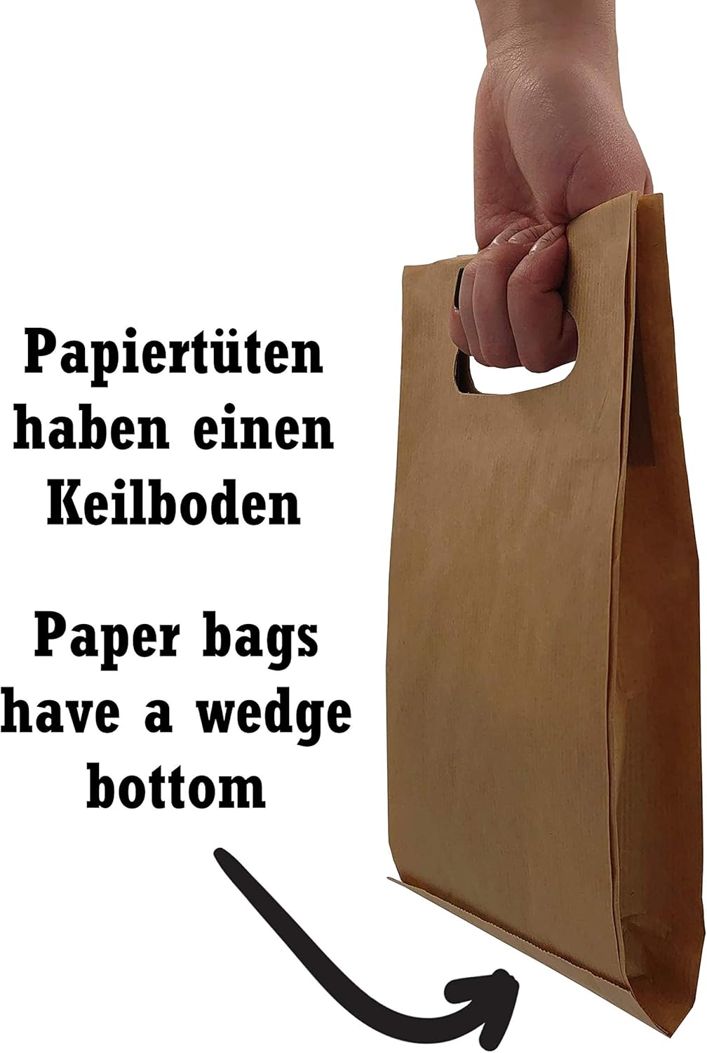 Busta di carta con apertura con manico dimensioni 15 x 27 x 6,5 cm 50 g/m2 # I sacchetti di carta con maniglia hanno un fondo a cuneo che può essere modellato in un fondo piatto.