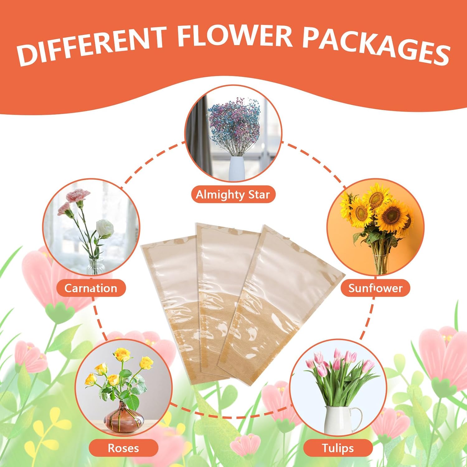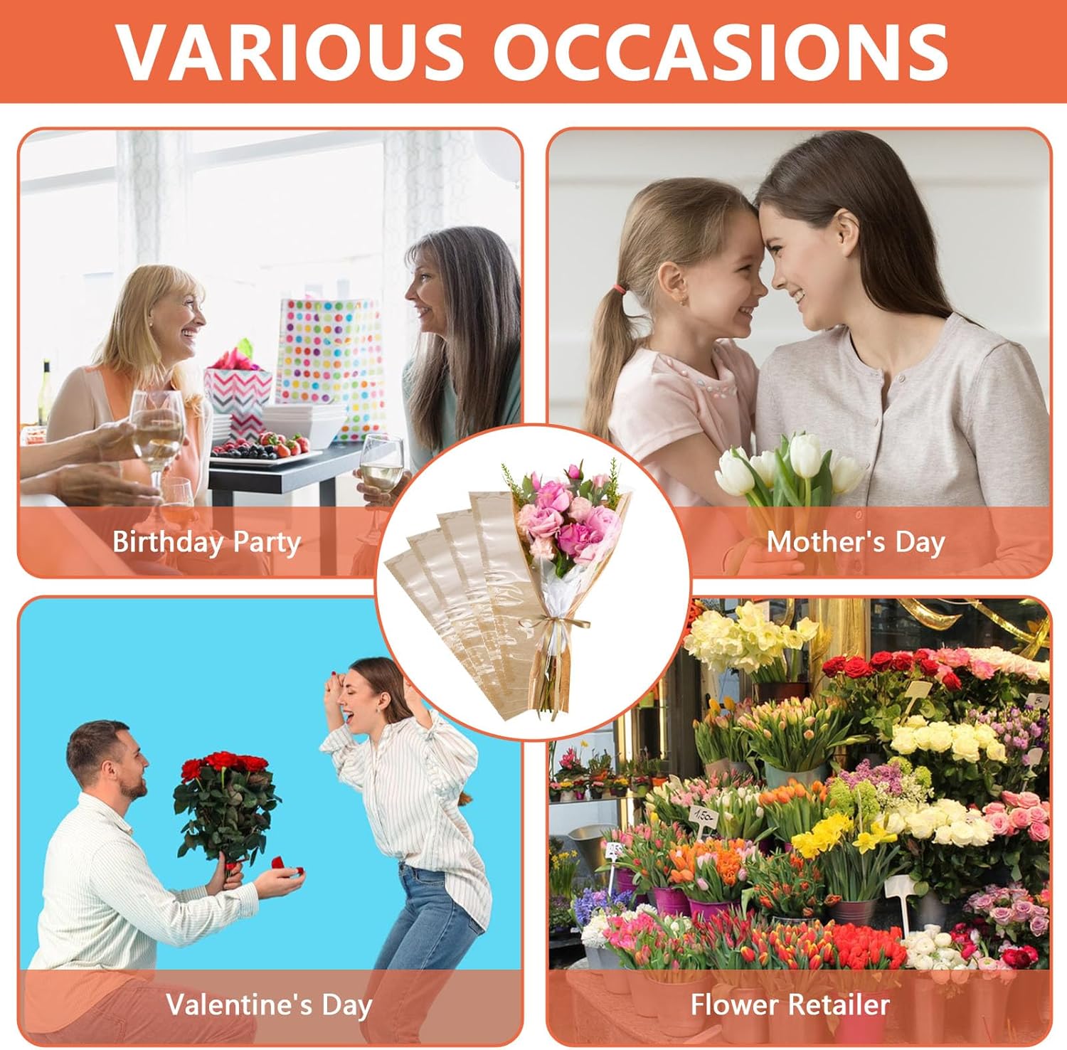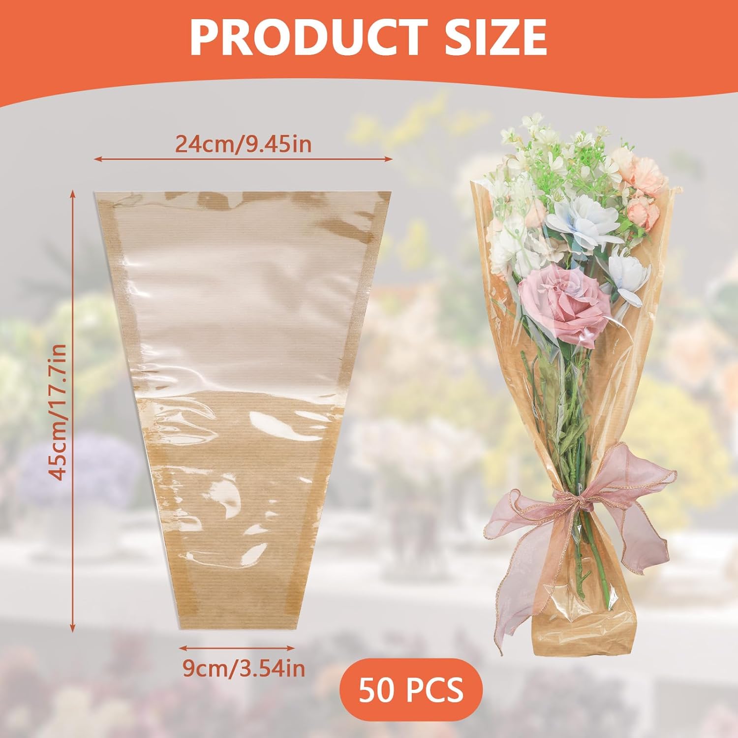 Dimensioni generose: ogni manica misura 45,5 x 25 x 10 cm, misura grande per avvolgere più fiori, lasciando abbastanza spazio per adattarsi perfettamente ai tuoi bouquet. Possono rendere i tuoi fiori più squisiti. Contenuto della confezione: riceverai un set di 50 buste per bouquet floreali, perfette per l'uso quotidiano o commerciale. Puoi usarli per creare bouquet individuali che possono essere messi in un vaso per dare alla stanza una bella vista. Facile da usare: la nostra carta floreale per bouquet è tagliata a forma trapezoidale con aperture nella parte superiore e inferiore, che facilitano la decorazione dei bouquet. La carta da regalo floreale è progettata per farti risparmiare tempo. Resistente e impermeabile: un lato è in carta marrone mentre l'altro lato è in cellophane trasparente. Il retro del nostro bouquet di fiori di carta marrone è spesso e robusto, mentre la parte anteriore in cellophane è impermeabile e trasparente. Varie occasioni di utilizzo: la nostra carta da regalo floreale per bouquet è una bellissima soluzione per esporre mazzi di fiori, può creare un'elegante esposizione di fiori al tuo matrimonio, laurea, cerimonia o cerimonia.