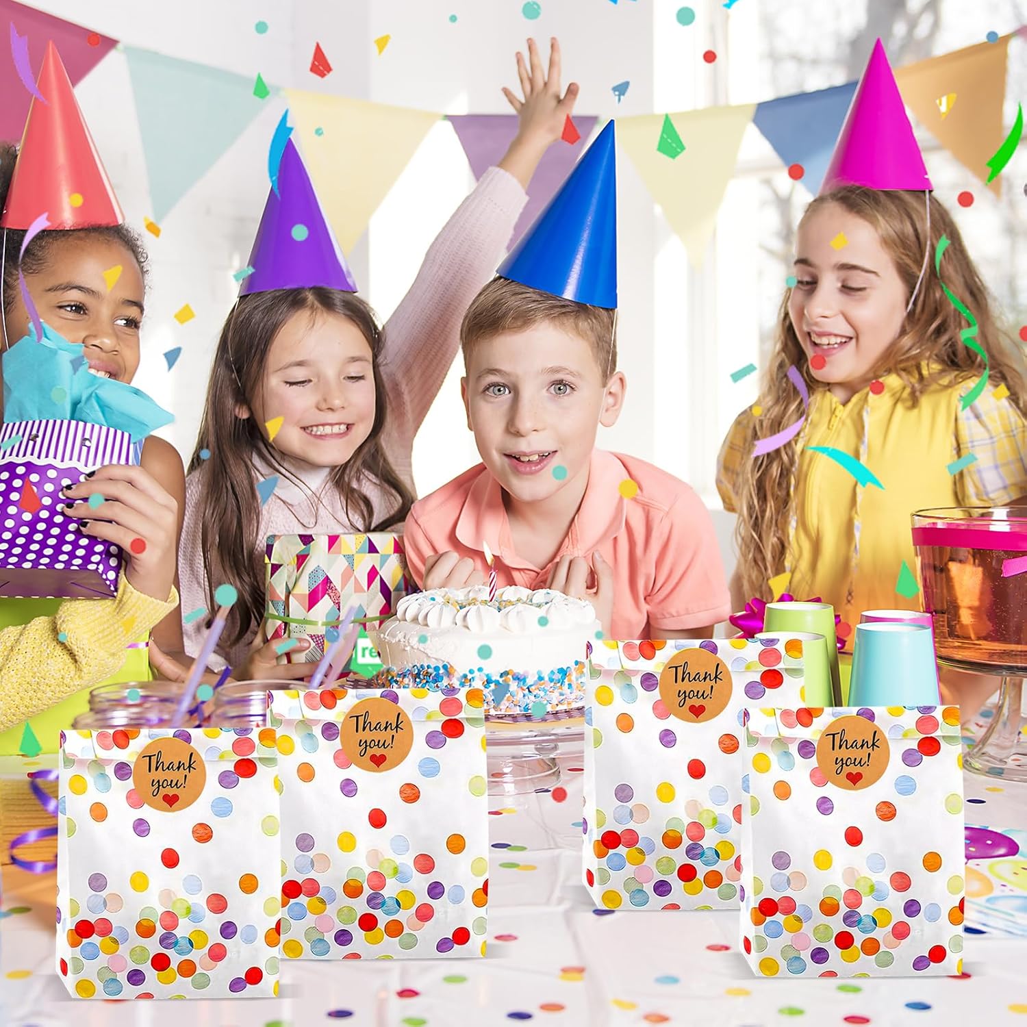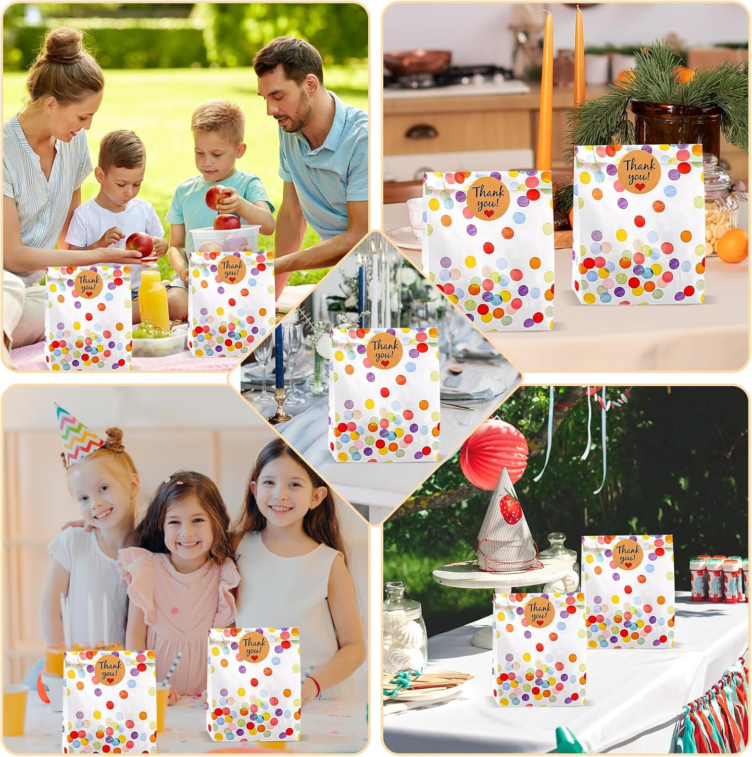 Set di sacchetti regalo: riceverai 50 sacchetti di carta per il compleanno dei bambini e 60 adesivi, le dimensioni sono: 19 x 13 x 3,5 cm / 5,71 x 4 x 1,05 pollici, il diametro degli adesivi è: 3,5 cm / 1,05 pollici, quantità abbondante e dimensioni adeguate possono soddisfare tutte le tue esigenze quotidiane Materiale di alta qualità: il sacchetto regalo è realizzato in carta kraft di alta qualità, l'interno è rivestito in laminato impermeabile e resistente all'olio, ecologico amichevole, non tossico, ecologico e biodegradabile Bellissimo design: i sacchetti per panini sono progettati con punti arcobaleno colorati, che conferiscono loro un aspetto carino e attraente. Il bordo dell'imboccatura della borsa è progettato in una forma umanizzata e frastagliata per evitare che le mani vengano tagliate. Adesivi adesivi: gli adesivi di ringraziamento hanno ottime proprietà adesive e possono chiudere molto bene i vostri piccoli sacchetti regalo e anche rendere belli e delicati i sacchetti regalo di compleanno dei vostri bambini con 60 adesivi. Ampiamente applicabile: i sacchetti di carta per il compleanno dei bambini possono essere utilizzati per confezionare torte, dolci, regali, biscotti, noci, popcorn, cioccolato, pane o altri piccoli oggetti. Ideale per compleanni di bambini, Halloween, Natale, feste, matrimoni, snack bar e altre occasioni