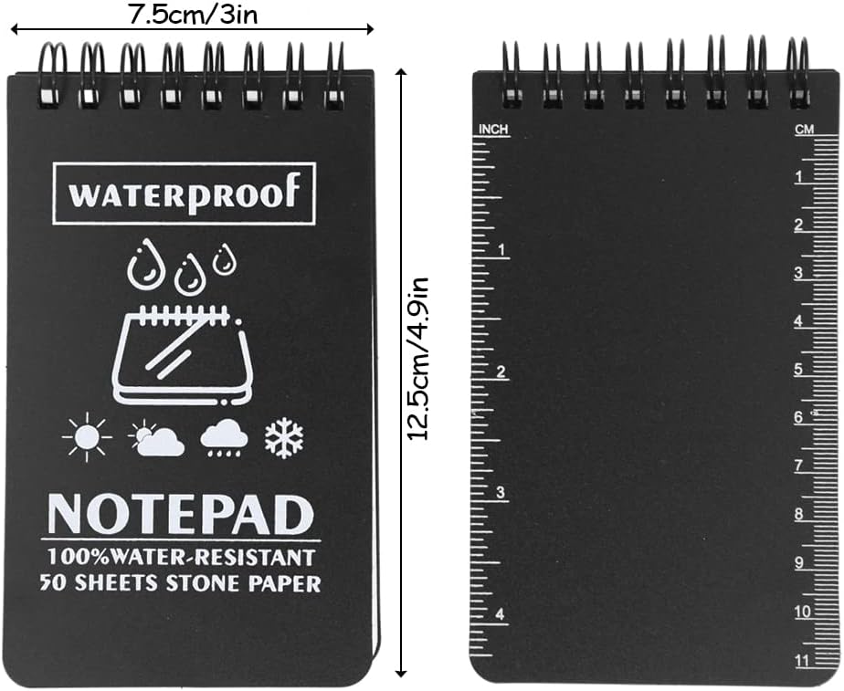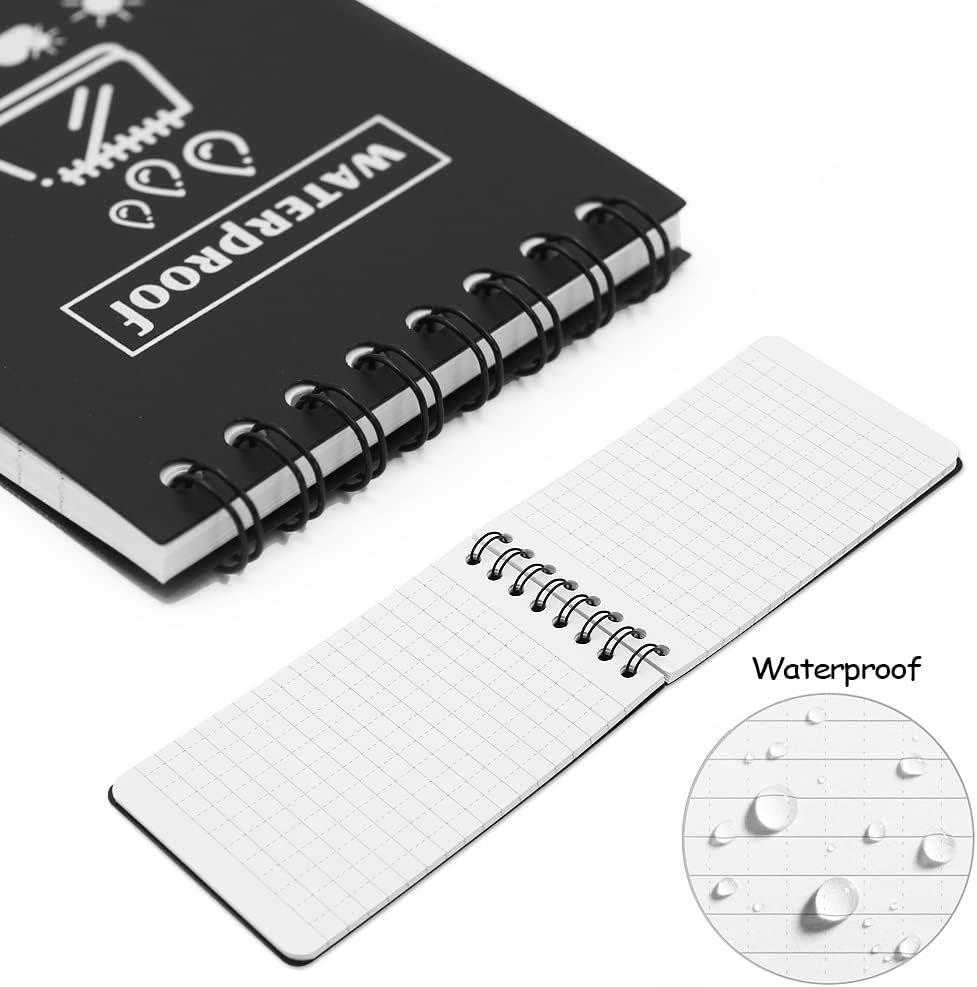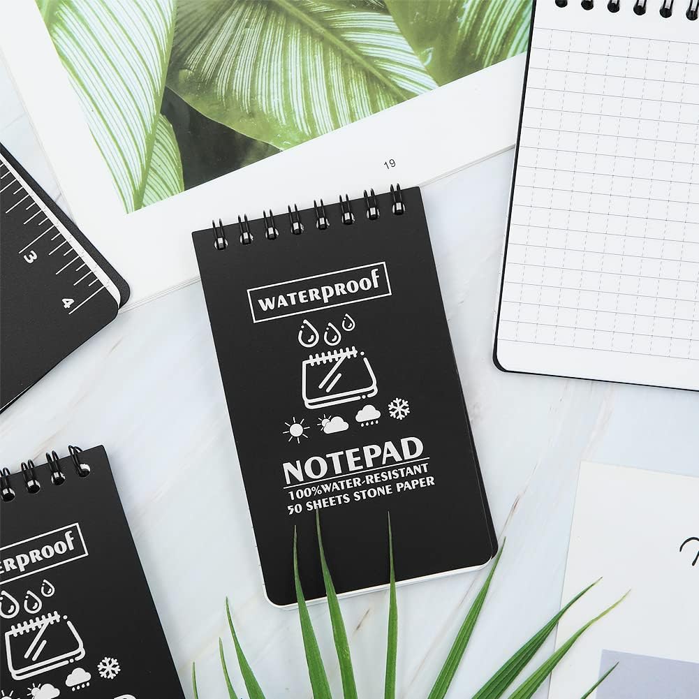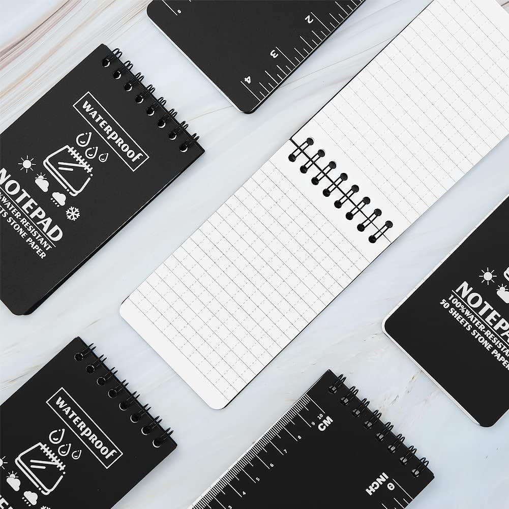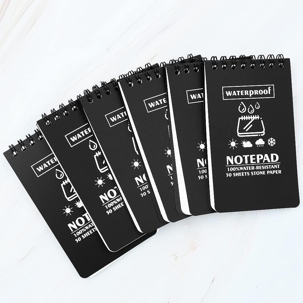 Taccuino piccolo: set di 6 taccuini portatili con copertina nera, ogni taccuino viene fornito con 50 fogli e righe standard per aiutarti a mantenere tutto organizzato e in pista. Mini taccuino formato A7,3 x 5 pollici/7,6 x 12,7 cm. Si adatta a tutte le tasche delle borse e delle camicie. Blocco note resistente alle intemperie: 100 pagine/50 fogli per blocco note tascabile. La carta resistente alle intemperie non si trasforma in poltiglia quando è bagnata e respinge l'acqua, il sudore, il grasso e il fango e sopravvive anche all'incidente accidentale del bucato. Assicurati che il tuo taccuino tascabile sia anche sotto la pioggia. Qualità e riciclabilità eccezionali: la copertura in PVC rigido e impermeabile protegge bene i taccuini interni. La carta di pietra all'interno è resistente, impermeabile e antipolvere. Usa una matita o una penna per tutte le stagioni e i tuoi appunti rimarranno intatti. Le penne a sfera standard funzionano quando la carta è asciutta. Gli inchiostri a base d'acqua si depositano sui fogli. Rilegatura WIRE-O: la rilegatura wire-o robusta e resistente agli urti rende impossibile la deformazione e la carta è flessibile. A differenza di un taccuino a spirale standard, Wire-O mantiene le pagine aperte allineate e intatte. Quaderni pratici: disponibili per matita o penna per tutte le stagioni e design a spirale per una facile registrazione. Perfetto da regalare, soprattutto agli studenti. Questi quaderni hanno molto spazio per scrivere. Ideale per riunioni d'ufficio, fiere, eventi aziendali, rientro a scuola, appunti sul campo, diari di viaggio e forniture per ufficio.