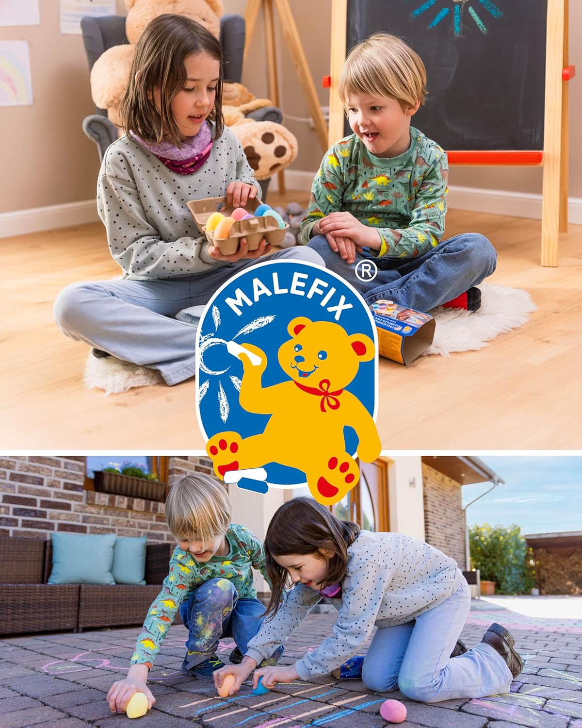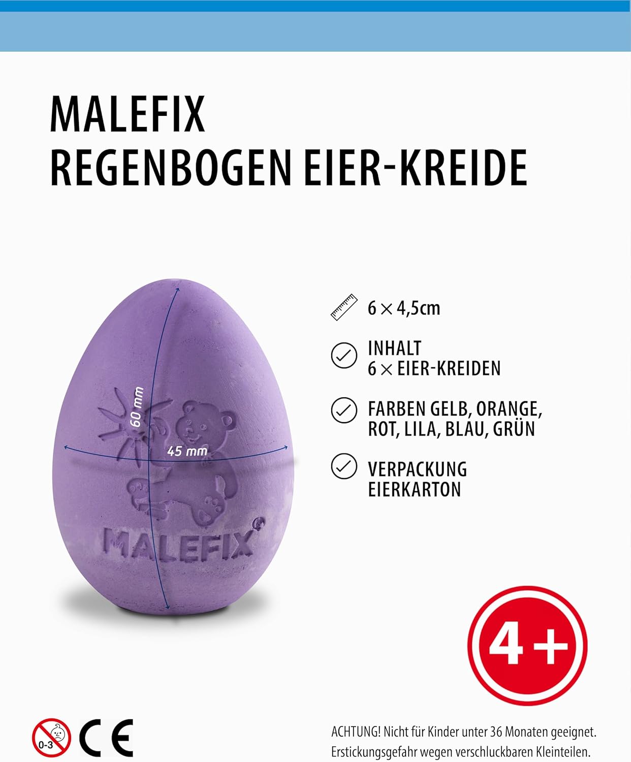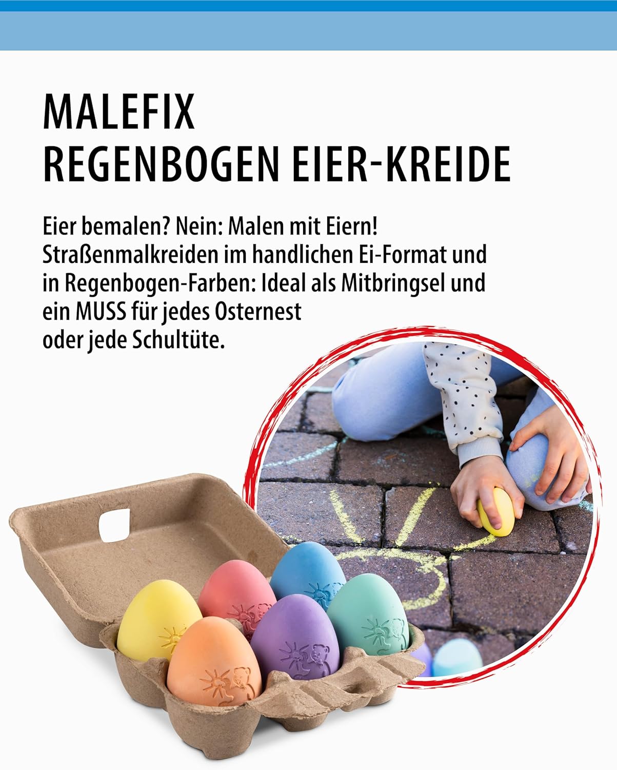 GIOIA DI COLORE CREATIVA TUTTO L'ANNO: i pastelli a uovo arcobaleno MALEFIX portano divertimento colorato nella pittura per bambini e adulti - perfetti per Pasqua e oltre. FORMA ERGONOMICA DELL'UOVO: Con una dimensione di ca. 6x4,5 cm, i gessetti si adattano particolarmente bene alla mano e consentono un disegno preciso e comodo. VERSATILE: ideale per marciapiedi, cortili, vialetti o cortili scolastici: progetta l'ambiente circostante con una fantastica arte con il gesso. CONFEZIONATO CON STILE: i sei pastelli colorati vengono consegnati in un classico cartone per uova, perfetto da regalare o conservare. RESISTENTE ALLE INTEMPERIE E FACILMENTE LAVABILE: il gesso aderisce in modo affidabile all'asfalto e alla pietra, ma può essere facilmente rimosso con acqua.