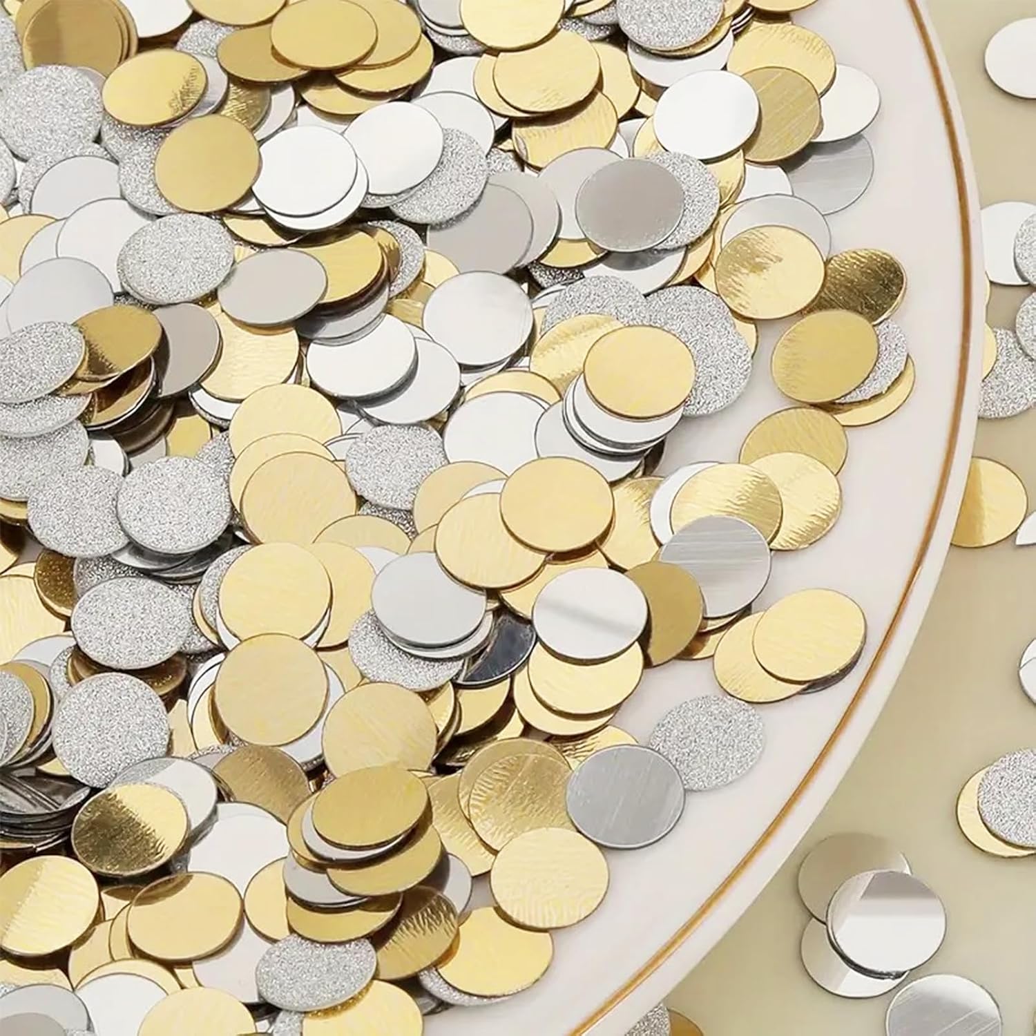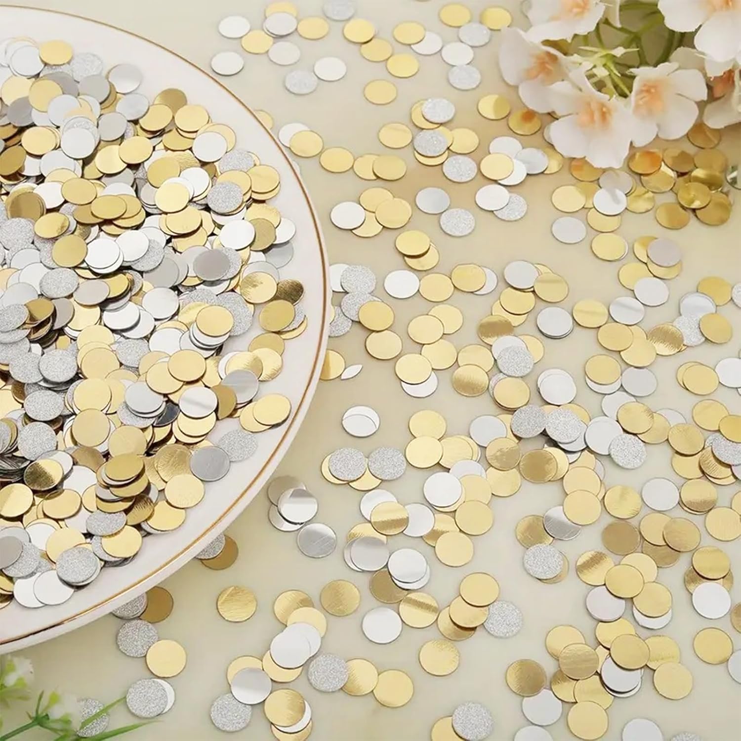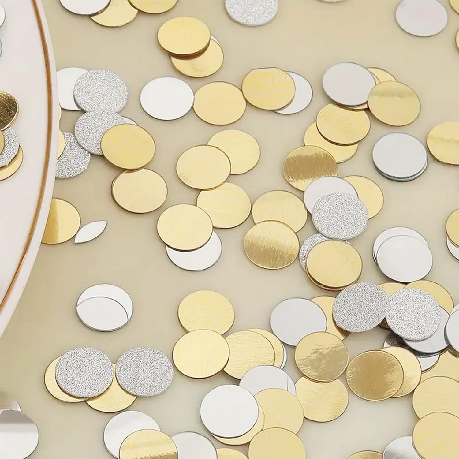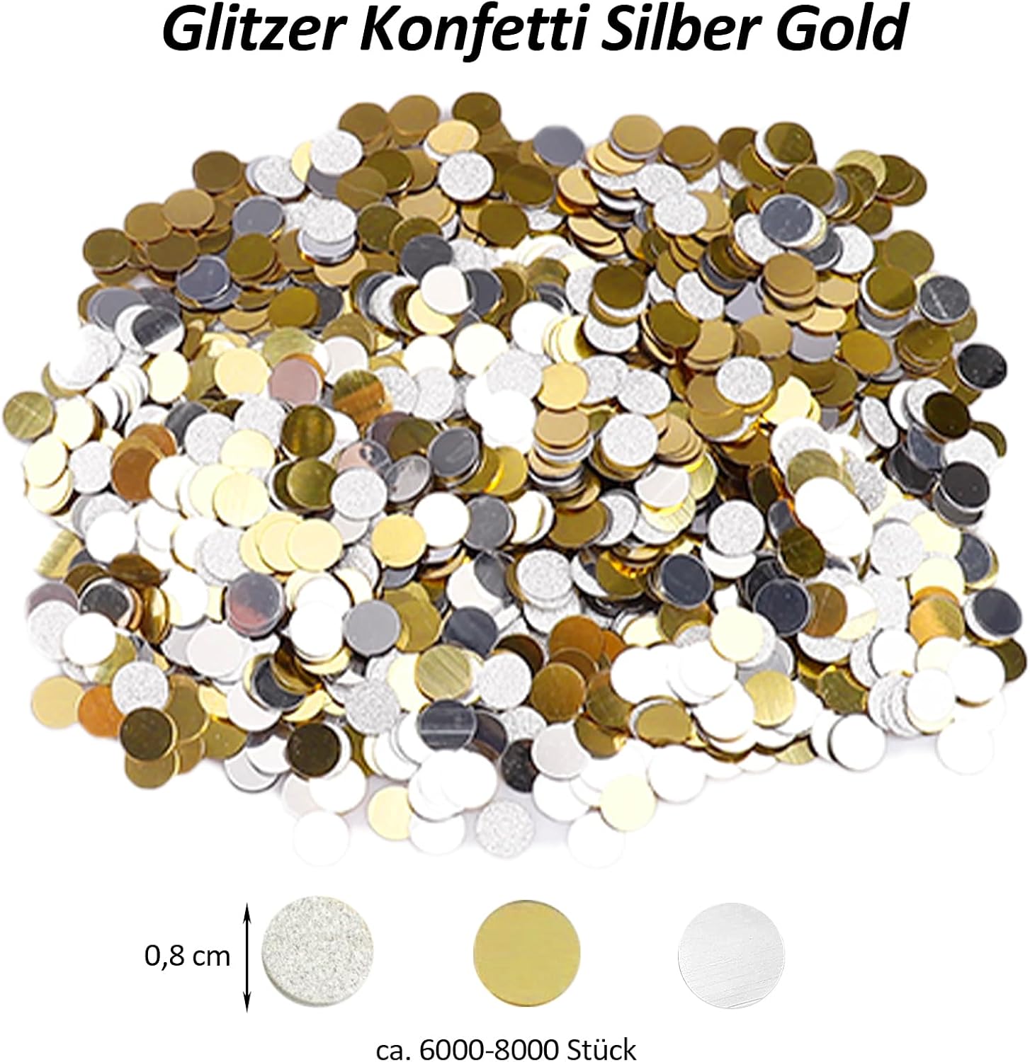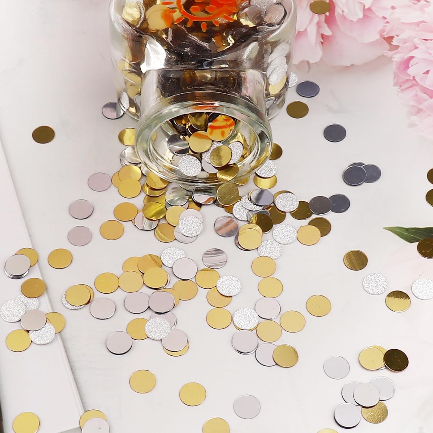 Coriandoli glitter di alta qualità - 6000 pezzi in oro e argento: il nostro set di coriandoli glitter Affivia contiene ca. 6000 pezzi di coriandoli rotondi in PVC da 8 mm, double face con effetto specchio ed effetto lucido. La combinazione di coriandoli oro e argento crea un elegante scintillio che valorizza con stile qualsiasi celebrazione. Che si tratti di coriandoli di compleanno, matrimonio, battesimo o fidanzamento, questi coriandoli glitterati sono la scelta perfetta per ogni matrimonio o decorazione della tavola di compleanno. Regala alla tua festa un'atmosfera lussuosa con coriandoli riutilizzabili e di lunga durata. Coriandoli versatili per ogni occasione: che si tratti di coriandoli di compleanno, decorazioni dorate da tavola per un matrimonio elegante o feste colorate come carnevale, Halloween o una festa di ritorno a scuola, i nostri coriandoli sono universali. Le scintillanti tonalità oro e argento sono perfette per Capodanno, Capodanno, Natale e per occasioni romantiche come proposte di matrimonio o fidanzamenti. Combina i coriandoli colorati con le stelle filanti pastello per creare composizioni da tavola creative e festive che attireranno sicuramente l'attenzione. Decorazioni da tavola ideali e decorazioni sparse - Forma rotonda da 8 mm: la pratica forma rotonda con diametro di 8 mm è ideale come coriandoli di compleanno, coriandoli di nozze o come scintillante decorazione da tavola dorata. Grazie al rivestimento double-face con effetto specchio e lucido, i coriandoli glitter riflettono la luce e creano un'atmosfera festosa su ogni tavola. Sia che li distribuiate liberamente sui tavoli dei coriandoli o li riempiate in palloncini trasparenti, i nostri coriandoli offrono versatili opzioni di decorazione e danno alla vostra festa un'attrazione scintillante. Complemento perfetto per feste ed eventi creativi: il set di coriandoli Affivia non è adatto solo come decorazione per la tavola di compleanno o come coriandoli per matrimoni, ma anche come highlight per idee creative fai da te. Usalo come decorazione per cartoline, confezioni regalo o per lavoretti con i bambini. Soprattutto durante la festa della mamma e la festa del papà, gli eleganti coriandoli dorati offrono un modo amorevole per rendere i regali ancora più festosi. Combinalo con coriandoli colorati e stelle filanti pastello per dare alle tue feste un aspetto generale unico e colorato. Atmosfera glamour per momenti speciali: date ad ogni occasione quel qualcosa in più: che si tratti di un matrimonio glamour, di un fidanzamento elegante, di un battesimo emozionante o di un Capodanno esuberante e di festeggiamenti di Capodanno. Con i nostri coriandoli glitterati in oro e argento puoi creare un ambiente elegante che delizierà gli ospiti. I pregiati coriandoli si possono combinare perfettamente con altri elementi decorativi e rendono la vostra festa indimenticabile. Ideale per momenti romantici come una proposta di matrimonio o occasioni festive come Natale, Halloween e feste di rientro a scuola