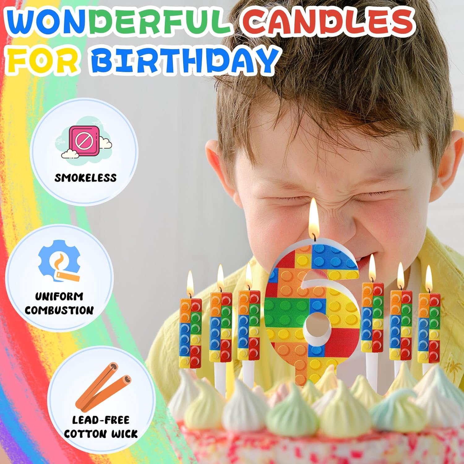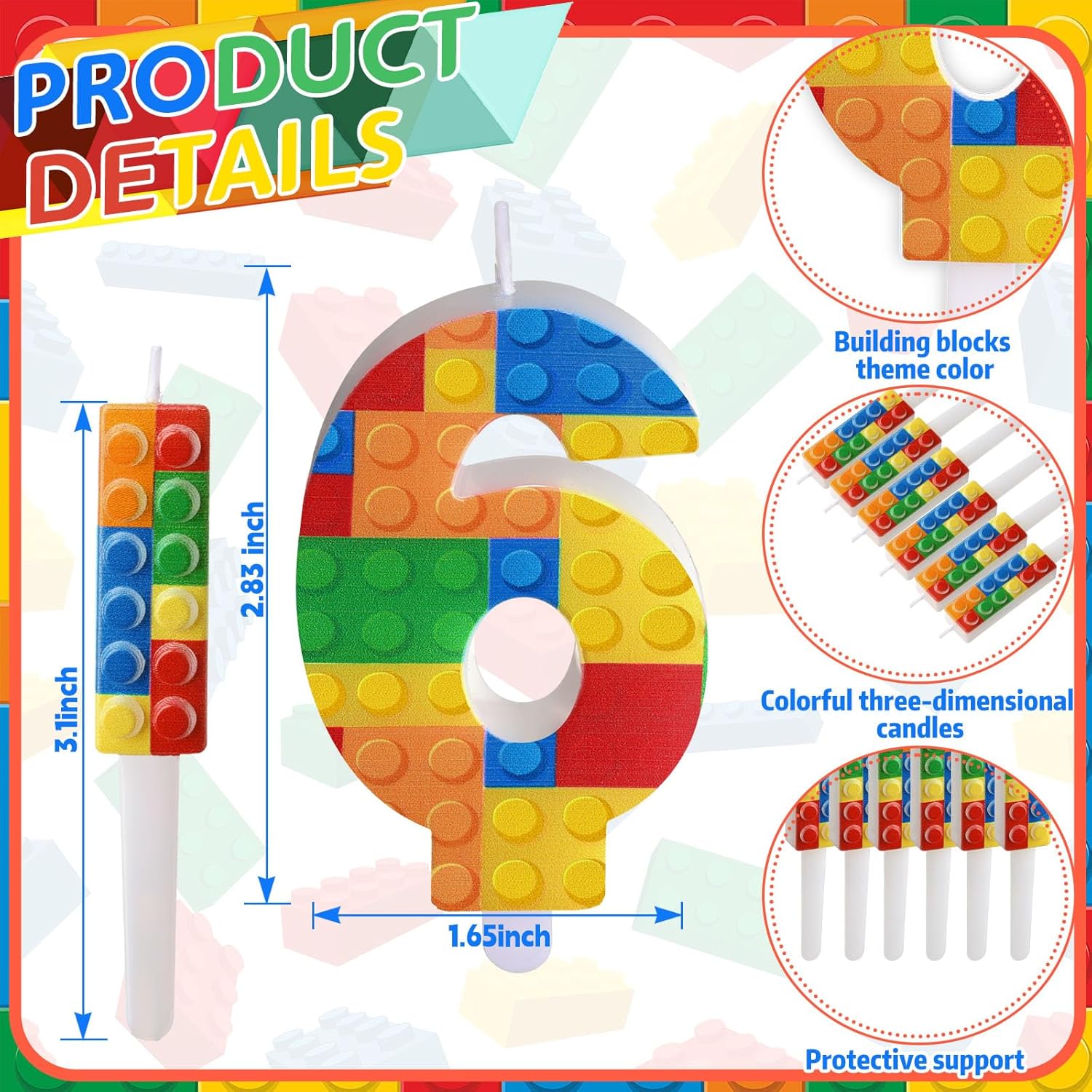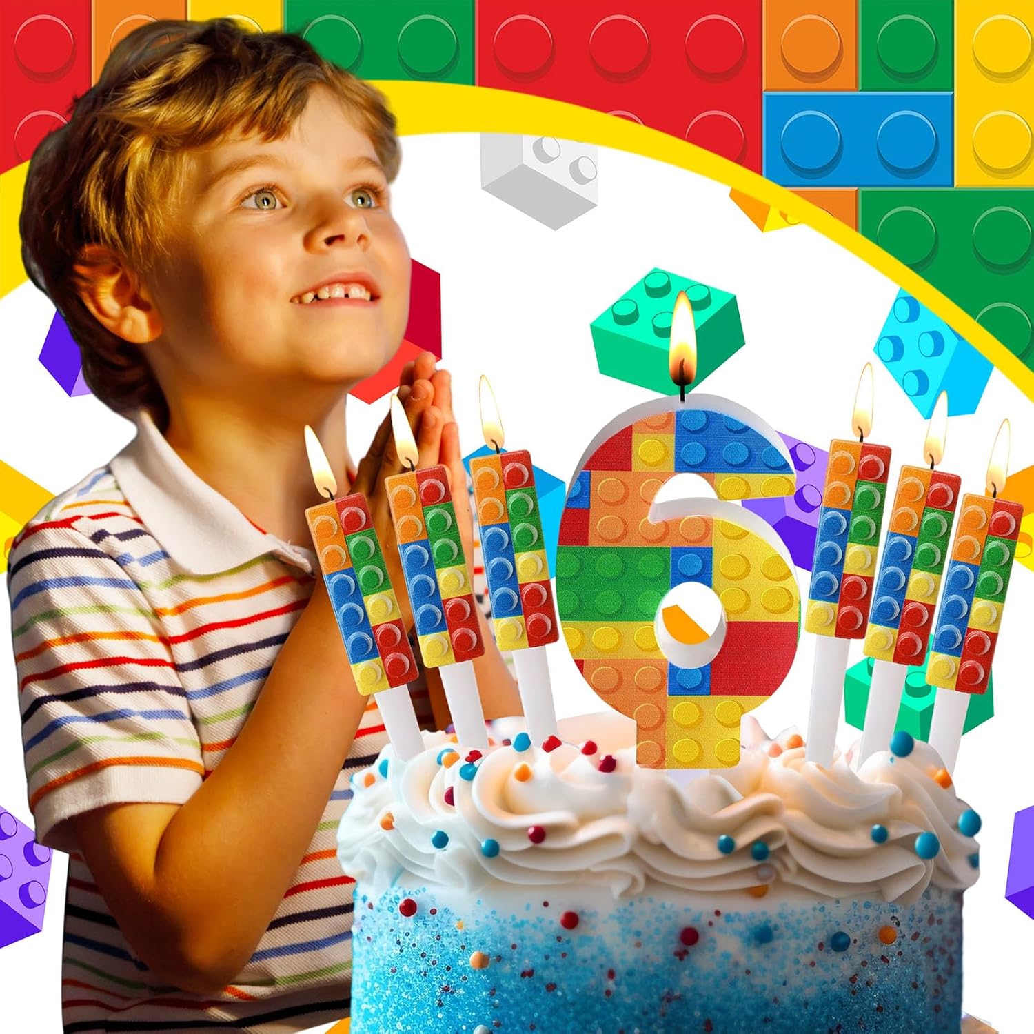 Design innovativo: il nostro set di candele di compleanno con numeri di blocchi digitali utilizza una combinazione di superfici tridimensionali e piatte. La superficie della candela è spruzzata con vernice, affidabile e di alta qualità, delicata e raffinata, facile da inserire e accendere, brucia in modo uniforme e uniforme. Dimensioni ideali: riceverai 1 pezzo di candela con numero di blocco da costruzione, ca. 2,8 x 1,7 pollici e 6 pezzi di candeline per torta con mattoncini, ca. 1,9 x 0,6 pollici. Si prega di confermare la dimensione necessaria prima di ordinare. Puoi usare la tua immaginazione e creatività per decorare una festa unica per i tuoi bambini e scattare loro foto perfette. Ampia gamma di usi: le candele numeriche con mattoncini sono adatte per molte celebrazioni come feste di compleanno, feste a tema con mattoncini, baby shower e decorazioni per anniversari e possono creare un momento gioioso e indimenticabile per te. Confezione squisita: il set di candele con mattoncini è confezionato in una scatola di plastica semplice e raffinata, che è una buona scelta per uso personale e regali. Un colorato mattoncino per candele per feste che può essere utilizzato come decorazione per feste di compleanno per ragazzi e ragazze. Nota: non lasciare le candele accese incustodite e tenerle fuori dalla portata dei bambini. Si prega di conservare le candeline per torta in un luogo ombreggiato e lontano dal fuoco
