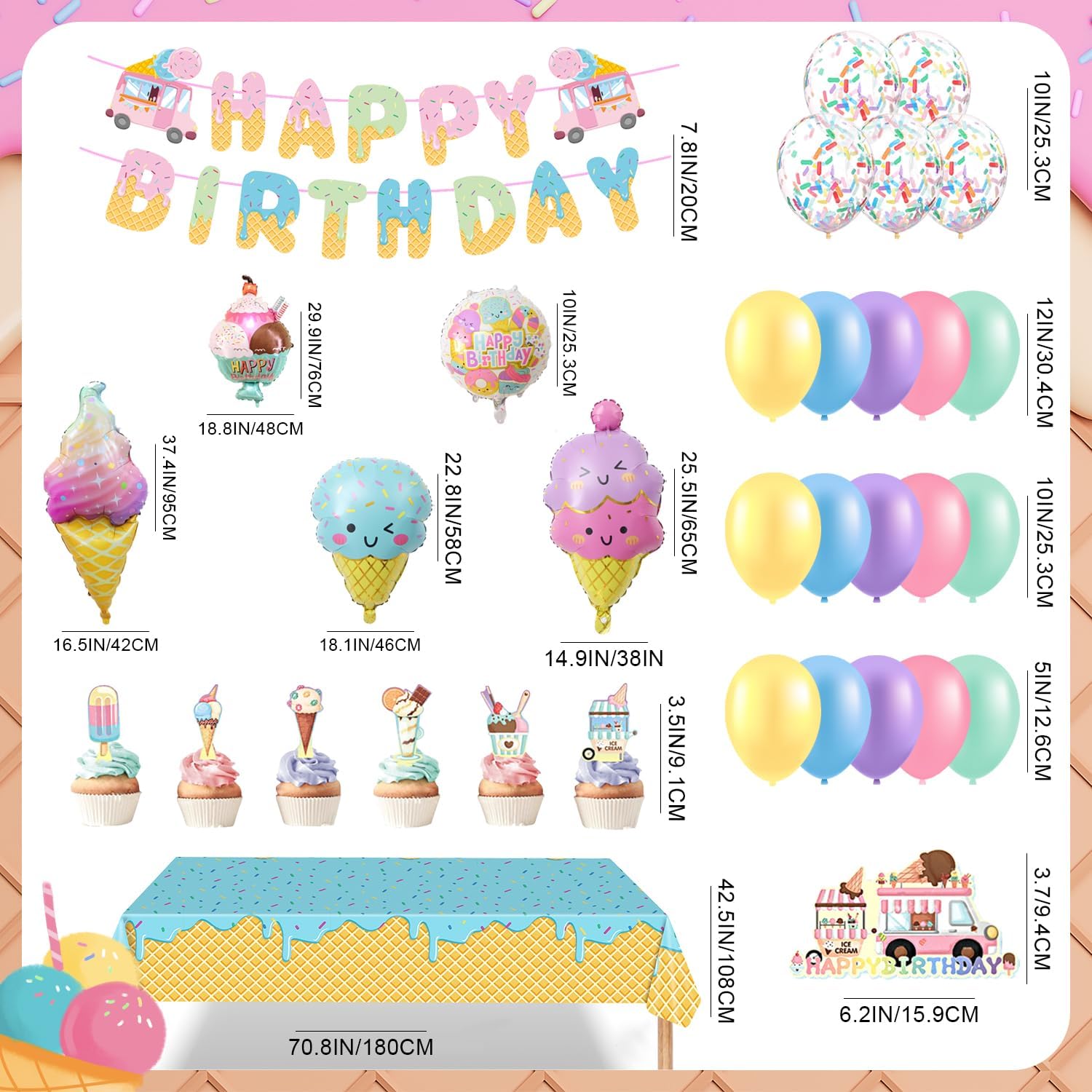 Decorazioni per la festa del gelato: quale bambina non ama il gelato dolce? Non perderti le nostre decorazioni per feste ghiacciate. Puoi ottenere 60 palloncini in lattice macaron (5"+10"+12"), 5 palloncini in alluminio per gelato, 12 toppers per cupcake gelato piccoli, 1 topper per torta gelato grande, 1 tovaglia per gelato (70" x 42"), 1 striscione di buon compleanno. I palloncini per gelato macaron color pastello renderanno meravigliosa la festa di compleanno dei tuoi bambini. Graziose decorazioni di compleanno: questi sfondi per il compleanno del gelato saranno sicuramente un successo per il tuo piccolo e i tuoi ospiti. Il design del dolce gelato con il colore macaron deve sorprendere il tuo bambino, sono adatti per una dolce festa di compleanno con gelato Decorazione facile da montare: lo striscione dolce e lo striscione gelato sono già assemblati, risparmia tempo quando decori la tua festa. I 12 piccoli toppers cupcake glitterati sono ben pre-incollati, non è necessario assemblarli, risparmiando tempo per l'uso, quindi devi solo appenderli dove vuoi decorarli, fuori in giardino o al chiuso per un tocco colorato. Alta qualità: lo striscione compleanno, lo striscione gelato e i toppers cupcake sono realizzati in materiale macaron. cartoncino di alta qualità; le grandi decorazioni di compleanno sono molto carine, sicure per la decorazione del cibo. Questi palloncini gelato sono fatti di lattice spesso, sicuri e durevoli, non facili da scoppiare. Se stai cercando decorazioni per la festa di compleanno della tua ragazza, il nostro prodotto è una buona scelta per rendere la tua festa più ordinaria