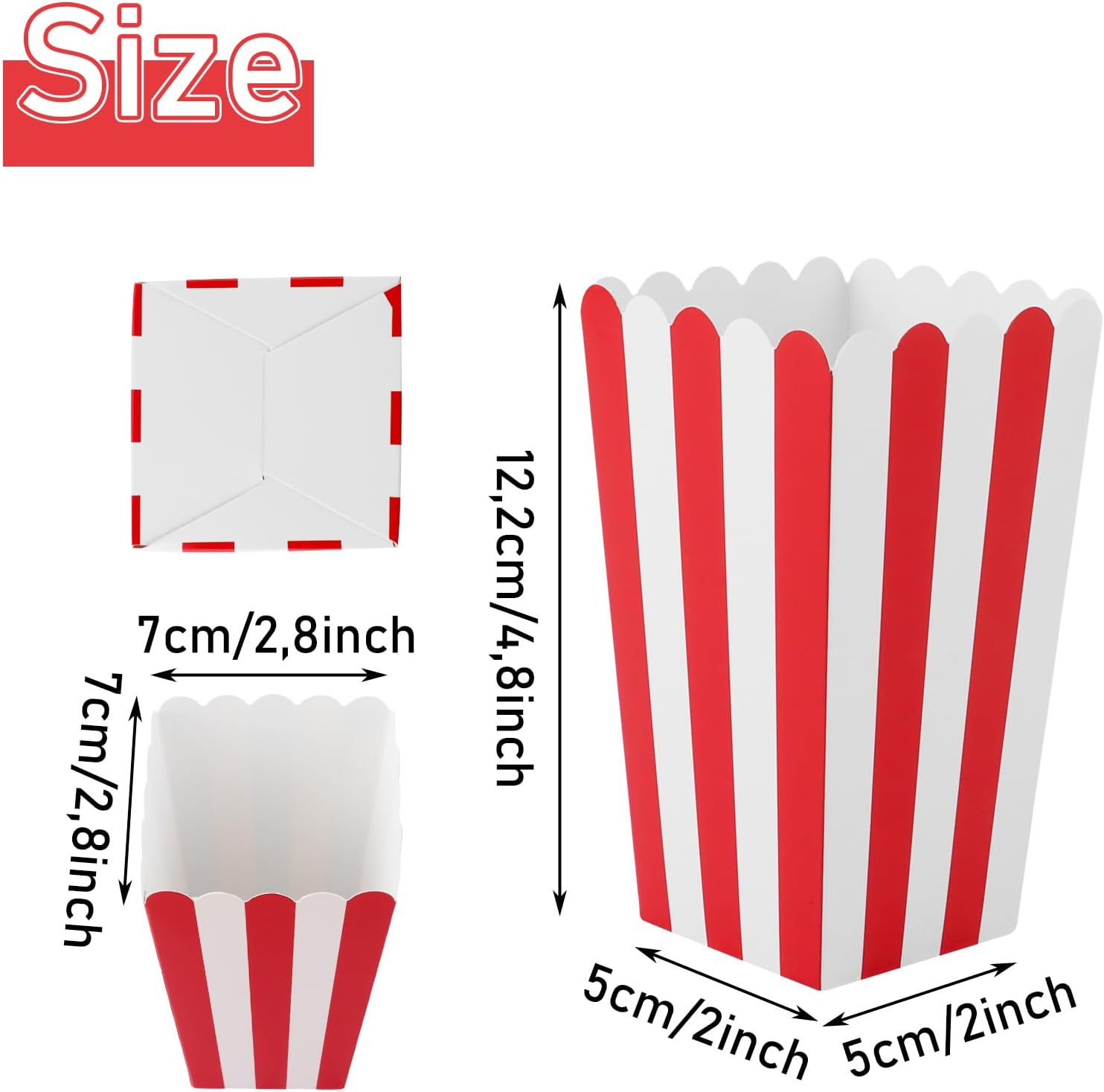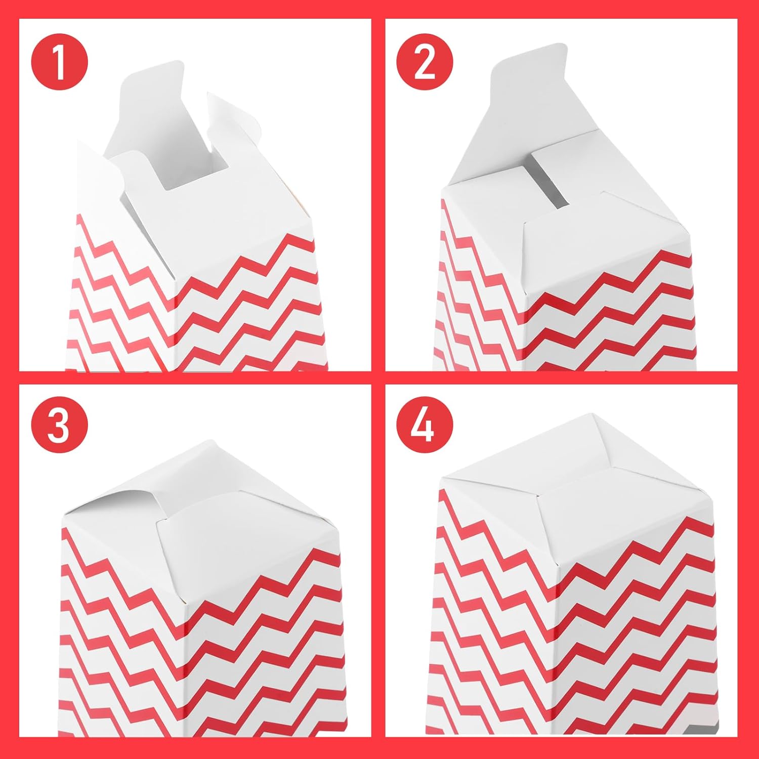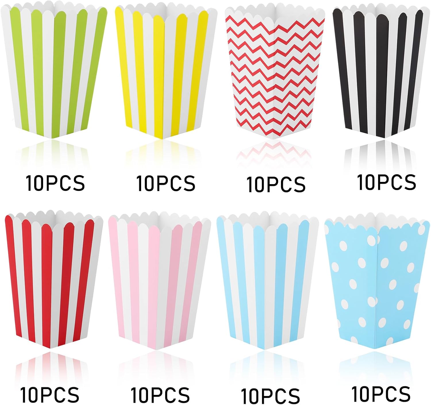 Il pacchetto include: sacchetti di popcorn da 80 pezzi; Dimensioni ridotte: 12x7x5 cm Vari colori e design: sono disponibili una varietà di colori diversi, una varietà di design diversi tra cui scegliere; il design quadrato della base rende la disposizione più stabile Materiali di alta qualità: i sacchetti di popcorn sono realizzati in cartone per alimenti, il materiale è spesso, l'olio non può fuoriuscire facilmente Facile da usare: la scatola di popcorn è facile da montare, bastano pochi passaggi per completare l'installazione; design pieghevole che occupa poco spazio Versatile: le scatole di popcorn possono essere utilizzate per popcorn, patatine, pollo fritto, snack, caramelle, biscotti, noccioline, ecc.