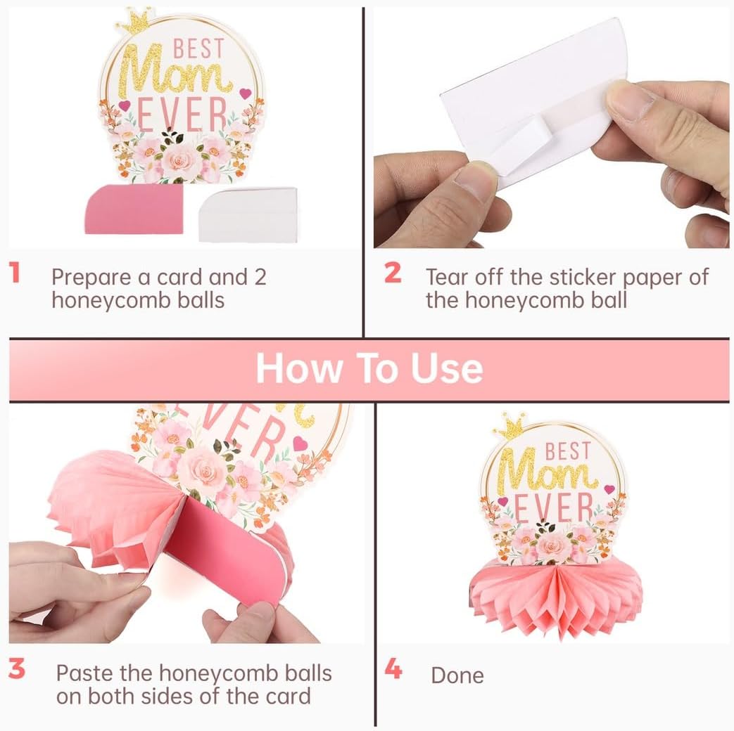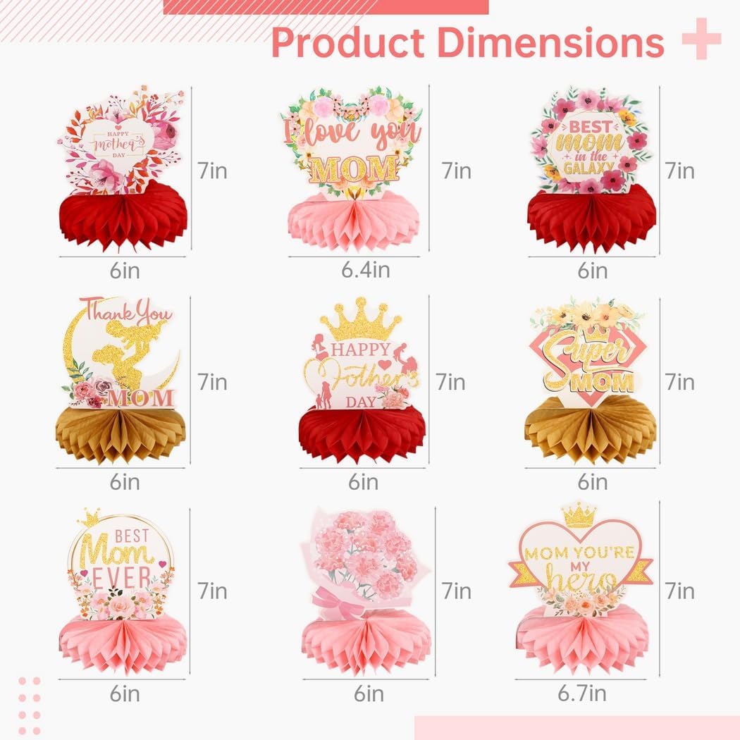 Set da 9: nove toppers a nido d'ape in vari design di tendenza con temi per la festa della mamma; dona ulteriore fascino all'arredamento della tua festa Festeggia le mamme: presenta motivi divertenti e commoventi in colori tenui e rossi; porta gioia alla festa della mamma Facile da montare: basta staccare la colla e attaccare il nido d'ape sul cartoncino abbinato, processo semplice e veloce Materiale di alta qualità: realizzato in cartone robusto e lucido con stampe vivide e durature Per molteplici occasioni: può essere utilizzato come centrotavola o appeso per la decorazione; salvaspazio e versatile