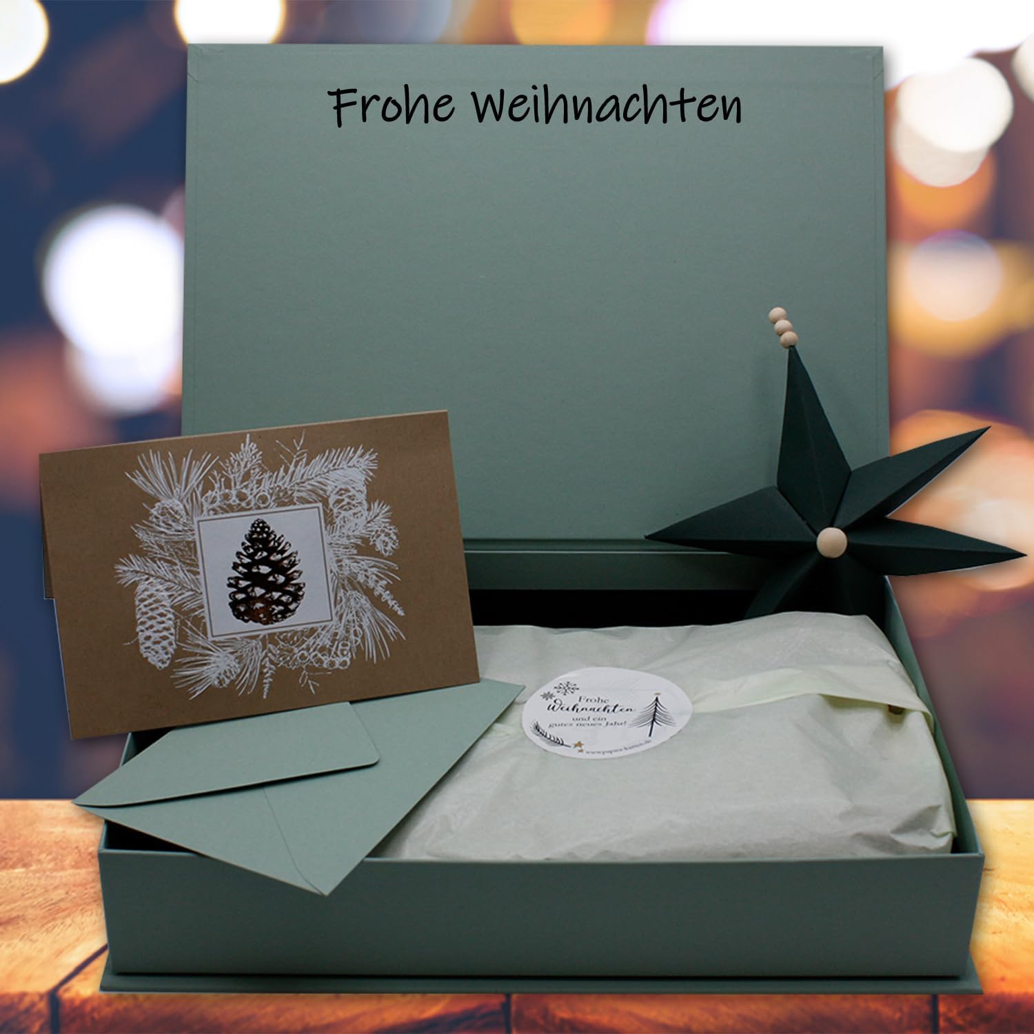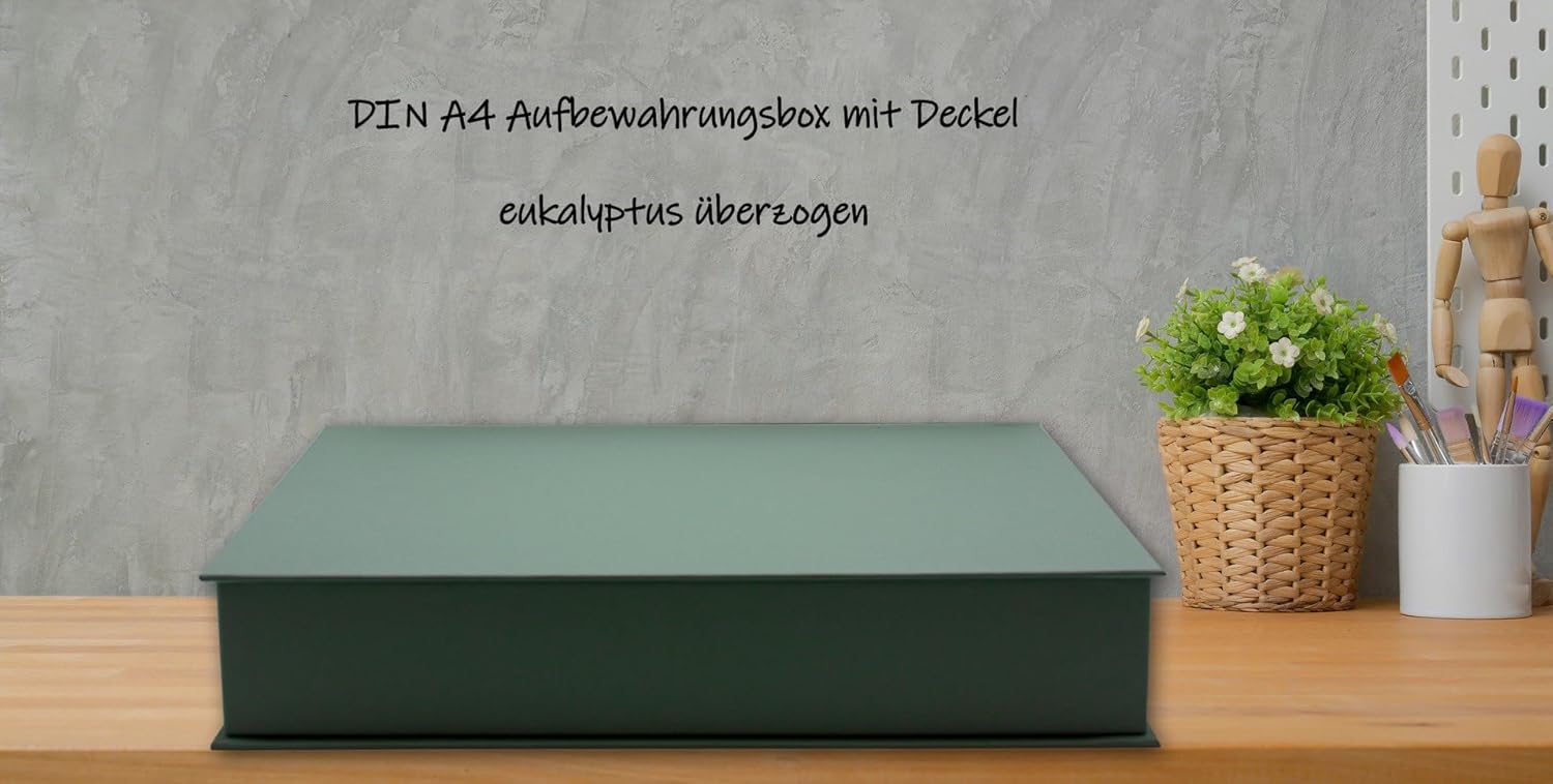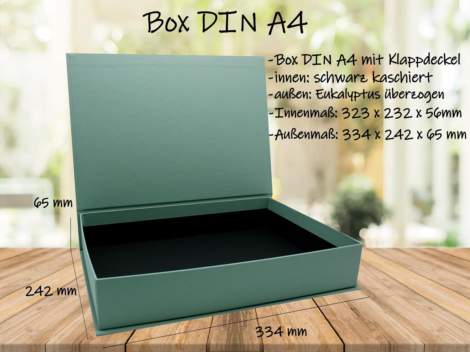 1 scatola regalo stabile e di alta qualità con coperchio, ideale per riporre documenti, lettere d'amore, portagioie o come confezione regalo per compleanni e tutte le altre celebrazioni. Riceverete una robusta scatola portaoggetti rivestita con carta di eucalipto di alta qualità: la scatola è rivestita internamente di nero e realizzata in robusto cartone per libri. Per te, come regalo o come decorazione. Dimensioni interne: 323 x 232 x 56 mm o lunghezza 32,3 cm x larghezza 23,2 cm x altezza 5,6 cm. Perfettamente adatto per documenti DIN A4 - dimensioni esterne: 334 x 242 x 65 mm o lunghezza 33,4 cm x larghezza 24,2 cm x altezza 6,5 cm. Design molto stabile, impilabile grazie al coperchio sporgente. Il contenuto è sempre protetto grazie al coperchio incernierato. Questa confezione regalo robusta e di alta qualità è disponibile in diverse dimensioni e colori - sfoglia il nostro negozio - NEUSER PAPIER: il professionista della carta e della carta da oltre 100 anni.