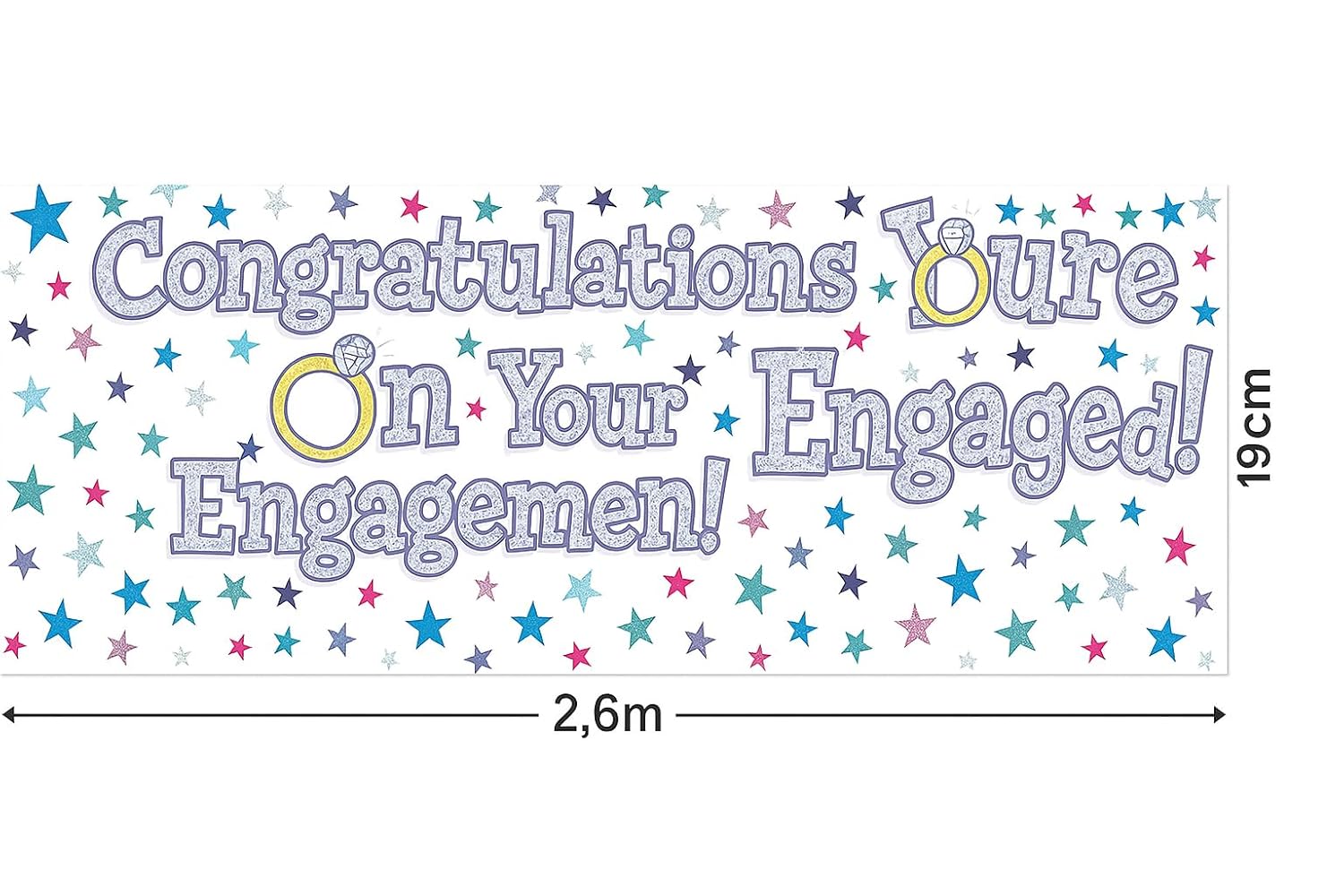 Grazie per il tuo interesse per il nostro banner. Questo striscione di fidanzamento extra large presenta un design di stampa moderno e accattivante con una delicata lucentezza che è una decorazione perfetta da appendere a pareti, tavoli, porte, scale, solo per citare alcuni luoghi. I nostri banner olografici sono lunghi 2,6 m e possono essere utilizzati come un banner lungo o divisi in 3 banner più piccoli se il motivo si ripete. Questo banner è largo il doppio di un normale banner per feste, rendendolo un enorme pezzo di dichiarazione che catturerà sicuramente l'attenzione dei tuoi ospiti. Ogni confezione contiene un banner, non è richiesto alcun assemblaggio. Si prega di smaltire gli striscioni dei partiti in modo responsabile. Per riciclare gli striscioni per feste in alluminio, rimuovi prima tutti gli elementi non riciclabili come plastica o nastro adesivo. Pulisci la pellicola rimuovendo eventuali residui, quindi mettila nel contenitore di metallo e plastica. Consigliamo di utilizzare Blu-Tak o nastro adesivo per appendere gli striscioni. Sono piegati per imballarli. Assicurati di stringerli bene perché questo farà scomparire le rughe e farà brillare e brillare il banner il più possibile! La nostra gamma è adatta a ragazze, ragazzi, donne e uomini. Possono essere utilizzati sia all'interno che all'esterno e sono riutilizzabili con colori a lunga durata. Gli striscioni da muro sono un'aggiunta essenziale a qualsiasi festa di compleanno e questo striscione da muro grande e colorato è perfetto per aggiungere ulteriore entusiasmo all'occasione! Questo striscione extra lungo per feste può essere utilizzato a tutta lunghezza o diviso lungo le perforazioni in tre sezioni identiche che misurano circa 84 cm ciascuna. Nota: tenere lontano dalla portata dei bambini piccoli a causa del possibile rischio di strangolamento. I sacchetti di plastica possono essere pericolosi, per evitare rischi di soffocamento, tenere questi sacchetti lontano dalla portata dei bambini di età inferiore a 36 mesi. Questa confezione contiene clip metalliche, smaltiscile in modo sicuro.