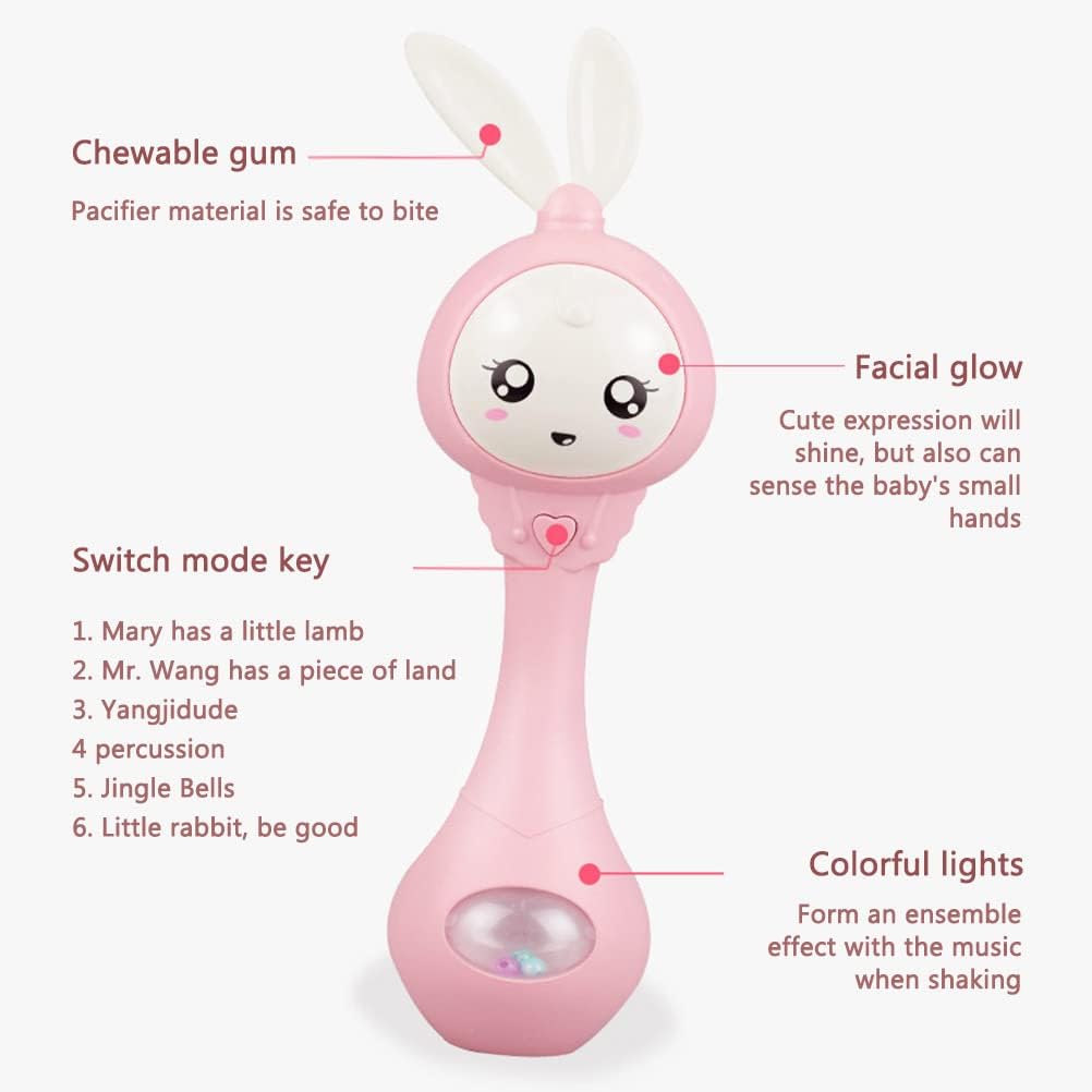 Sonaglio per bambini: la dimensione adatta lo rende facile da afferrare per le mani piccole, mantiene le mani piccole e fa sì che i tuoi bambini siano attivi e allenino la presa e la coordinazione occhio-mano. Luci luminose: la luce del viso lampeggia e la luce della sfera trasparente crea un effetto morbido, caldo e bello. Shaking: perline colorate e musica formano un effetto agitazione per coltivare lo sviluppo dell'udito dei bambini. Giocattoli per bambini: le piccole mani sono attive tra queste figure colorate, e il tuo bambino può esplorare modelli, texture e suoni. È per divertirsi a casa o in viaggio. Sviluppo della visione: Caratteristiche luce soffusa, colori vivaci, perle sono buone per la visione dei bambini.