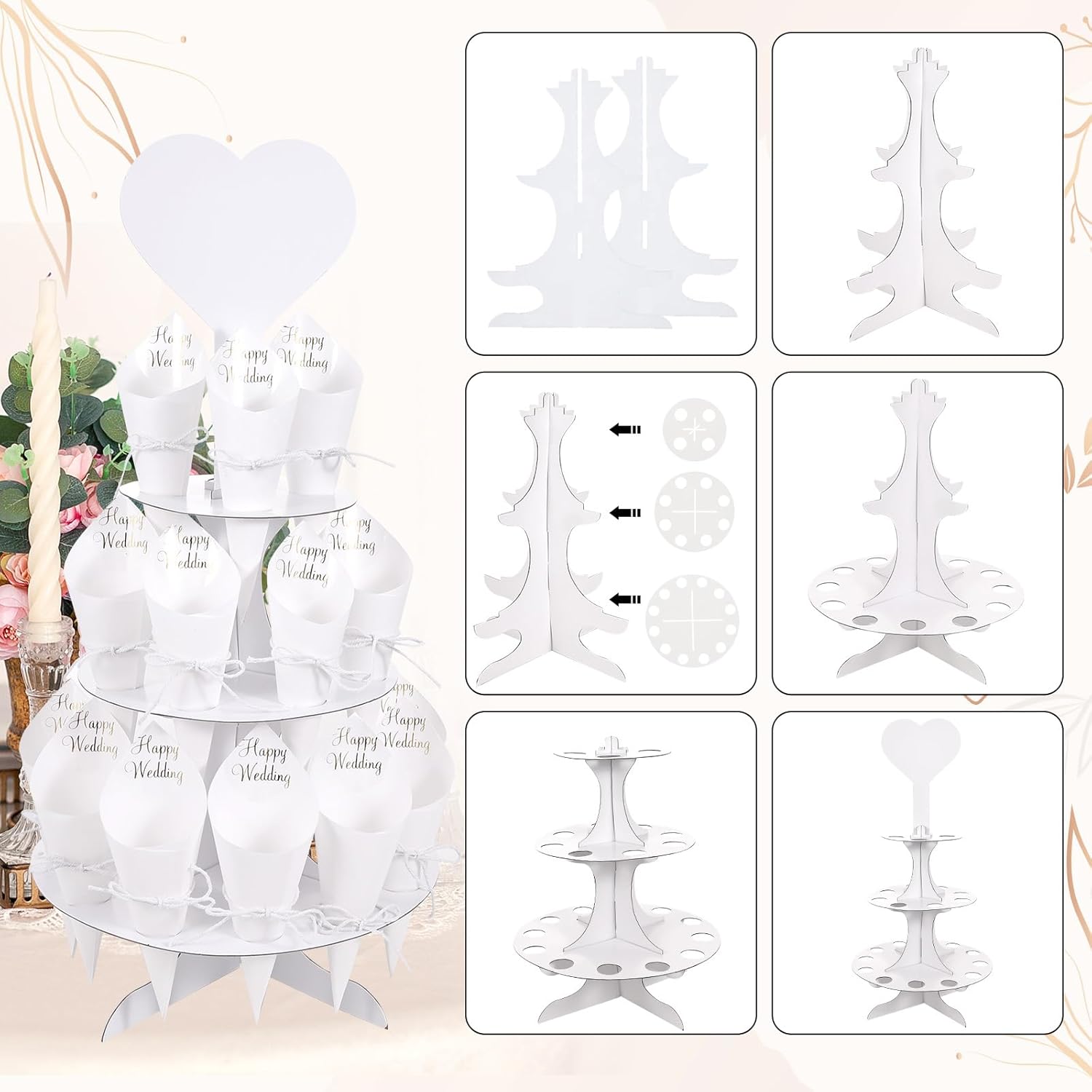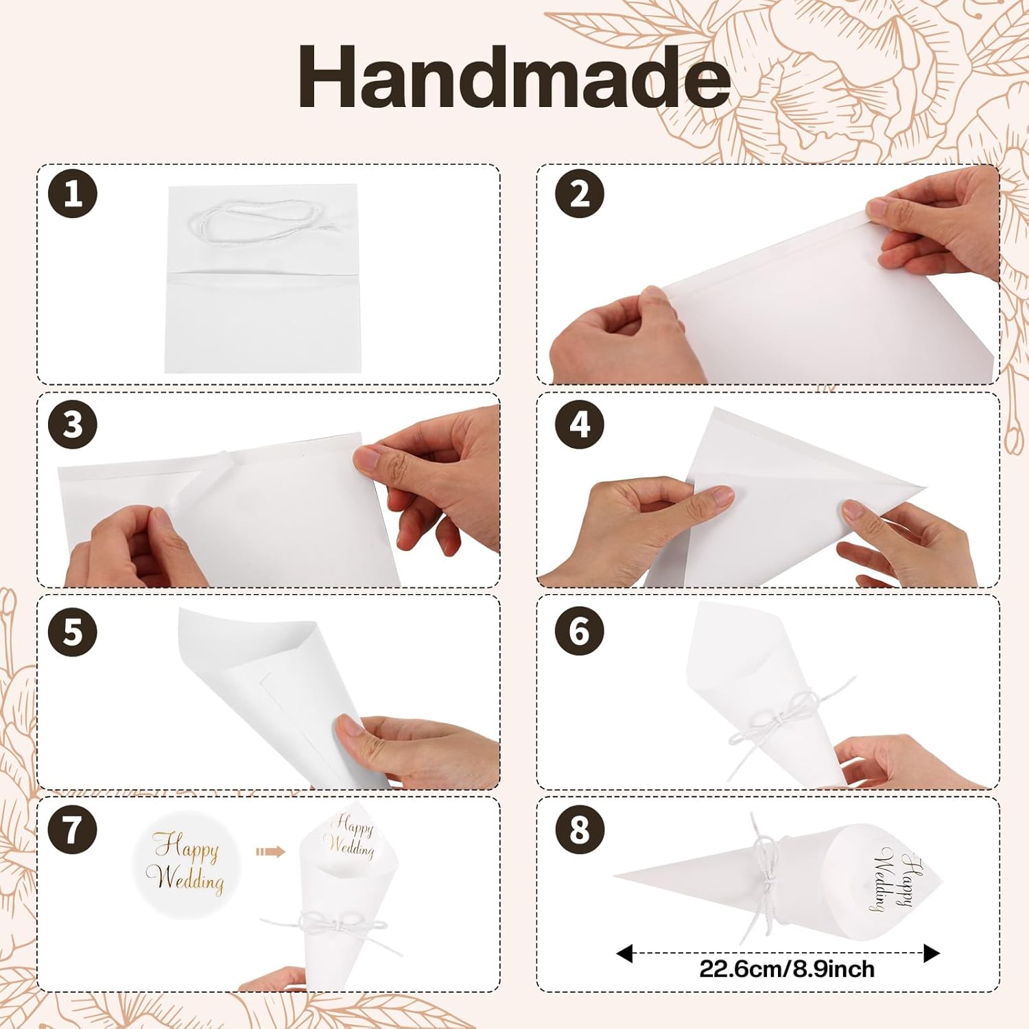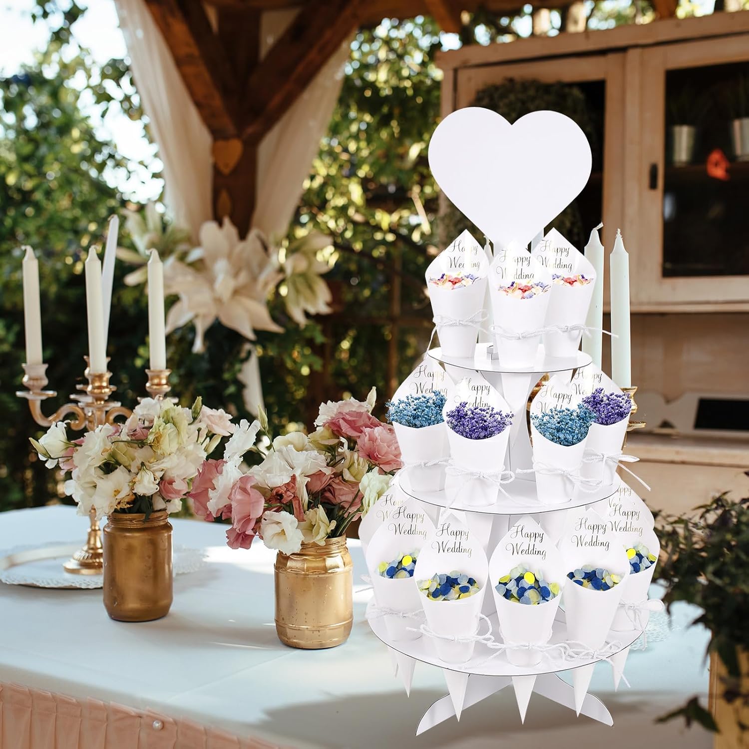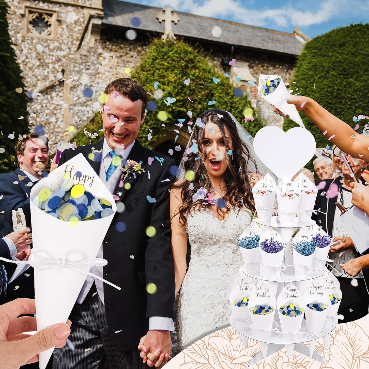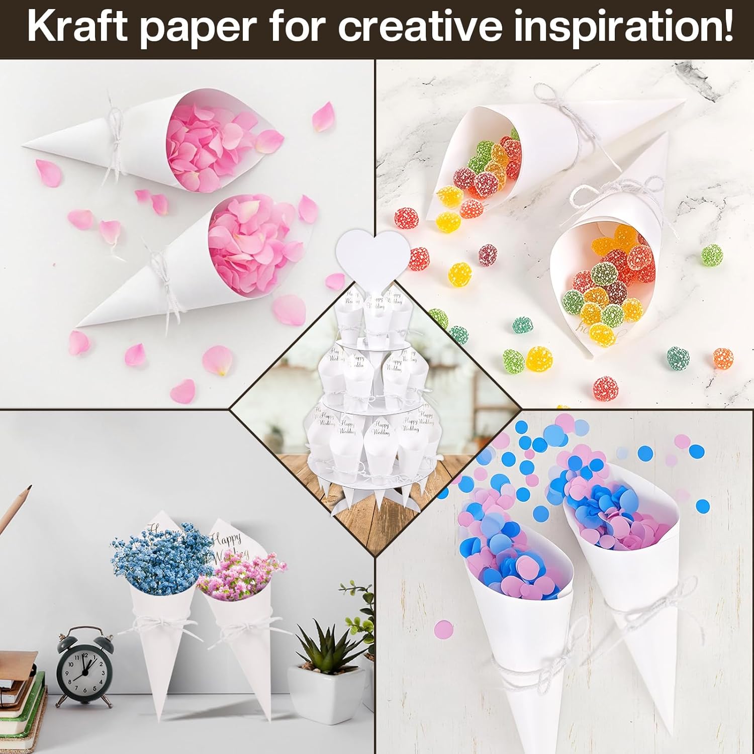 24 coni Kraft: questo set di coriandoli nuziali include 24 coni di carta, 1 supporto per coni di coriandoli, nastro biadesivo, 30 adesivi e corda di canapa da 10 m. Materiali di alta qualità: realizzati in carta kraft vintage, è ecologico, non tossico, resistente, durevole e riutilizzabile. Mantiene perfettamente la sua forma anche dopo un uso prolungato. Facile da montare: arrotolare la carta kraft in un cono, fissarlo con nastro biadesivo, legare una corda e attaccare adesivi decorativi, quindi posizionare il cono nel suo supporto. Per quanto riguarda il supporto per coni di coriandoli, puoi installarlo secondo le istruzioni Adatto a varie occasioni: i nostri coni di coriandoli nuziali sono perfetti per creare momenti indimenticabili, che si tratti di lanciare petali per un matrimonio romantico, regali di caramelle per un compleanno o decorazioni da tavola per una festa. Questo set è perfetto Facile da riempire: i coni di coriandoli nuziali sono perfetti per riempire petali di rosa, coriandoli, piccoli bouquet, caramelle, cioccolatini o piccoli giocattoli. Questi premurosi coni kraft diventeranno una magnifica testimonianza di gioia per i tuoi cari e i tuoi amici