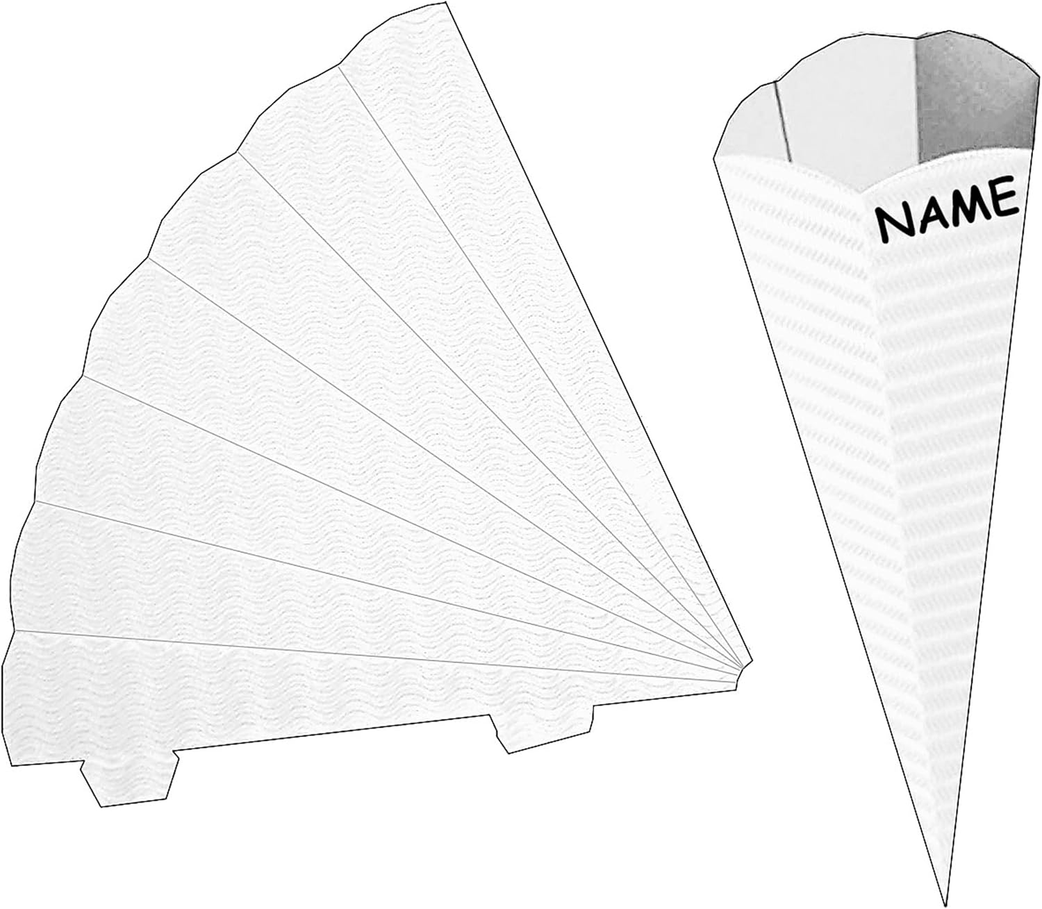 Realizza tu stesso il tuo cono scolastico! ___ Cono scolastico vuoto ___ realizzato in SUPER - robusto cartone ondulato / cartone _ per il fai da te e per diventare creativi ___ Dimensioni del cartone di circa 70 cm ___ è rifinito con una finitura in tulle come un normale cono scolastico con una lunghezza di 85 cm!! Puoi scegliere: ___ con superficie ONDULATA o LISCIA! ___ ottimo inchiostro da stampa! ____ ideale per creare, dipingere, incollare __ e può anche essere rivestito con TESSUTO __ (ovviamente può essere utilizzato anche in un colore) ____ Colore: BIANCO autentico FATTO A MANO e prodotto in Germania! _____ incollalo semplicemente con una pistola per colla a caldo .. (o altra colla)... Fatto :-) ___ Riceverai SOLO il pezzo grezzo, altri accessori come il tulle devono essere acquistati separatamente IL cono scolastico individuale con il tuo NOME DESIDERATO - aggiungi semplicemente l'articolo "Nome desiderato" nel carrello come extra, il nome verrà quindi abbinato OPZIONALE è disponibile una punta in plastica abbinata, trasparente e solida per il fissaggio (questo rende la punta del cono scuola molto stabile e fissa) ---- (questo articolo deve essere ordinato EXTRA al cono scuola)