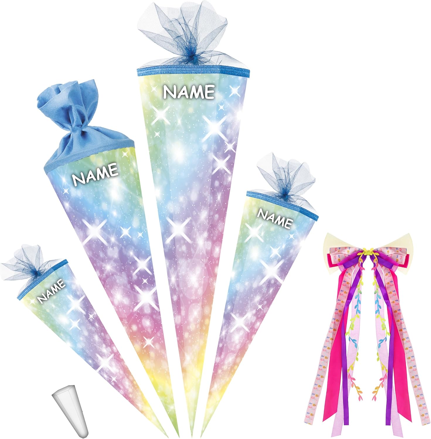 con bellissimo effetto 3D - stampa GLITTER e mica!! ____ cono scolastico stabile e di alta qualità _____ Dimensioni: 50 cm di lunghezza (misurato solo il cartone) ___ Forma: ROTONDO ____ Motivo: "colori dell'arcobaleno e stelle" autentico FATTO A MANO e prodotto in Germania! _______ Materiale: cartone rivestito e di alta qualità - idrorepellente! _____ SUPER stabile e tanto spazio per fantastici regali! ____ ottimi colori di stampa! _______ / ___ il bordo superiore del sacchetto regalo ha un elegante bordo intrecciato e un'estremità in tulle con una punta in plastica trasparente per il fissaggio (questo rende la punta dello zaino estremamente stabile) + ______ grandi nastri in colori abbinati (nobili e fatti a mano) ______ la consegna dei bellissimi modelli di fiocchi è mista (puoi vedere esempi nelle immagini) SPECIALE E INDIVIDUALE: _____ a seconda della selezione -> personalizzato con il NOME desiderato e il TESTO desiderato ___ / ____ il nome è richiesto - AUTOMATICAMENTE: NON inviare un messaggio in anticipo. La marca _ alles-meine Gmbh __ offre oltre 1000 articoli relativi all'inizio della scuola ____ ad es. vari fiocchi come chiusure, piccoli zaini decorativi da appendere, candele, varie decorazioni per la stanza e la tavola, salvadanai ___ e persino imbottiture complete! ____ I coni scolastici sono ottime idee regalo... per l'inizio della scuola, dell'asilo e dell'asilo, per l'inizio della formazione o degli studi, per un nuovo lavoro! …. o un inizio diverso per una nuova fase della vita