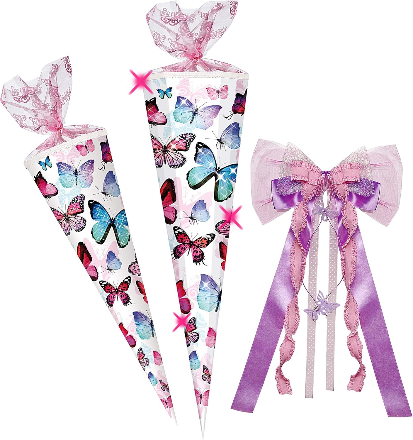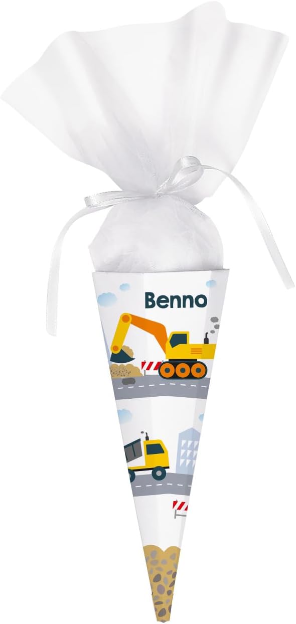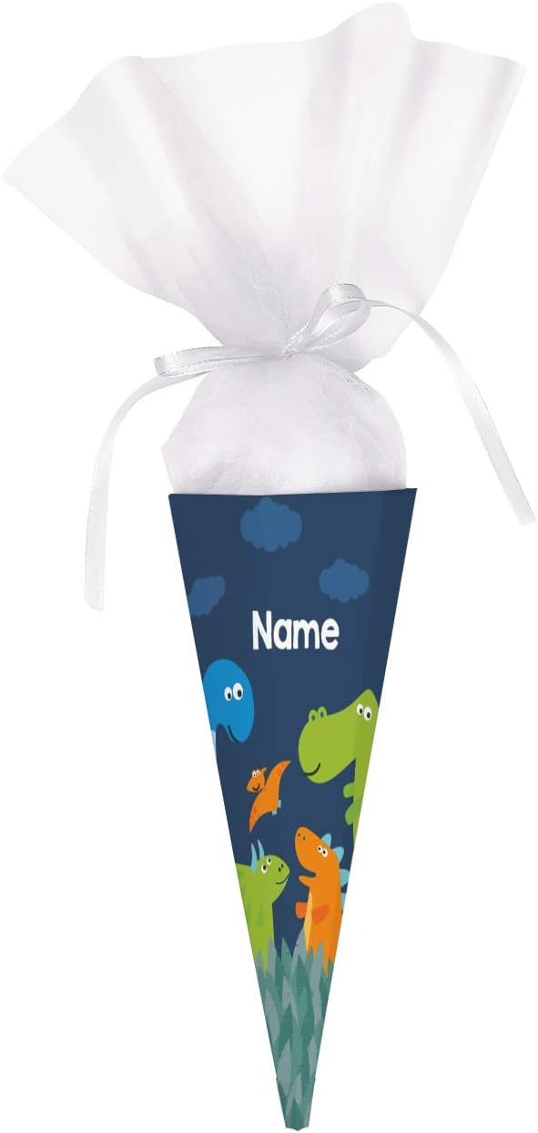 Insieme a questa borsa con dinosauri, l'eccitazione del primo giorno di scuola sarà sicuramente superata meglio. Il cono di zucchero è stampato con il motivo di diversi dinosauri mediante un processo di stampa di alta qualità. Il nome del tuo piccolo dinosauro esploratore è integrato nel motivo in lettere bianche ben leggibili. Realizzeremo per voi il lavoro artigianale a Eichsfeld, in Turingia. L'estremità del cono scolastico è una chiusura in tulle. Tutto quello che devi fare ora è riempirlo e aggiungere un fantastico fiocco. Il cono scolastico esagonale è alto 80 cm e ha un diametro di 26 cm all'apertura ed è stampato con inchiostro ecologico.