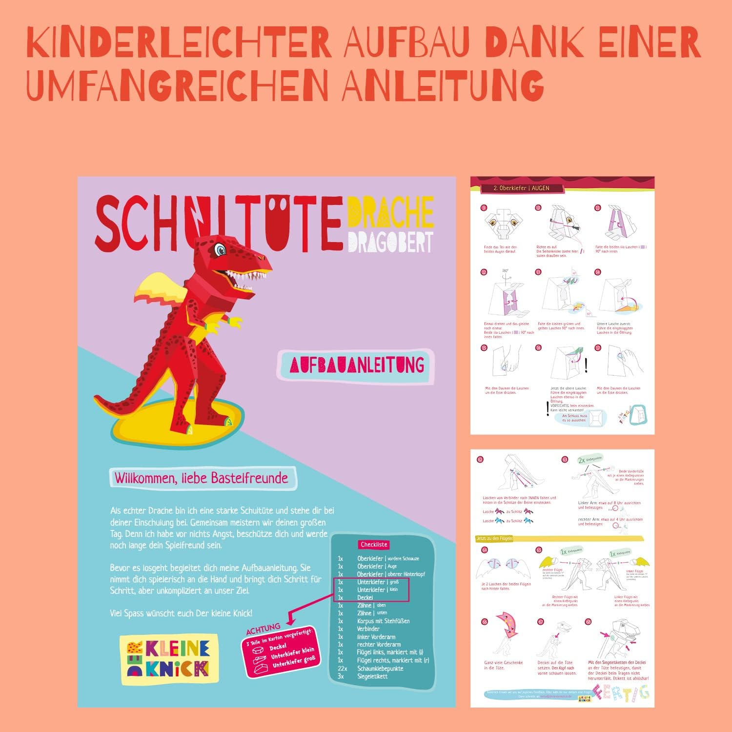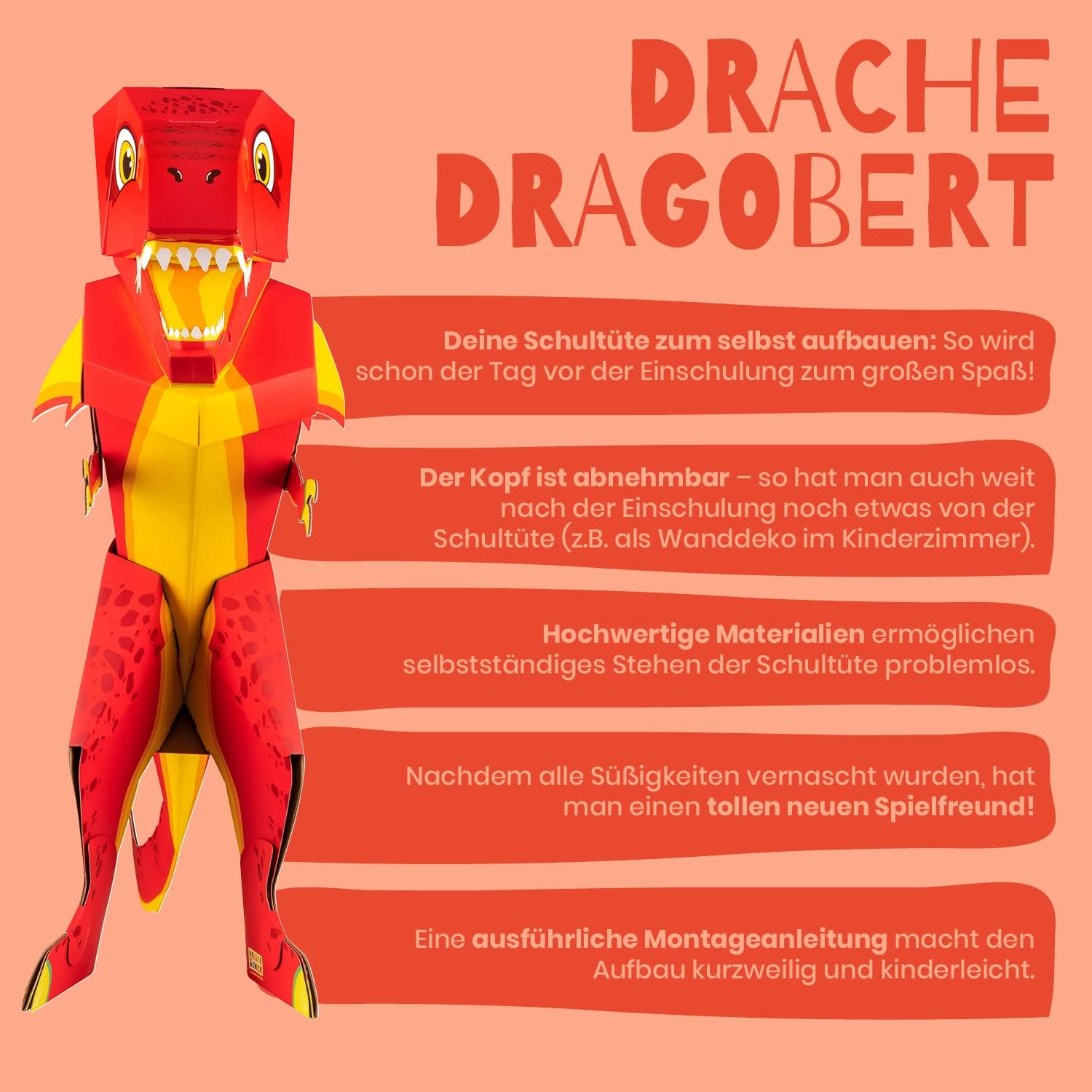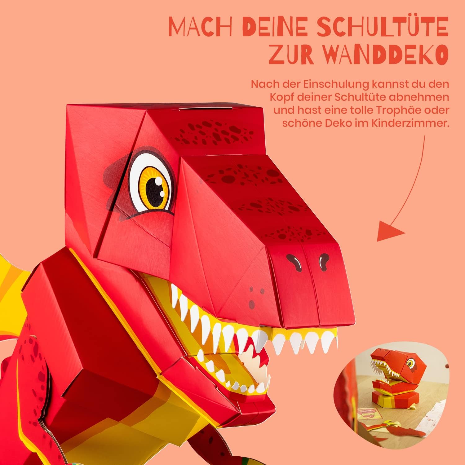 ✨ GRANDI MOTIVI: Scegli tra dinosauro o drago: perfetto come cono scolastico per fratelli. Grazie ai piedini il cono scolastico può essere appoggiato in qualsiasi momento. 👐 MONTAGGIO FACILE: Grazie alle parti premontate e alle semplici istruzioni, puoi montare il cono scolastico in pochissimo tempo. ♻️ RIUTILIZZABILE: il cono scolastico funge da trofeo o da riporre dopo l'inizio della scuola. Basta appendere la testa al muro e divertirsi a lungo. 🤏 APERTA IN QUALSIASI MOMENTO: Grazie al pratico coperchio, la borsa per fratelli può essere facilmente aperta e chiusa. Se hai dimenticato qualcosa, puoi facilmente aggiungere il contenuto. 👍 VERSATILE: La bustina di zucchero è perfetta come borsa per la scuola, per l'asilo o per adulti.