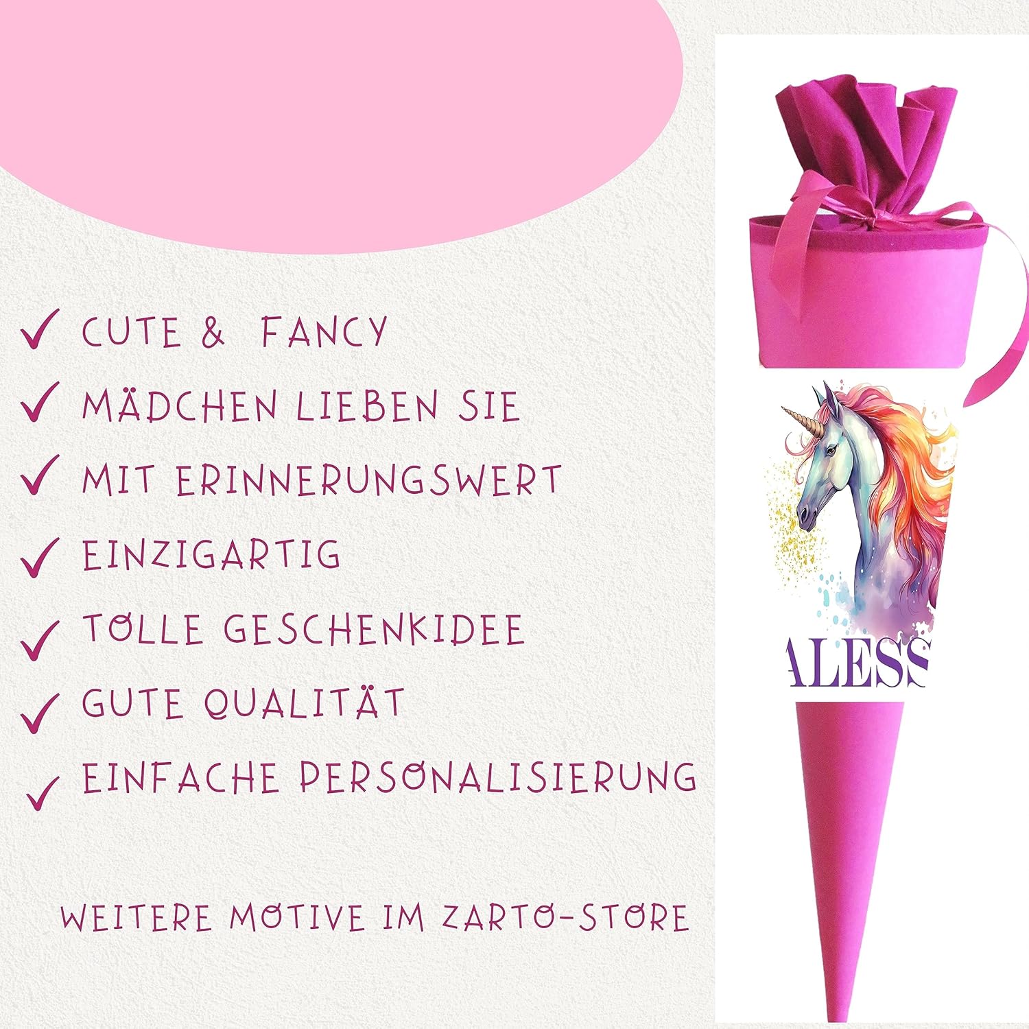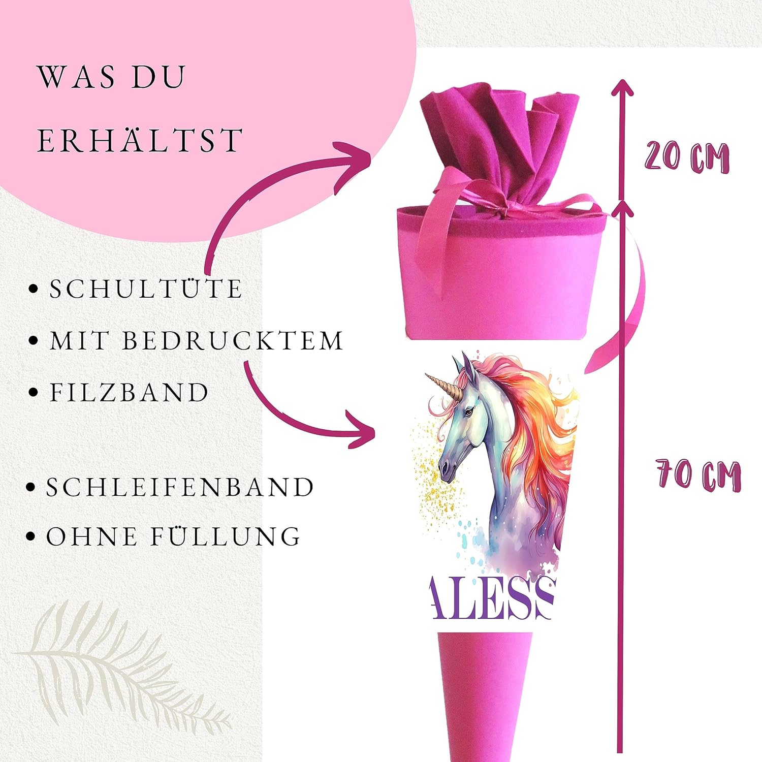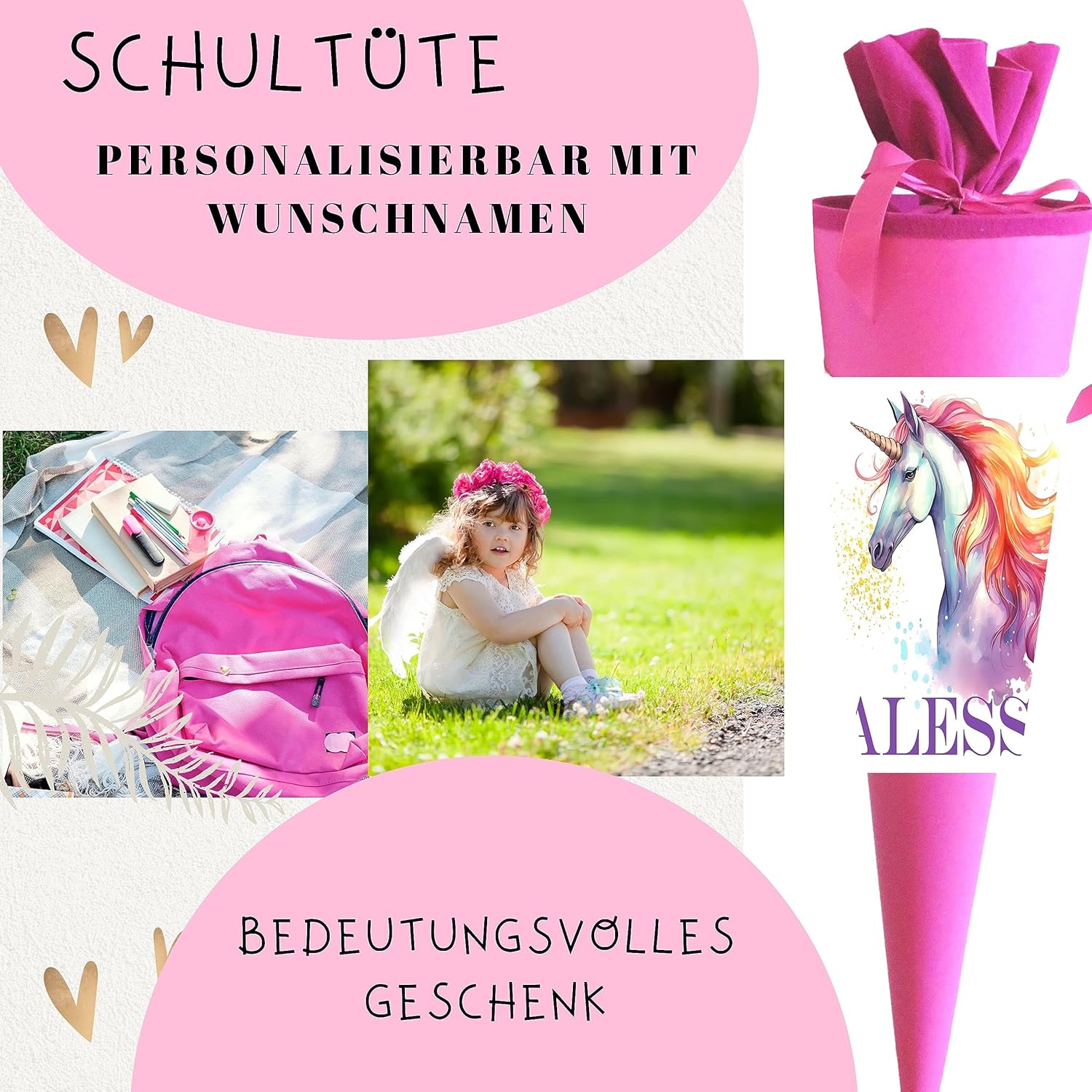 ZAINO SCUOLA PERSONALIZZABILE - IMMERGITI IN UN MONDO MAGICO: il nostro zaino scolastico personalizzabile per ragazze con un magico motivo di unicorno nei vivaci colori dell'arcobaleno è il regalo perfetto per l'inizio della scuola! Risveglia la fantasia e l'allegria della tua bambina e regalale un inizio scuola indimenticabile. FELICITÀ DELL'UNICORNO PER LA TUA PRINCIPESSA: Ogni ragazza ama gli unicorni e ora tuo figlio può portarla con sé nella sua magica avventura! Il cono scuola è personalizzato con il nome della tua principessa, rendendo il regalo un vero scrigno del tesoro: un barlume di felicità personale che tocca il cuore. Con il nome desiderato – Realizziamo questi coni scolastici individualmente a mano. Stampiamo l'etichetta in feltro con il nome desiderato, cuciamo insieme il nastro e lo fissiamo sul cono della scuola. Lo zaino viene quindi avvolto con amore e parte per il suo viaggio. QUALITÀ CHE PUOI SENTIRE: il nostro cono scolastico è realizzato con materiali di alta qualità ed è abbastanza robusto da tenere al sicuro tutti i piccoli tesori. La cura dei dettagli in ogni elemento di design e l'accurata lavorazione rendono questo cono scolastico un regalo irresistibile. Il cono scuola personalizzabile diventa un tesoro che il tuo bambino porterà per sempre nel cuore. Ogni volta che ci pensa, le viene in mente l'inizio speciale della scuola e le infinite possibilità che le si prospettano. Regalarle momenti magici e gioia infinita con il nostro cono scolastico unico!