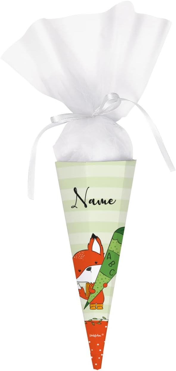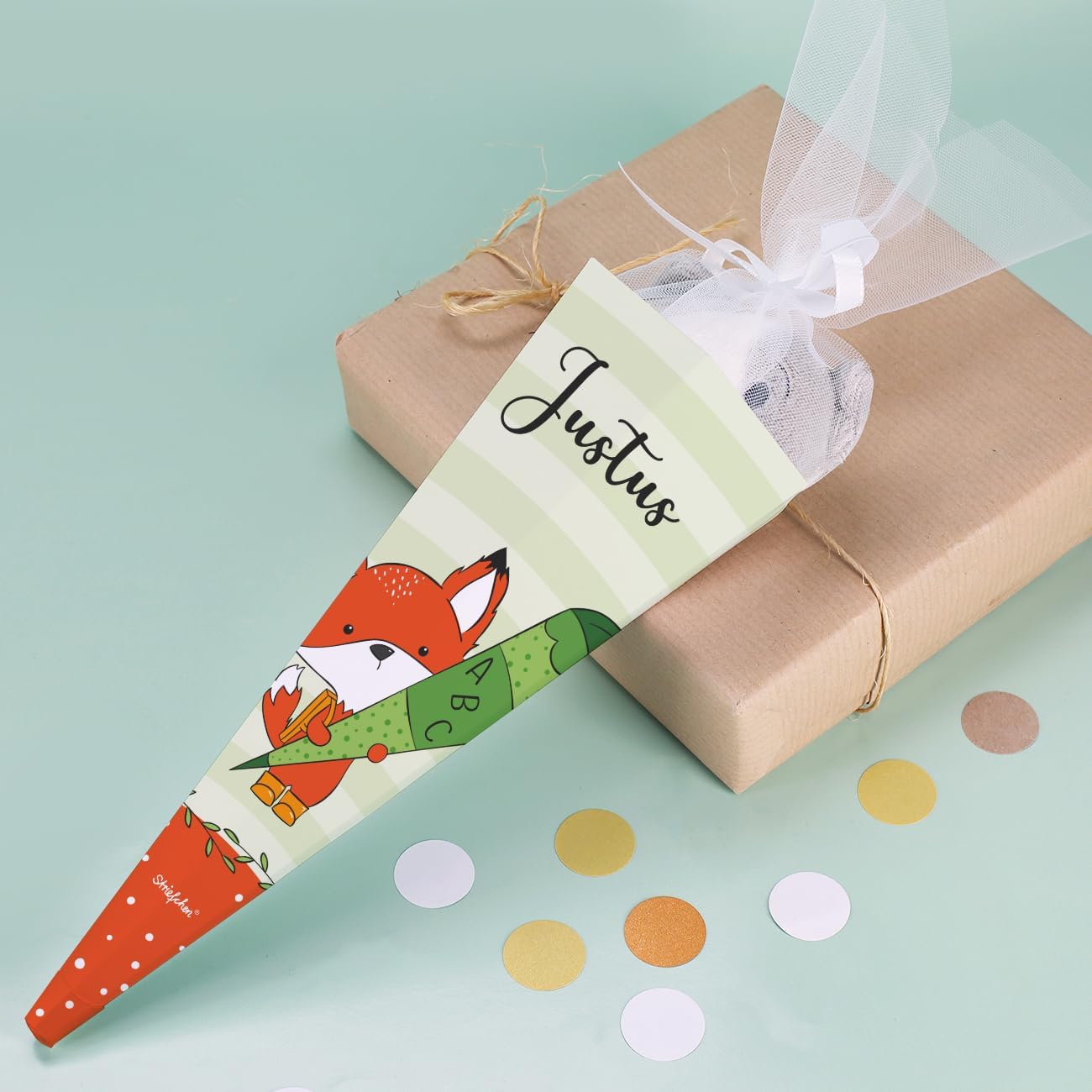 Finalmente la scuola - Dopo la scuola dell'infanzia inizia il passo successivo, il tempo della scuola. Per addolcire il viaggio c'è una bustina di zucchero. Il cono della scuola è una parte importante della giornata in cui il bambino inizia la scuola e significa molto per lui. Volpe con bustina di zucchero - Questa bustina di zucchero presenta una volpe con una borsa ABC tra le zampe. Sopra c'è il nome dell'orgoglioso nuovo studente. Il motivo è stato disegnato e digitalizzato da noi stessi. Funziona così: inserisci semplicemente il nome in "Personalizza ora". Stampiamo e realizziamo il cono scolastico con finitura in tulle e pizzo rinforzato. Spediamo entro pochi giorni dalla ricezione dell'ordine. Variazioni di dimensioni - Il cono scolastico Fuchs è disponibile in 2 misure. La grande busta di zucchero è di ca. 80 x 26 cm e la borsa per fratelli piccoli è di ca. 28 x 11 cm. A tuo figlio piacerà sicuramente il cono scolastico personalizzato come regalo per l'inizio della scuola. Da fare - Una volta ricevuto il cono scuola finito, non ti resta che riempirlo a casa. Aggiungi un simpatico fiocco alla bustina di zucchero (non inclusa) e fai brillare il tuo bambino.