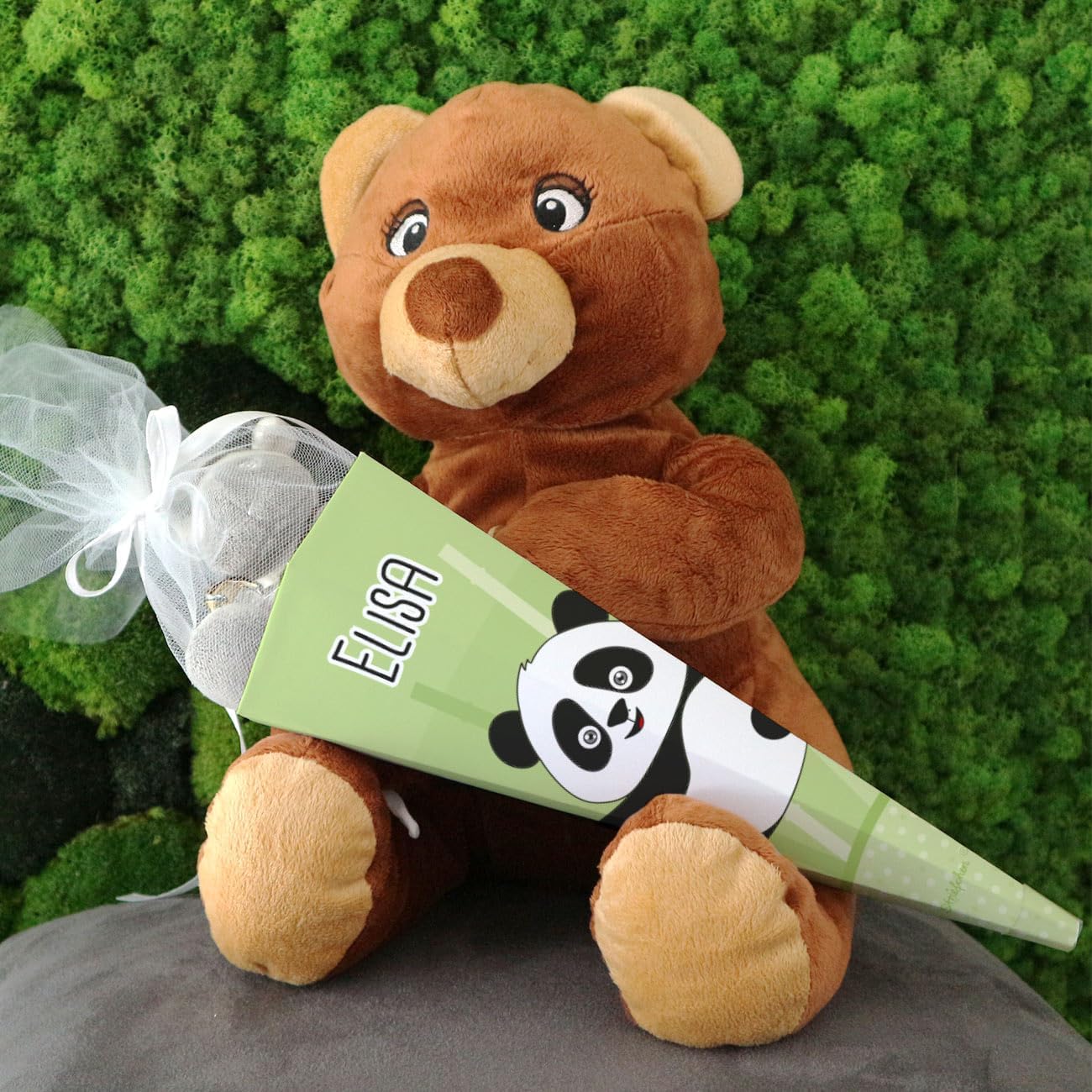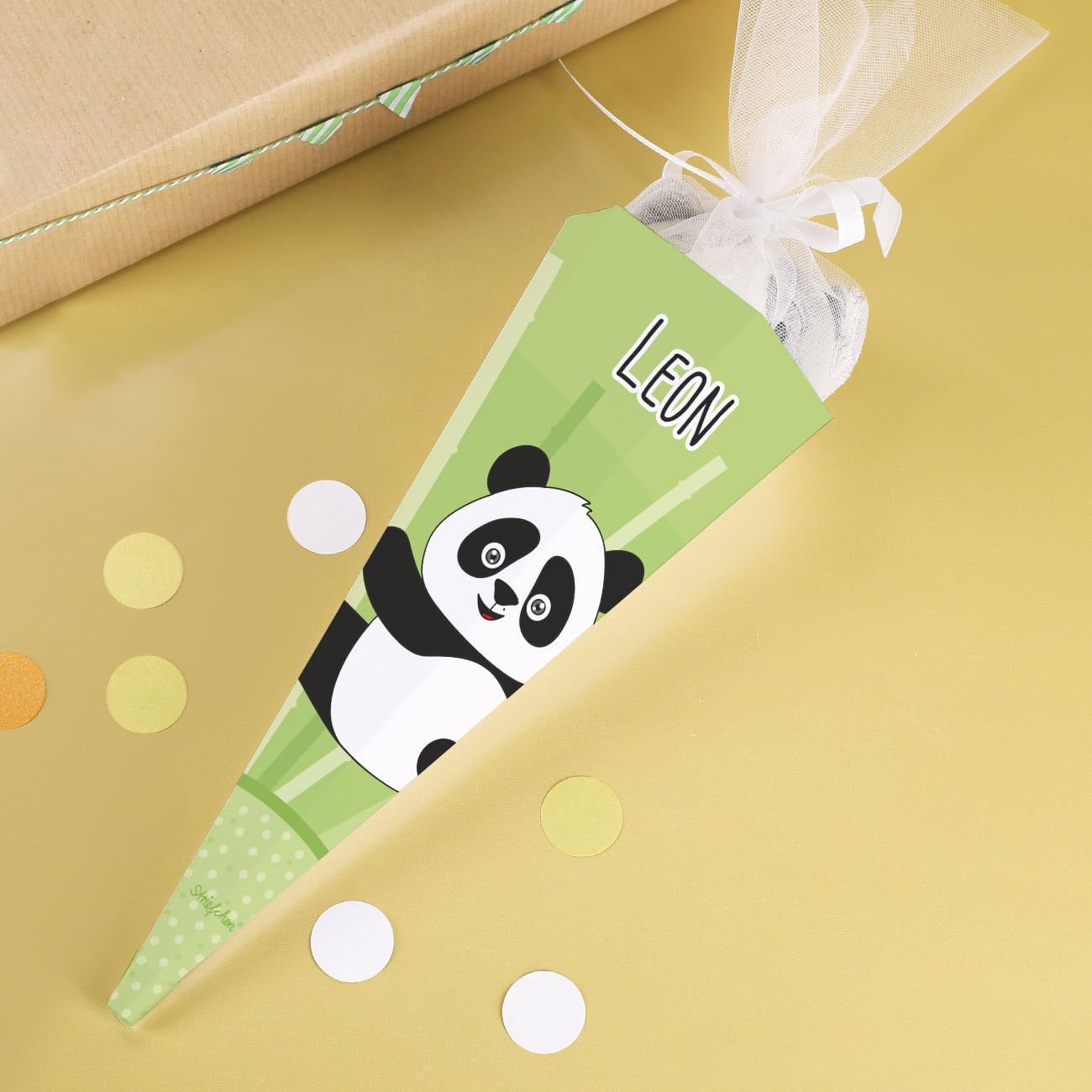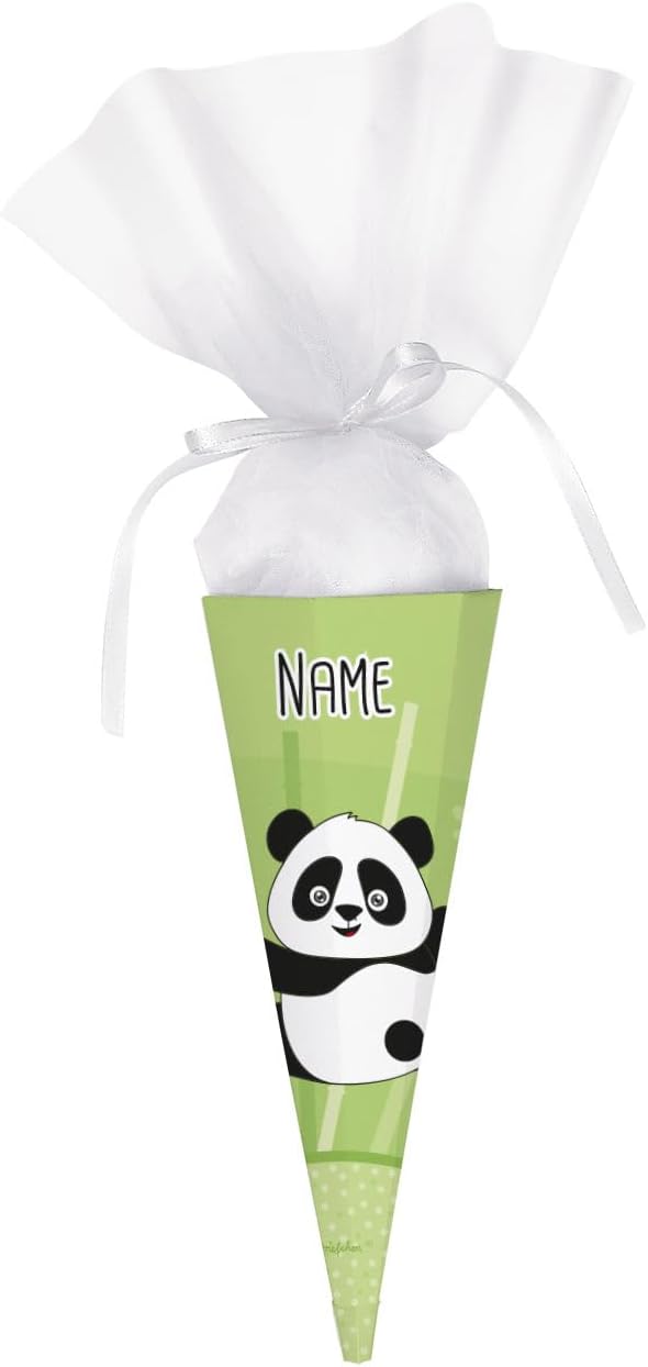 L'usanza di abituare i bambini della prima elementare a scuola con i dolci è nata nella Germania centrale e ora viene utilizzata anche nel sud della Germania e in Austria. Questi dolciumi vengono conservati in un cosiddetto zaino scolastico con oggetti pratici per la scuola e consegnati al tiratore dell'ABC durante l'introduzione alla scuola. I bambini che iniziano la scuola aspettano con ansia questo momento da settimane e sono molto orgogliosi del loro cono di zucchero. Stampiamo questo zaino scolastico con il motivo del panda e il nome di tuo figlio. Il cono scolastico ha una finitura in tulle bianco e ti arriva già pronto. Il cono scolastico esagonale è alto 80 cm o 28 cm e ha un diametro di apertura di 26 cm o 11 cm ed è stampato con inchiostro ecologico.