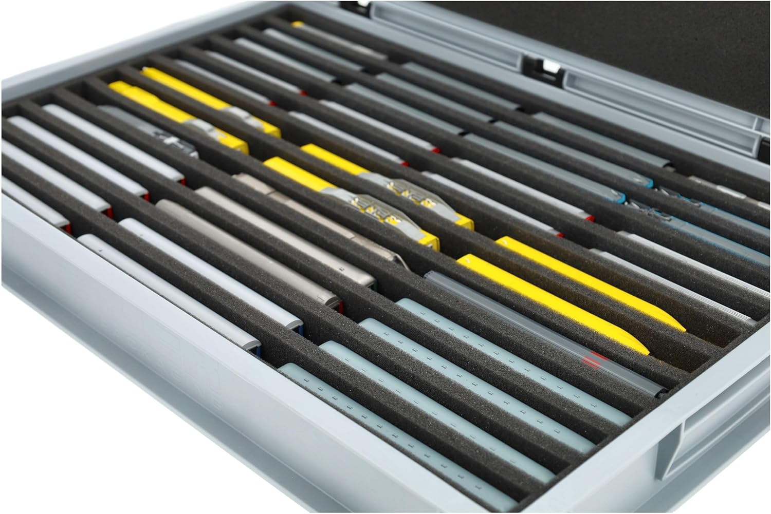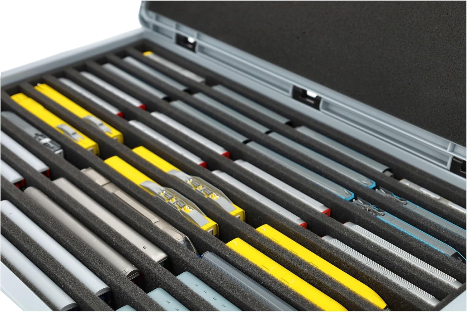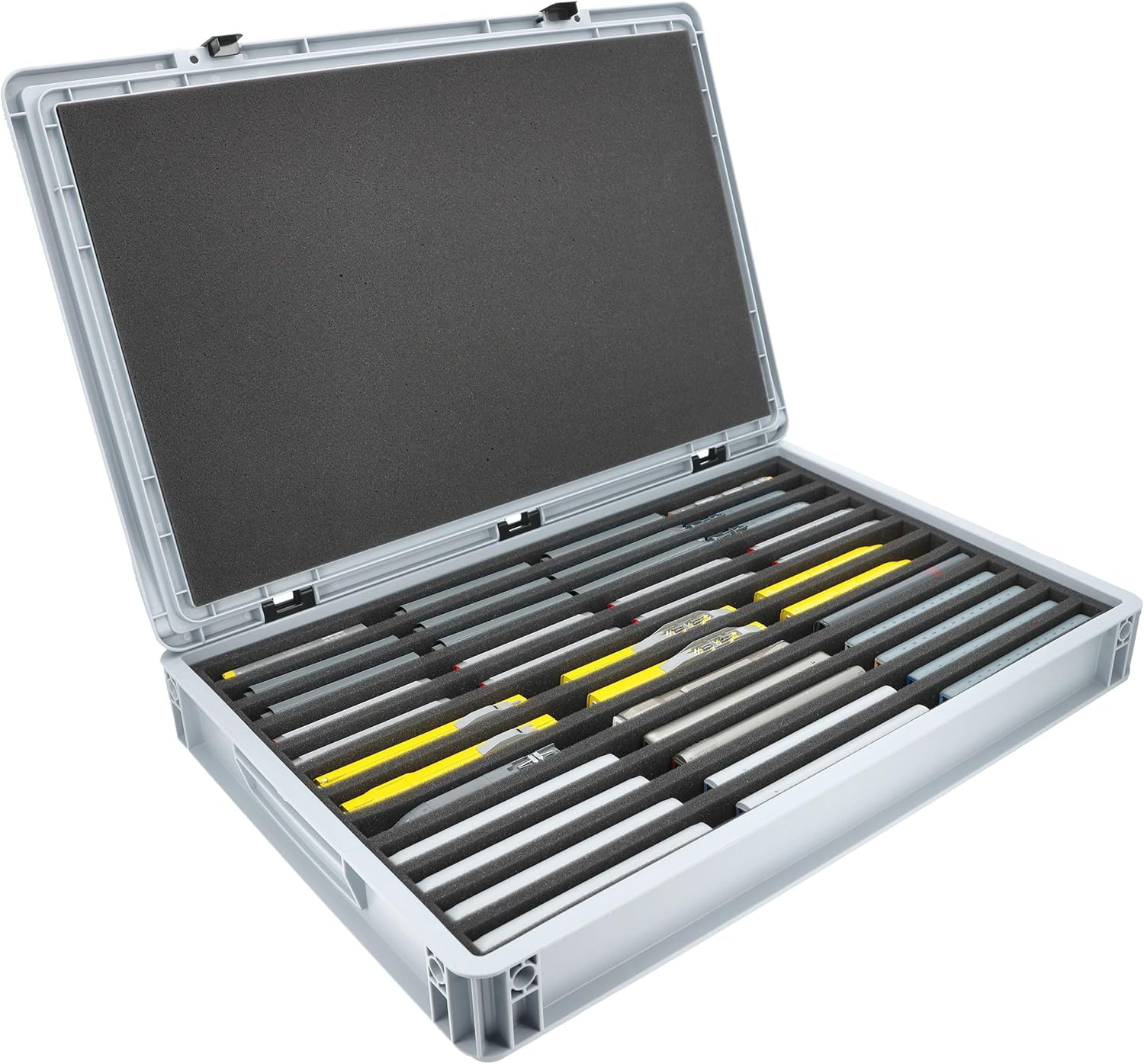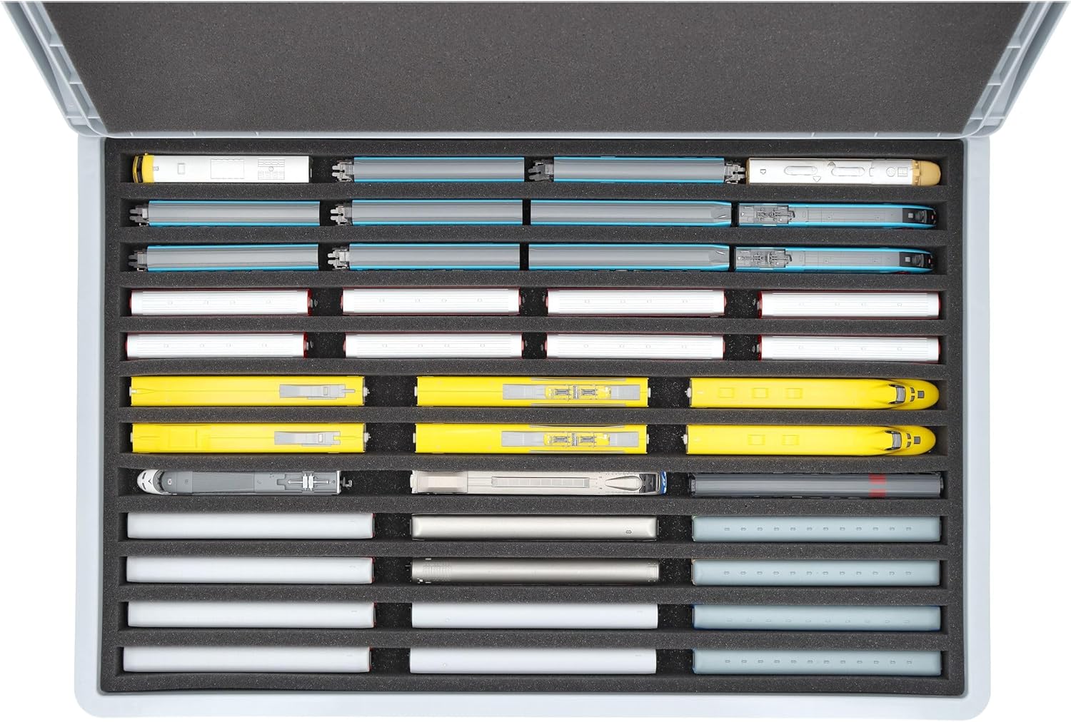 Robusta scatola Euro in plastica con inserto in schiuma Feldherr per modellismo ferroviario in scartamento N (in piedi). Per lo stoccaggio e il trasporto protetto di locomotive e vagoni. Il set contiene: 1 scatola Auer Euro con coperchio incernierato (DSEB070), 1 inserto in schiuma Feldherr con 10 barre per treni e vagoni in scartamento N, 1 schiuma borchiata autoadesiva Feldherr e un coperchio in schiuma. Un totale di 10 scomparti sono realizzati su misura per locomotive e vagoni in posizione eretta. Gli scomparti su misura realizzati in schiuma priva di acidi e cloro offrono una protezione affidabile e duratura durante il trasporto e lo stoccaggio. La vostra collezione di modellini ferroviari è conservata in modo assolutamente sicuro nel robusto contenitore Euro di Auer in plastica resistente agli urti e dimensionalmente stabile. Il coperchio, con un sistema di cerniere facile da usare e due leve di bloccaggio, protegge in modo affidabile il contenuto da polvere e sporco. La scatola è impilabile e può essere trasportata utilizzando le maniglie incassate sui lati. 👉 Tutte le figure e i componenti del gioco mostrati servono per confrontare le dimensioni e non sono inclusi. I modelli stampati in 3D possono presentare piccole imperfezioni. Le immagini del prodotto mostrano le possibili applicazioni, i colori possono variare.