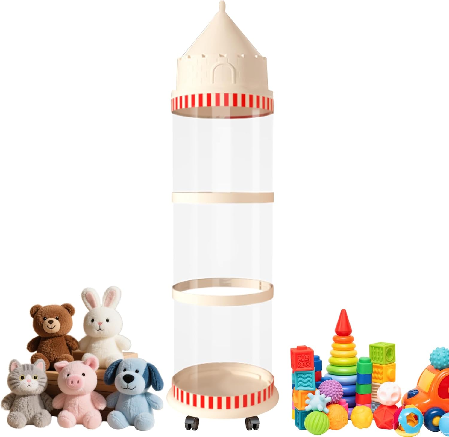 Gestione efficiente dei giocattoli: conserva giocattoli di varie dimensioni con facilità, offrendo un sistema di classificazione organizzato che semplifica l'alloggio dei giocattoli attraverso un design pratico ed efficiente in termini di spazio Comodo da usare: il facile accesso agli animali di peluche è supportato dal corpo trasparente del secchio, garantendo una chiara visibilità e una rapida posizione del giocattolo, migliorando così una comoda gestione con un approccio innovativo ma facile allo stoccaggio Durata garantita: progettata con ABS di alta qualità, questa soluzione di archiviazione offre un'eccellente durata e resistenza alla deformazione, rendendolo ideale per un uso prolungato e affidabile Protezione antipolvere: progettato con un design antipolvere per mantenere la pulizia, prevenire l'inquinamento e isolare efficacemente i contaminanti, garantendo un'igiene a lungo termine per la conservazione degli animali di peluche Design incantevole: colori vivaci e vivaci e un simpatico design da sogno creano un'atmosfera fiabesca ispirata ai castelli, rendendola perfettamente adatta per gli spazi dei bambini, stimolando l'immaginazione e la giocosità nei bambini
