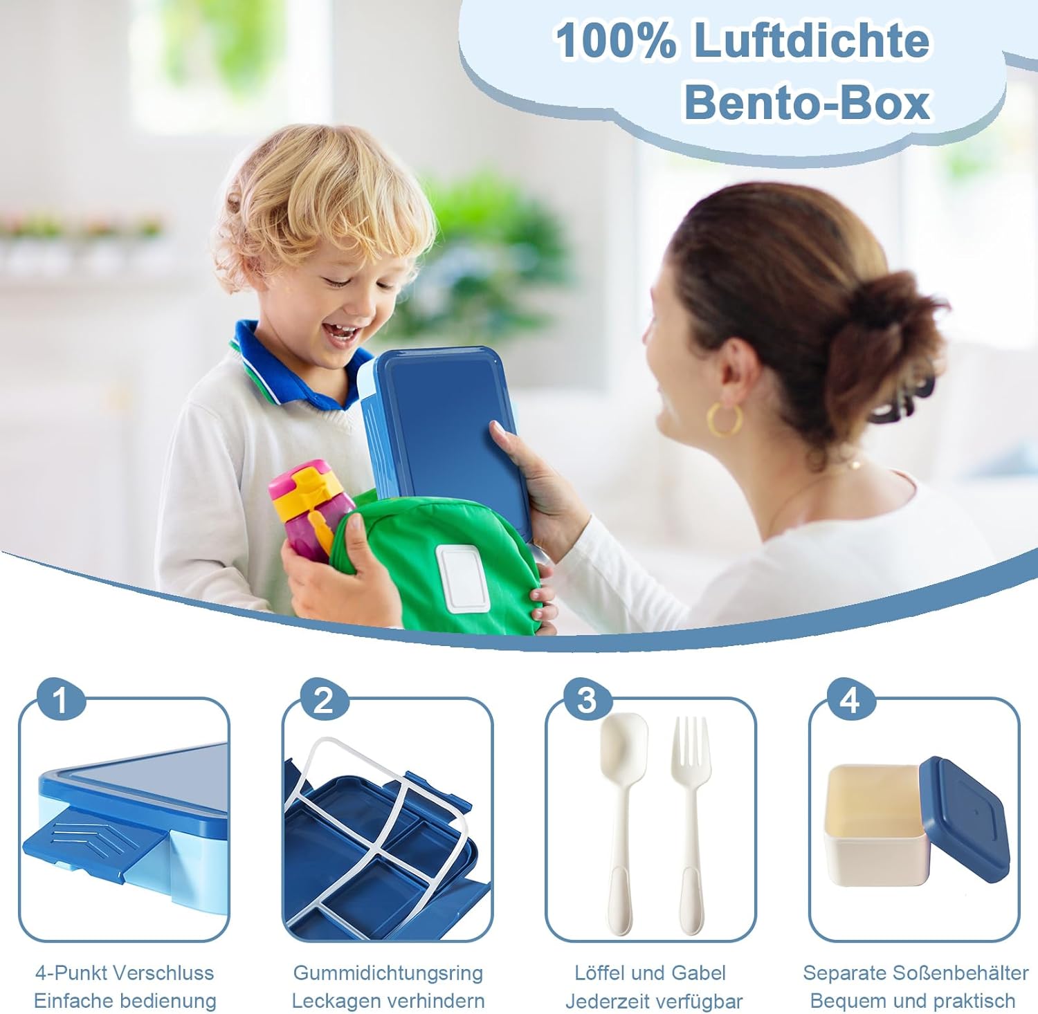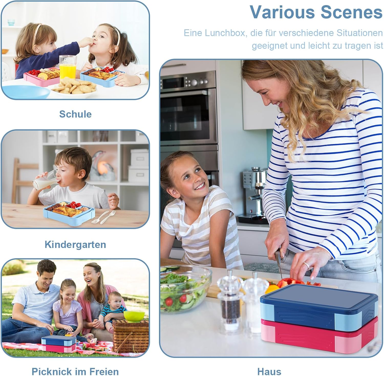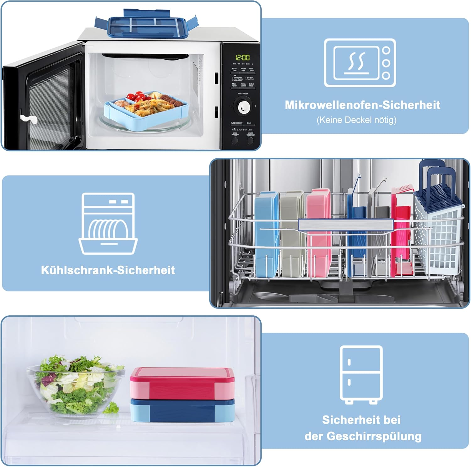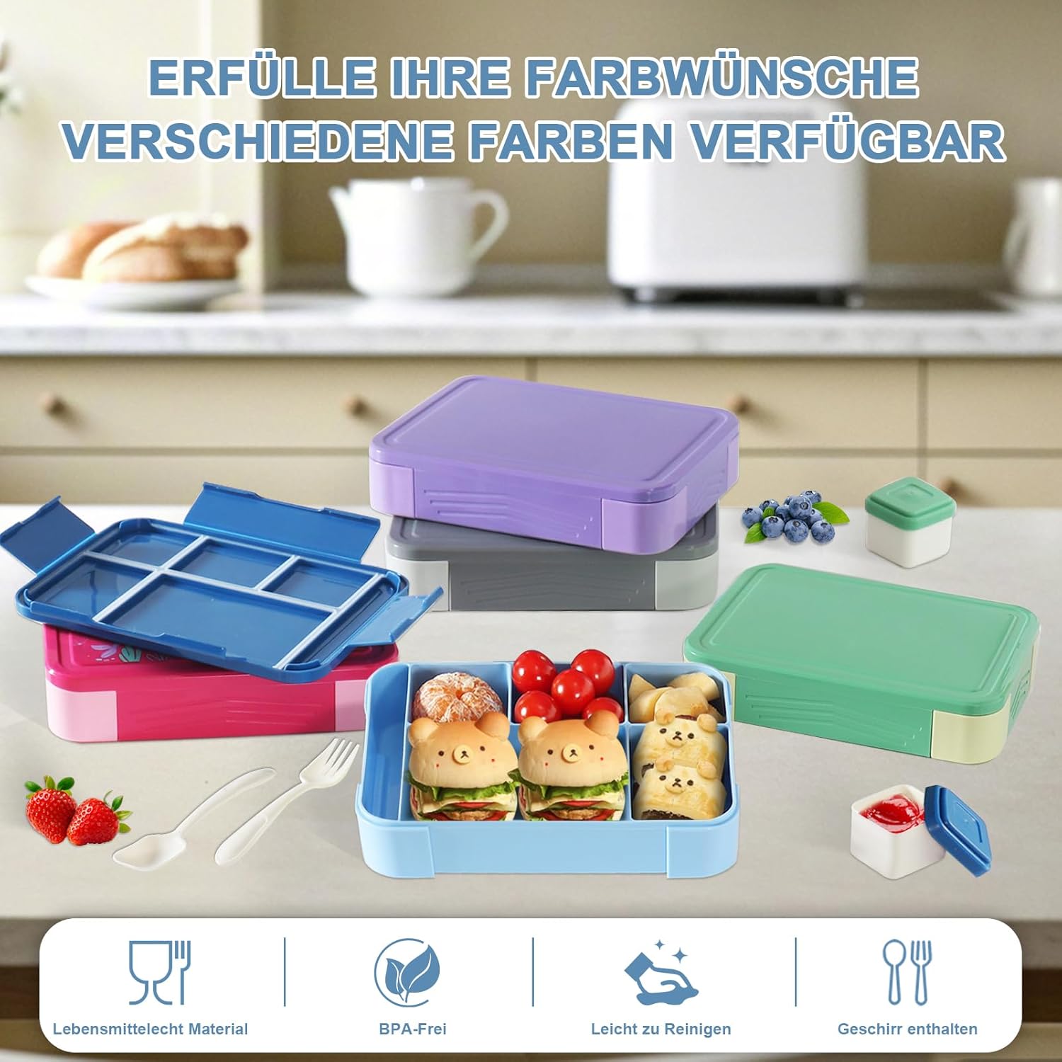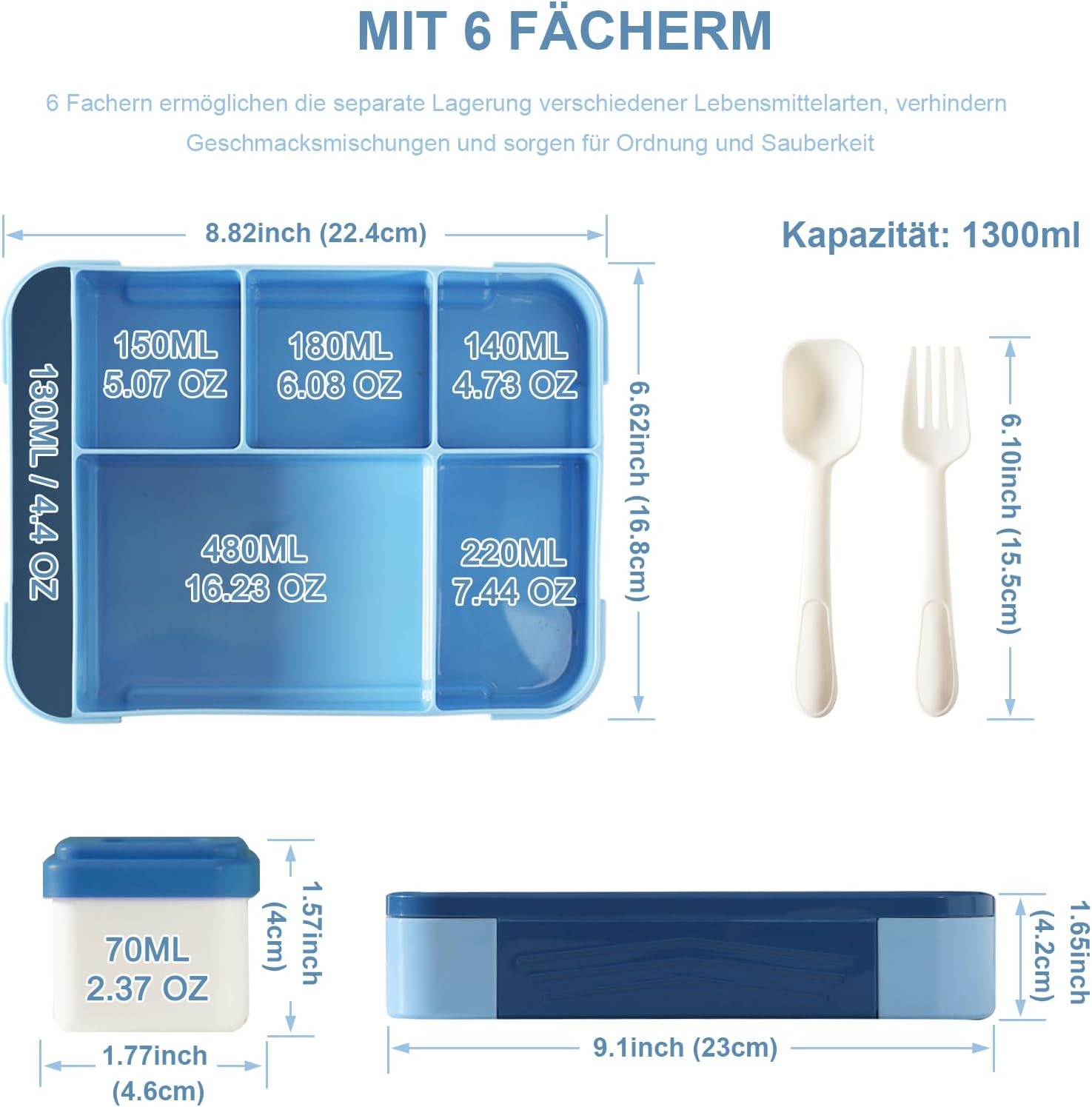 Materiale per uso alimentare: il nostro contenitore per il pranzo con scomparti è realizzato in polipropilene di alta qualità, privo di BPA e sicuro per il contatto con gli alimenti. Perfetto per il pranzo di bambini e adulti, per un pasto senza preoccupazioni con tutta la famiglia. Design a prova di perdite: il contenitore per bambini dispone di un anello di tenuta a tenuta stagna che impedisce la fuoriuscita di salsa. Ideale per viaggiare: al lavoro, a scuola o a un picnic, puoi usarlo senza preoccupazioni. Scomparti multipli – La Bento Box offre una capacità di 1300 ml e 6 divisori, ideale per separare piatti principali, contorni e frutta. In questo modo i sapori rimangono freschi e non si mescolano, perfetti per pasti vari. Multifunzione: il contenitore per il pranzo con scomparti è adatto al microonde, al frigorifero. La scatola del contenitore per bambini (senza coperchio) è lavabile in lavastoviglie, risparmio di tempo e comfort per una vita moderna e frenetica. Design portatile: il contenitore per il pranzo per bambini è compatto e pratico con cucchiaio, forchetta e contenitore per salse, è facile da trasportare e soddisfa tutte le esigenze di cibo. È la scelta ideale per la casa e le attività all'aperto.