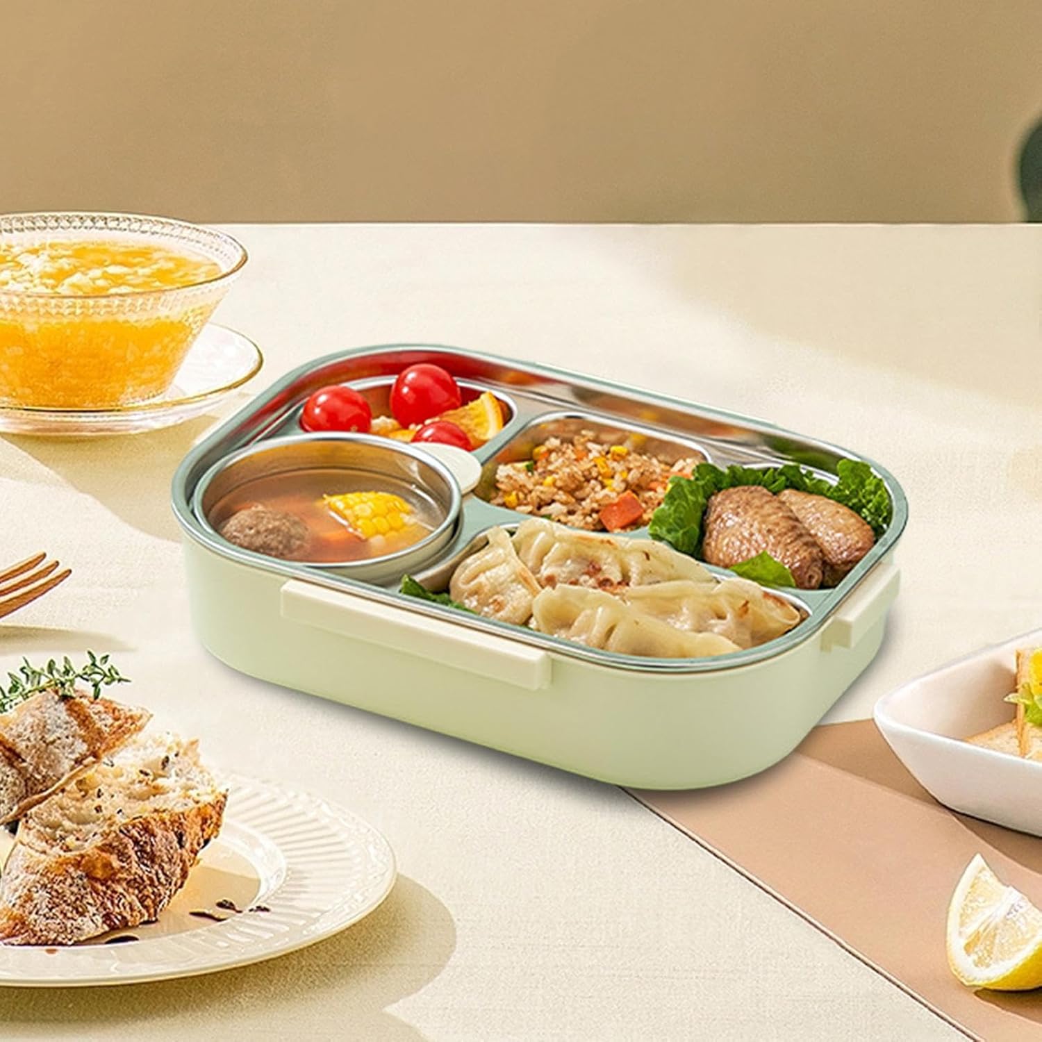 Separazione del gusto: suddivisione multipla e scomparto separato per zuppa del contenitore in acciaio inox conservano aromi e ordine. Ideale per persone attente alla salute con varie persone per lavoro o sport Posate incluse per il massimo comfort: questo contenitore per il pranzo in acciaio inox fornisce un cucchiaio e un bastoncino per avere tutti gli utensili necessari per il vostro servizio. Gli angoli arrotondati e facili da pulire aumentano la facilità d'uso e sono ideali per uno stile di vita attivo in movimento. Materiale sano: il contenitore per il pranzo in acciaio inossidabile combina acciaio inossidabile 304 e PP per un prodotto sicuro e sano. Grazie alla resistenza alla ruggine e all'usura, è un compagno affidabile per l'uso quotidiano, sia all'aria aperta, pendolarismo o per una rapida pausa snack. Opzioni di riscaldamento multipla: il contenitore per il pranzo in acciaio inox per bambini offre diversi metodi di riscaldamento tramite piastra riscaldante o acqua calda. Il microonde consente di risparmiare tempo. Eccellente per i viaggi o preparati en. Prevenzione affidabile delle perdite: la combinazione di guarnizione in silicone e quattro robuste clip di bloccaggio garantisce il trasporto a prova di perdite o cibi umidi durante il pendolarismo, l'escursionismo o il picnic all'aperto senza fuoriuscite.