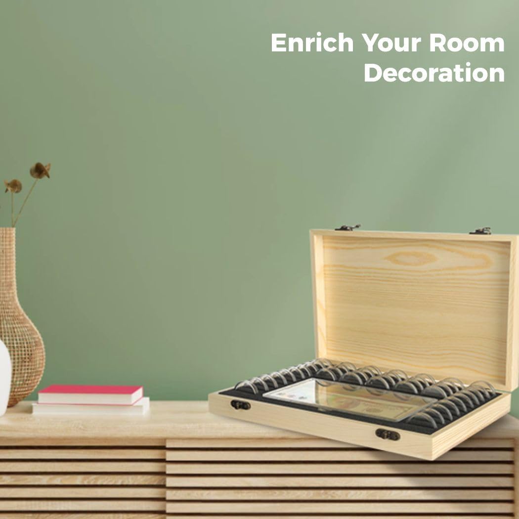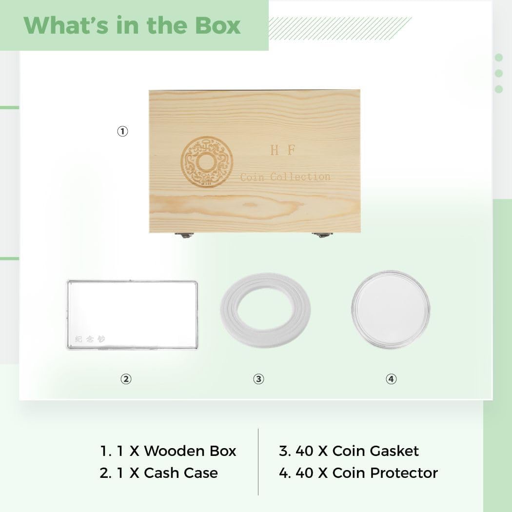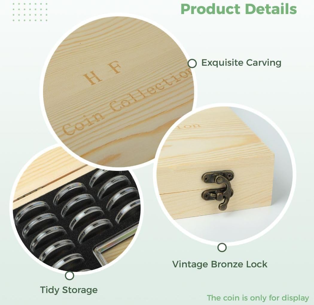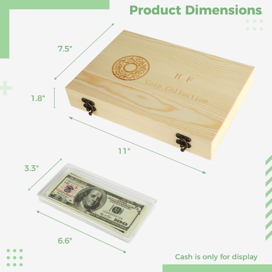 Design spazioso: può contenere fino a 40 di varie dimensioni e 100 banconote Organizzazione efficiente: mantiene le bollette pulite e in ordine Aspetto elegante: il design vintage aggiunge eleganza ed è di facile accesso Costruzione durevole: realizzata in legno per un uso prolungato Dimensioni compatte: portamonete (28 x 19 x 4,5 cm), scatola per banconote (16,8 x 8,3 cm), dimensioni del cuscinetto di regolazione (1,8-3 cm)