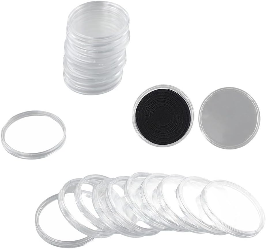 Scatola portaoggetti per monete: 40 pezzi di plastica trasparente porta capsule con guarnizioni nere regolabili per conservare le monete in modo sicuro e organizzato Protezione di lunga durata: realizzato in materiale plastico ispessito che fornisce una robusta difesa contro polvere ed erosione mantenendo il vostro in condizioni incontaminate Misura regolabile per diverse dimensioni: diametro interno di 46 mm può ospitare da 16 mm a 46 mm con guarnizioni personalizzabili per garantire una tenuta aderente Design trasparente per una facile visualizzazione: consente la piena visibilità di ogni moneta senza rimozione in modo da poter visualizzare e identificare le collezioni a colpo d'occhio Soluzione compatta e portatile: leggera e salvaspazio, ideale per uso domestico o in viaggio, senza rischio di danni durante il trasporto