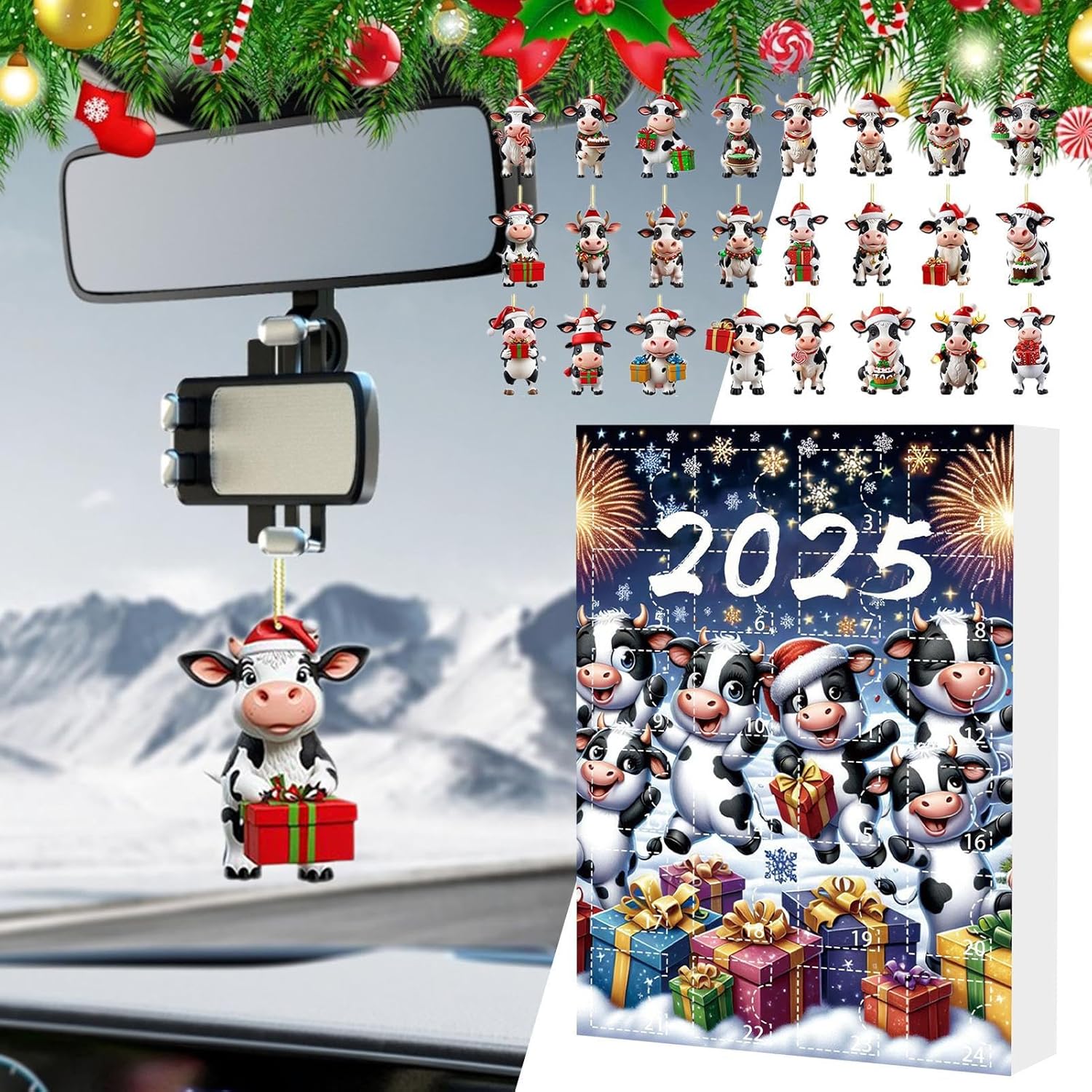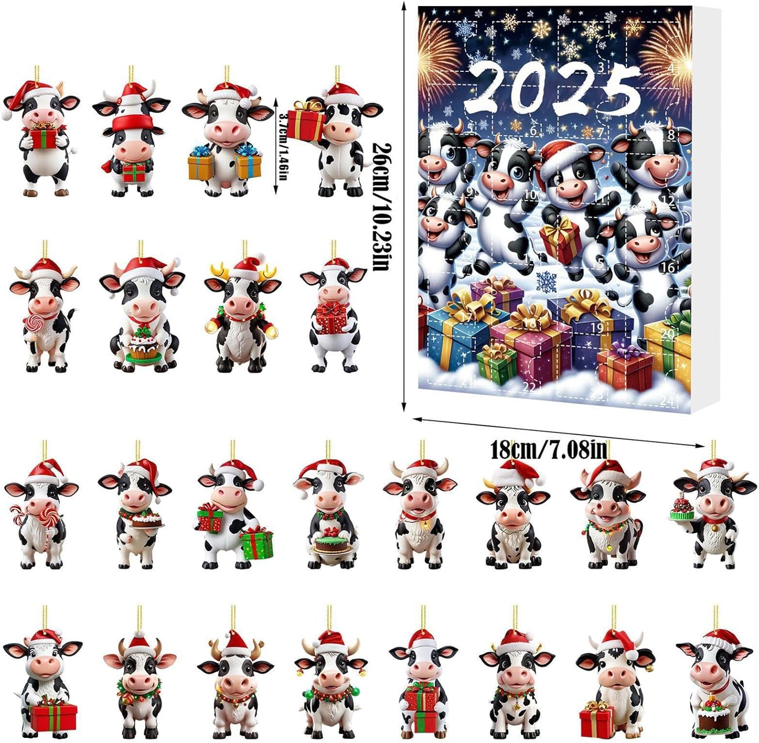 Divertimento con il calendario per il conto alla rovescia - Questo calendario per il conto alla rovescia di Natale presenta 24 ornamenti di mucche per migliorare le tradizioni familiari, offre una sorpresa quotidiana ai bambini e crea entusiasmo per le vacanze con il suo design accattivante e il fascino festivo Superficie resistente ai graffi: mostra accattivanti disegni di mucche realizzati in materiale acrilico durevole per garantire che i colori brillanti siano ben conservati e resistano ai danni mantenendo intatta la struttura del prodotto attraverso l'uso ripetuto. appendi senza sforzo agli specchietti o alle portiere dell'auto per un tocco festoso. Idea stagionale per l'esposizione: questo adorabile calendario per il conto alla rovescia natalizio a tema mucca è realizzato a mano per diffondere l'allegria festiva, viene fornito in una bellissima confezione regalo, è un'ottima idea regalo per le feste ed è ideale per scambi significativi con gli amici.