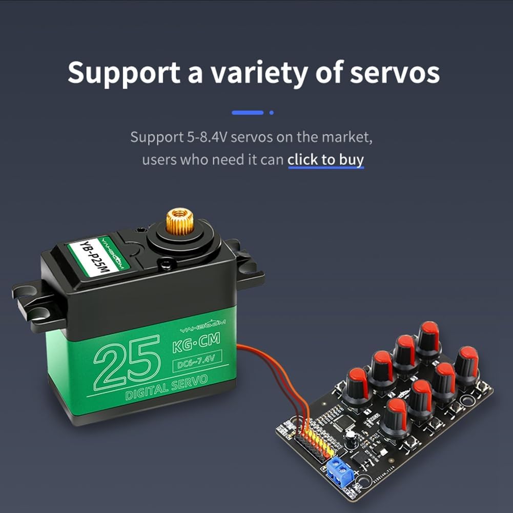 4. Precisione del controllo dello sterzo: 0,09 gradi (valore minimo di livello 1us IE Pwm) 2. L'MCU maturo e a 8 bit integrato viene utilizzato per generare segnali PWM ad alta risoluzione e controllarli con precisione. 3. Supporta il manuale e il ritorno al centro, che possono essere commutati tramite funzione Caratteristiche: 1. Utilizzare potenziometri ad alta precisione, programmazione richiesta, potenziometro a 8 canali e servo controllati in corrispondenza a ; controller servo a 8 canali, adatto per il debug e il test di servo da 5 V a 8,4 V, supporta la regolazione manuale/centratura rapida/protezione passing stream 5. di controllo supportato: 20 ms, larghezza impulso: 0,5 ms-2,5 ms; morsettiera (5 V-8,4 V) connettore di alimentazione con funzione di protezione da sovracorrente.