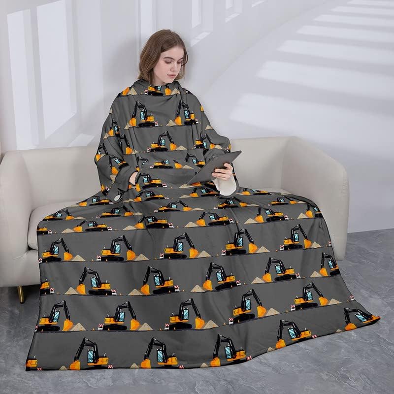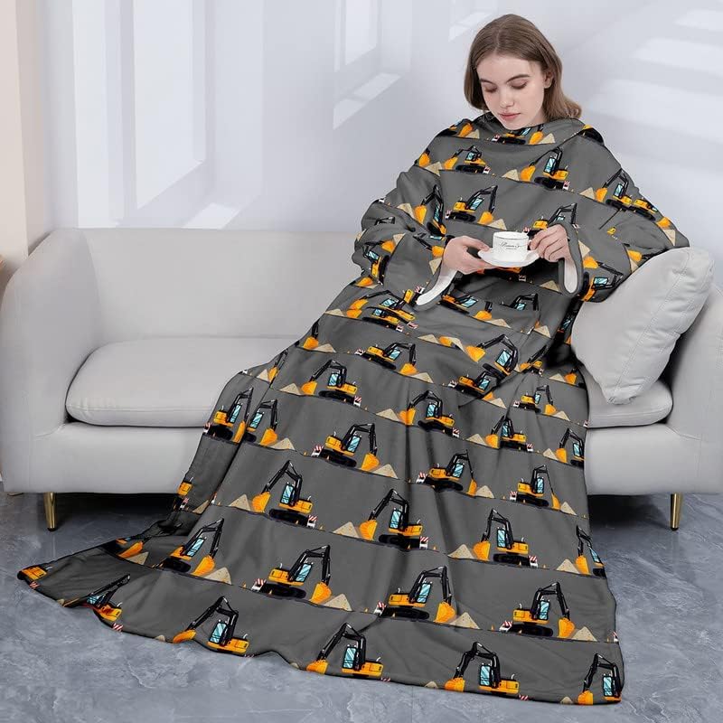 Coperta in pile indossabile da escavatore con maniche per adulti, bambini, donne, uomini, veicoli da costruzione, micro peluche, comoda coperta a maniche avvolgenti, con maniche, 127 x 127 cm