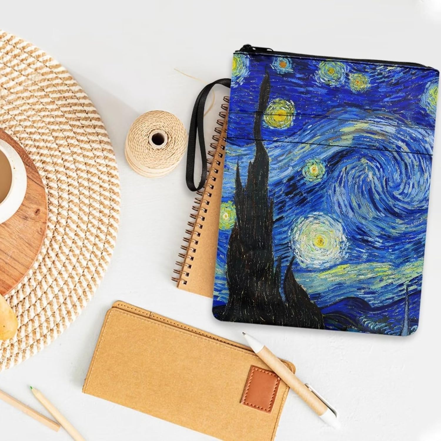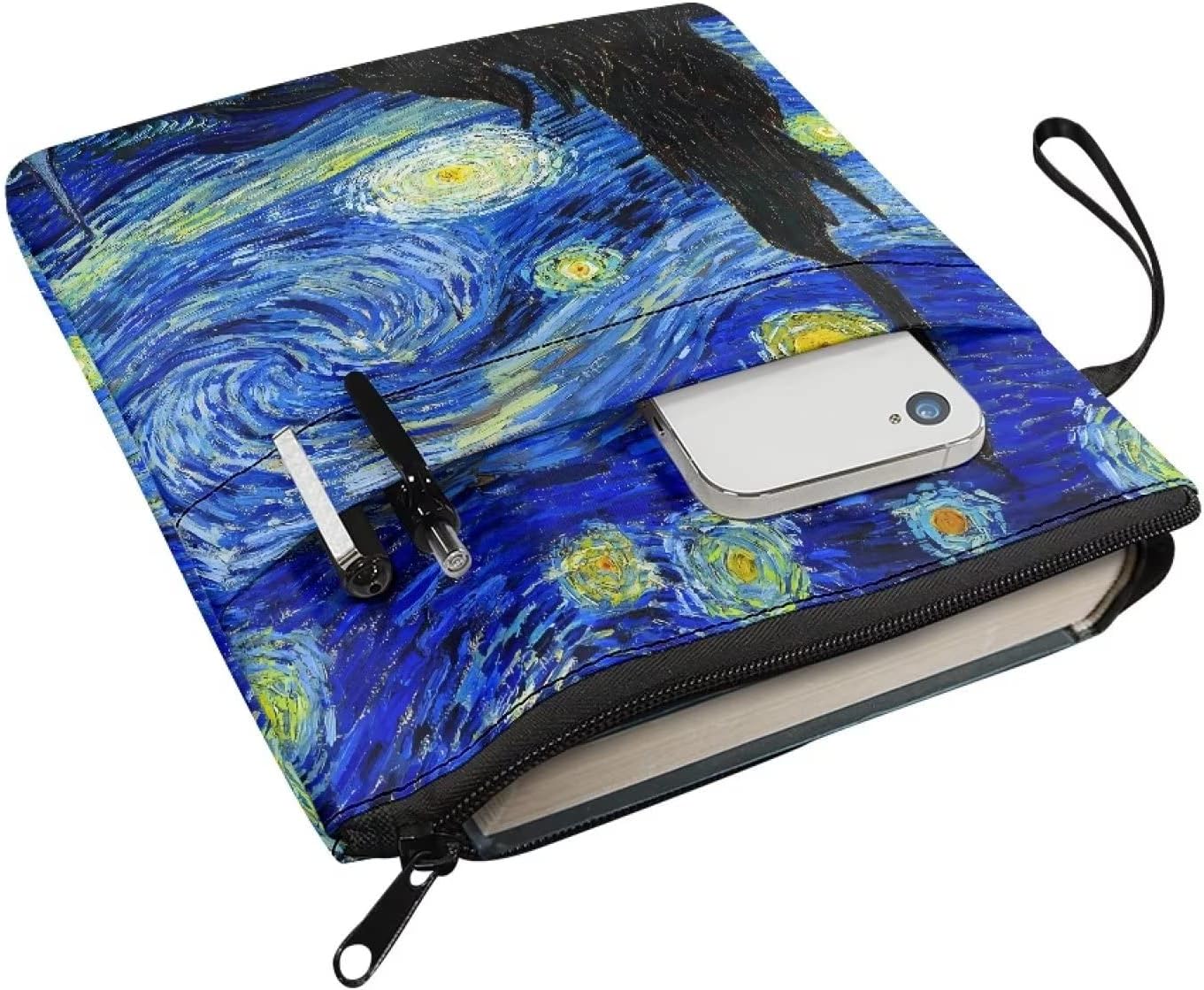 Copertina per libri con cerniera e tasca frontale, motivo Van Gogh, notte stellata, 22 x 29 cm, con corda portatile, per scuola, bambini, ragazzi e ragazze