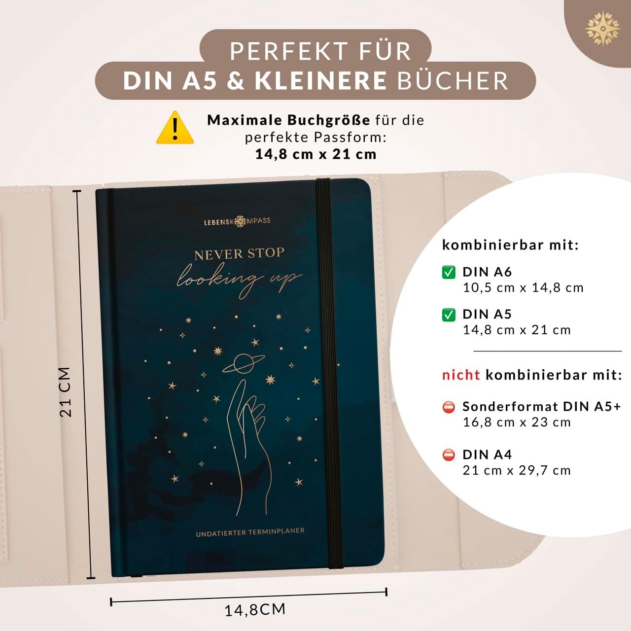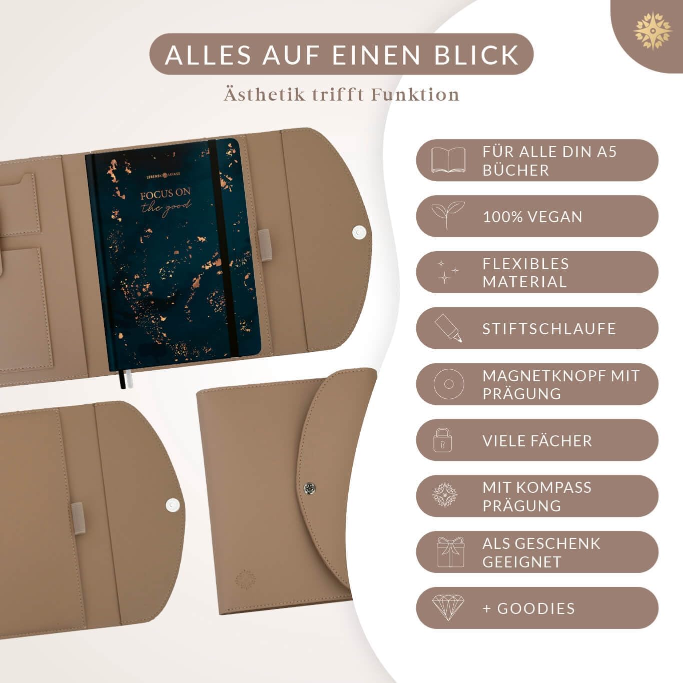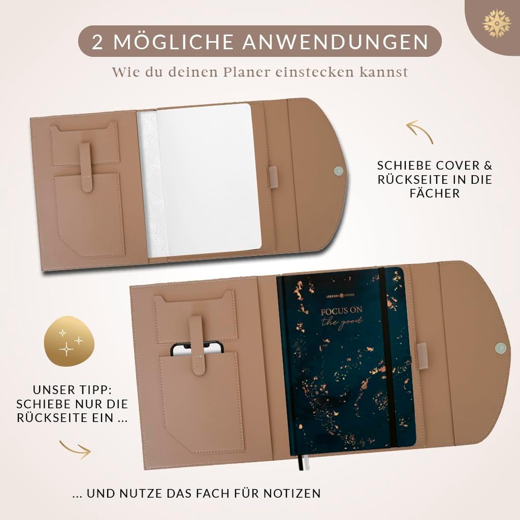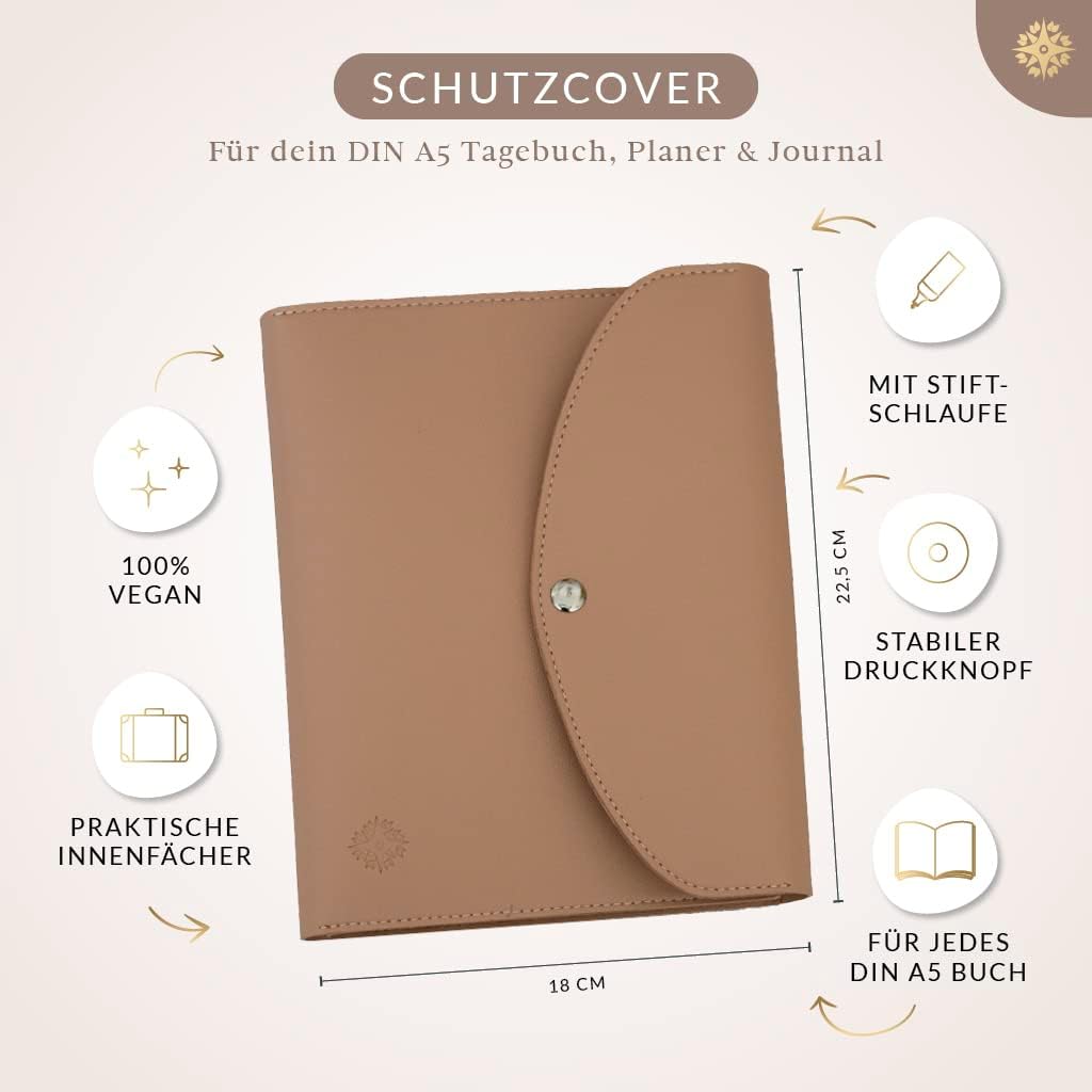 MULTITALENTO: questa copertina del libro non solo protegge il tuo calendario dai graffi, ma dispone anche di diversi scomparti per riporre in modo pratico i tuoi utensili. 100% VEGAN: la borsa per libri è realizzata in pelle PU vegana al 100%, è cucita di alta qualità e quindi non necessita di colla. PER DIN A5: questa protezione per libri può essere utilizzata per tutti i libri DIN A5. ATTENZIONE - non adatto per DIN A5+. È possibile chiudere il coperchio con un robusto pulsante. PRODOTTO DI MARCHIO ELEGANTE: apprezziamo il bell'aspetto dei nostri prodotti. Ecco perché da noi troverai solo design eleganti e dettagli utili. START-UP MINDFUL: come start-up, per noi è importante avvicinare gli adulti alla consapevolezza e all'amor proprio. Dai un'occhiata anche agli altri nostri prodotti.