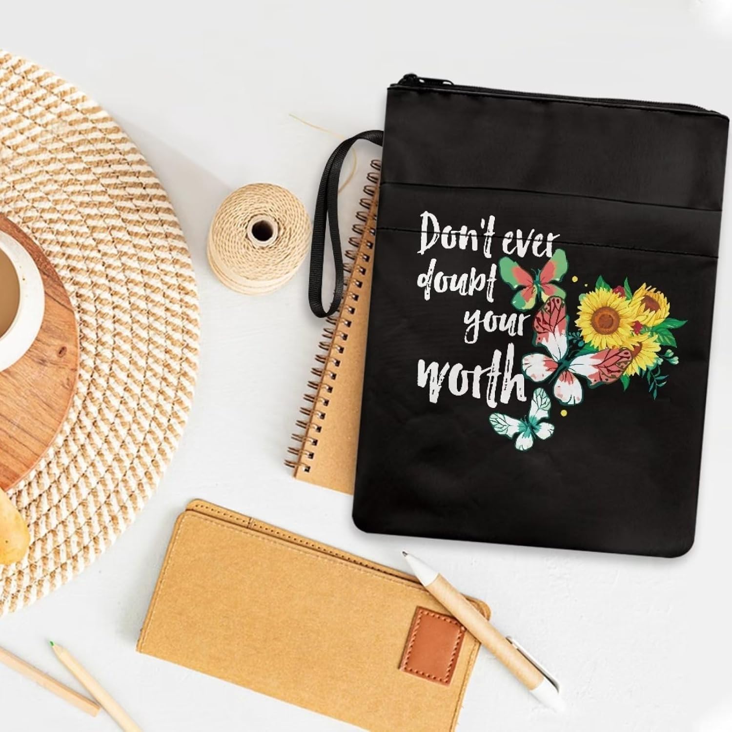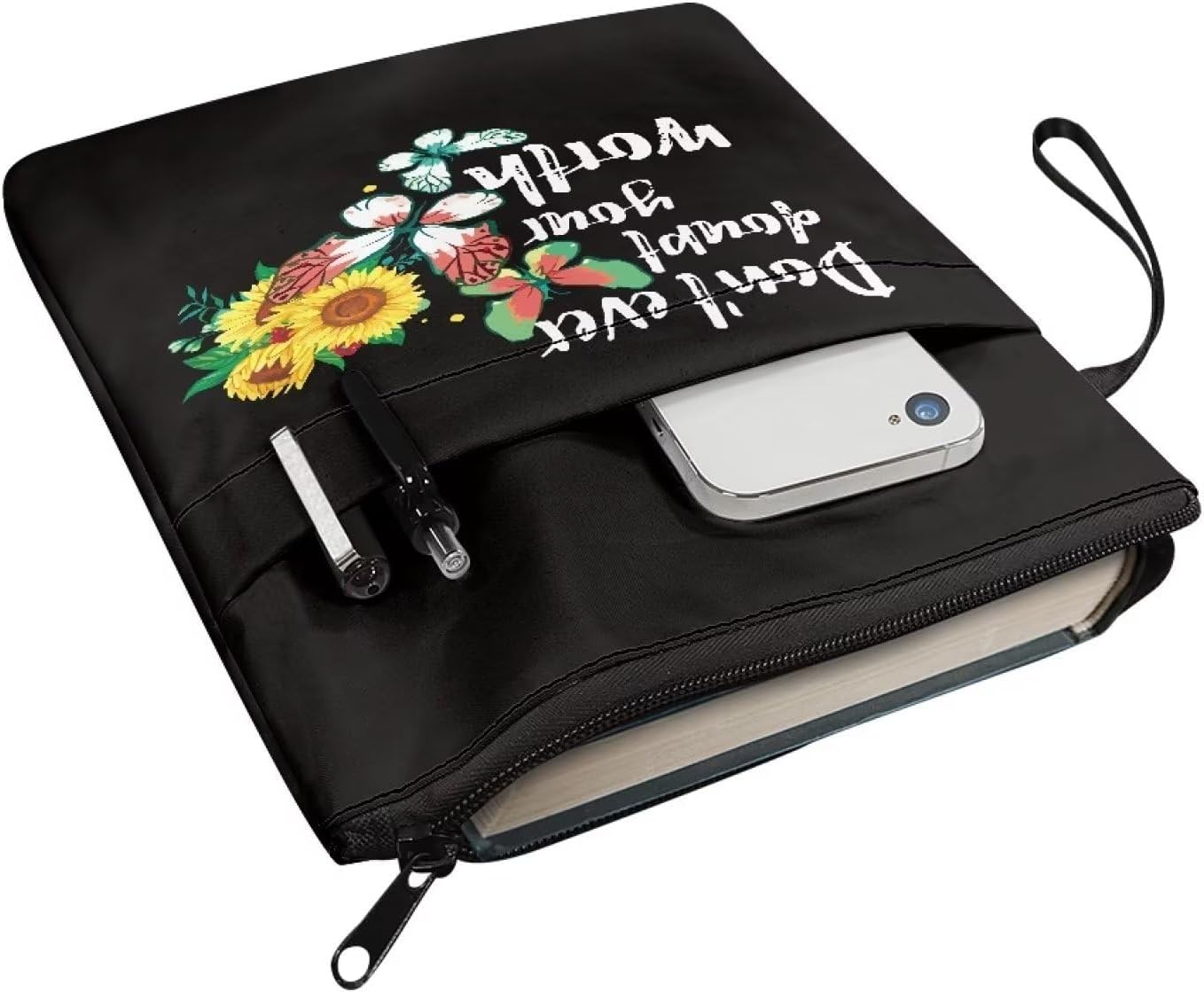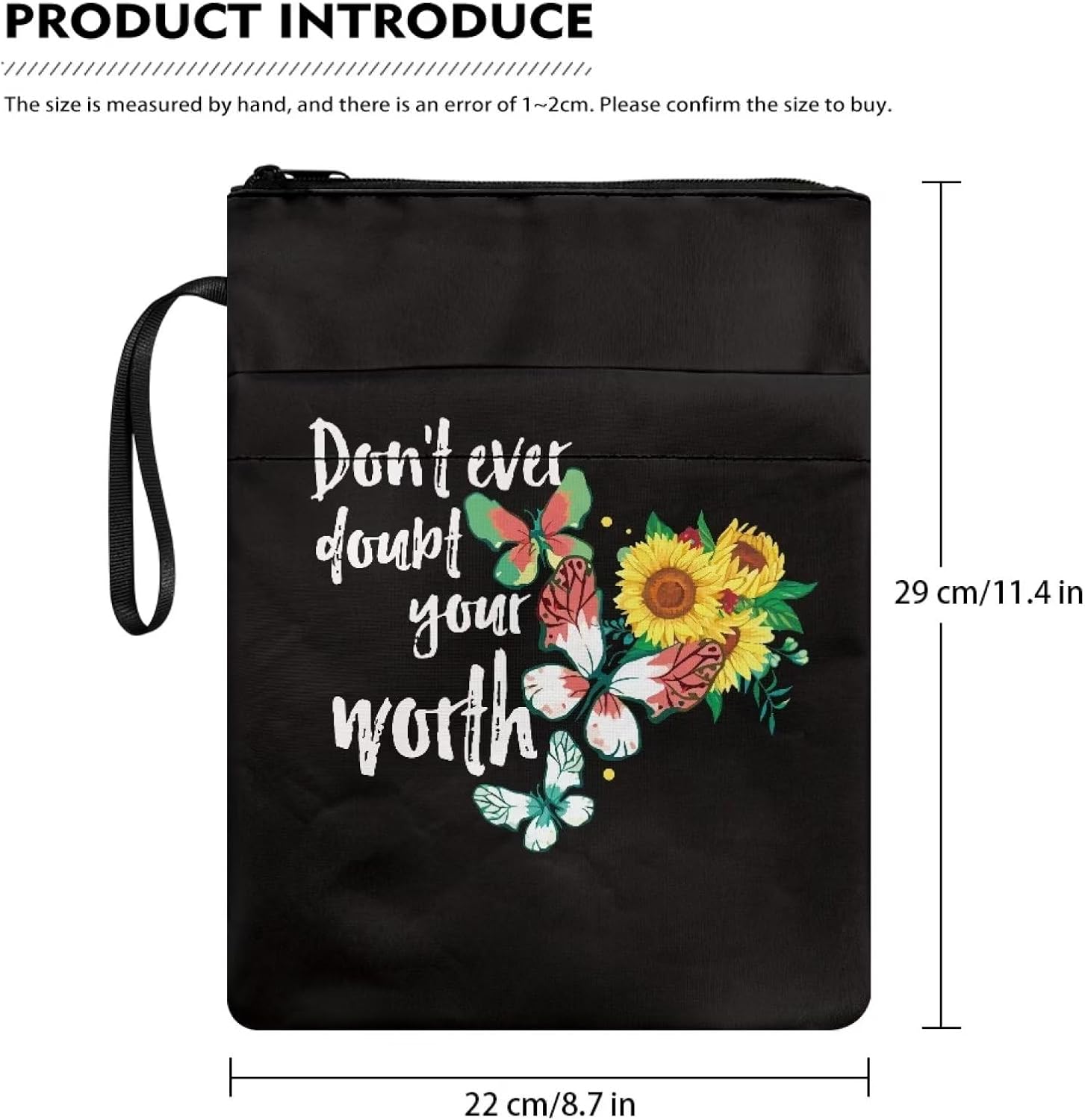 Copertina per libro con stampa di farfalle e girasoli per amanti adolescenti e adulti Don't Ever Doubt Your Worth Books Protector Pounch con cerniera
