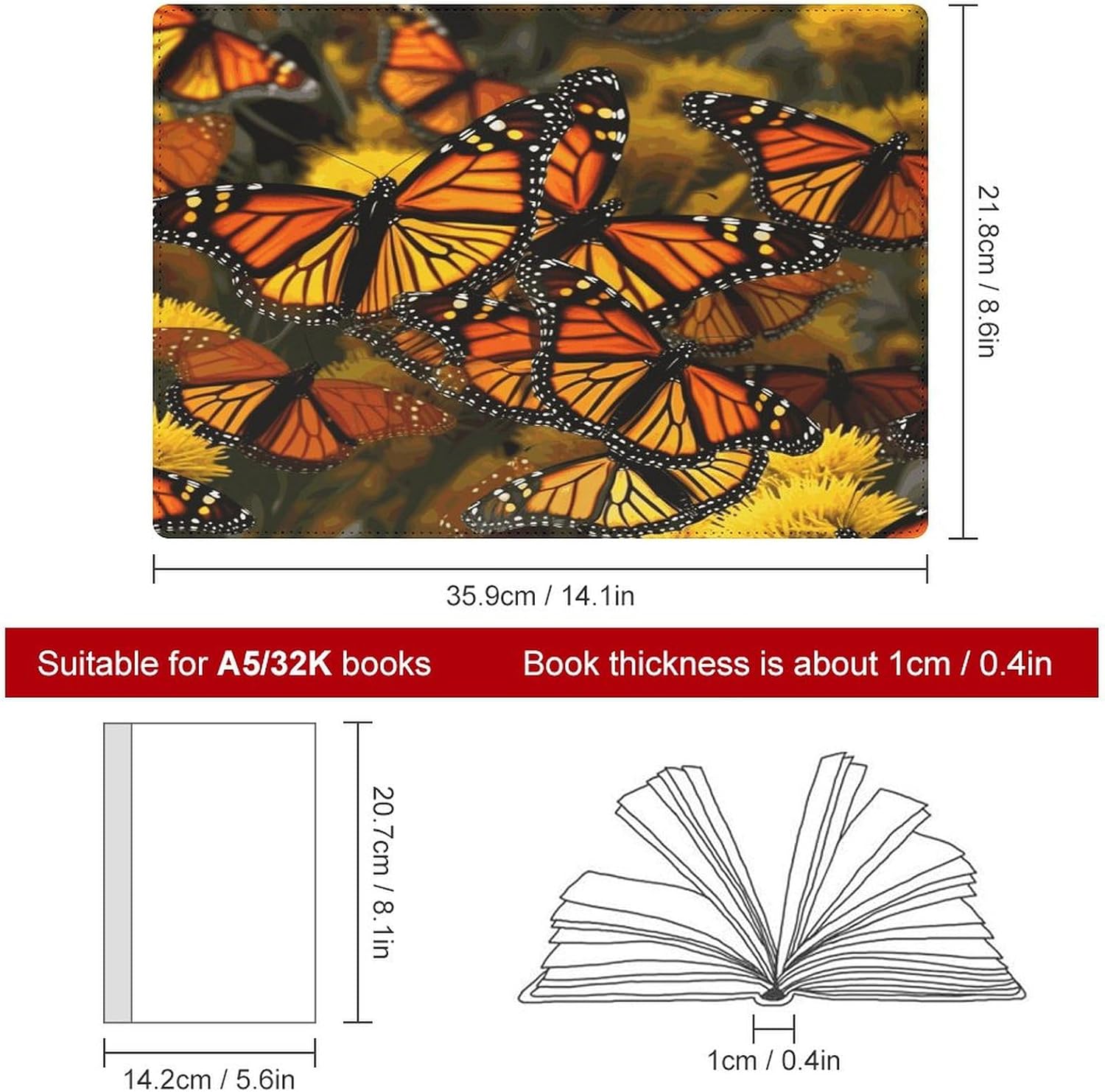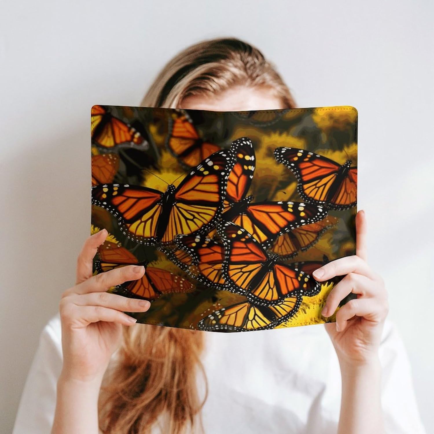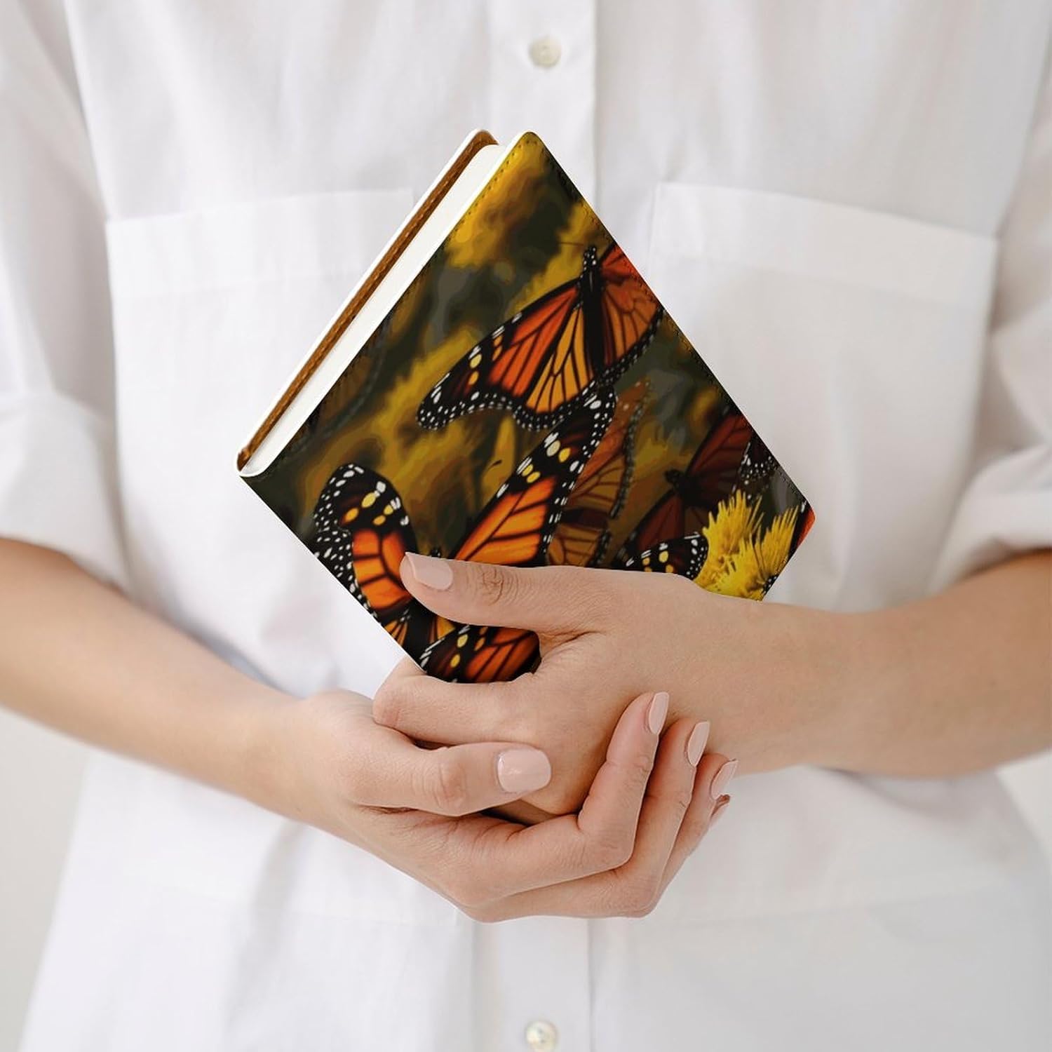 Design: copertine per quaderni da viaggio, il design robusto offre un'eccellente protezione per il tuo diario. Copertina del libro elastica stampata con farfalle monarca, materiale di rivestimento morbido, può evitare l'attrito sui libri. Materiale: copertina del libro resistente realizzata in morbida ecopelle di alta qualità, impermeabile. La classica copertina per notebook è realizzata con tecnologia di stampa UV e ha un aspetto raffinato. Applicazione: le copertine in pelle per diari sono dotate di design interessanti, adatte agli studenti per imparare e utilizzare, le copertine per notebook da donna sono adatte anche per l'uso in uffici, scuole o altrove REGALI - Le copertine impermeabili per notebook sono oggetti di uso quotidiano. La copertina dell'agenda è adatta come regalo per amici, colleghi o bambini. Uso e pulizia: la copertina del libro può essere utilizzata ripetutamente. Si consiglia di pulire e pulire regolarmente la copertina in pelle del notebook