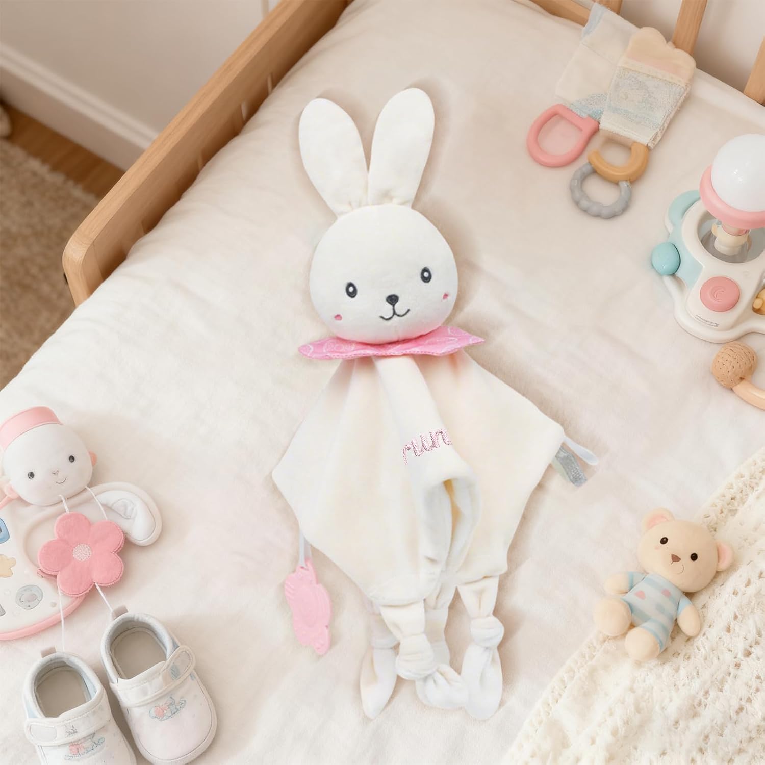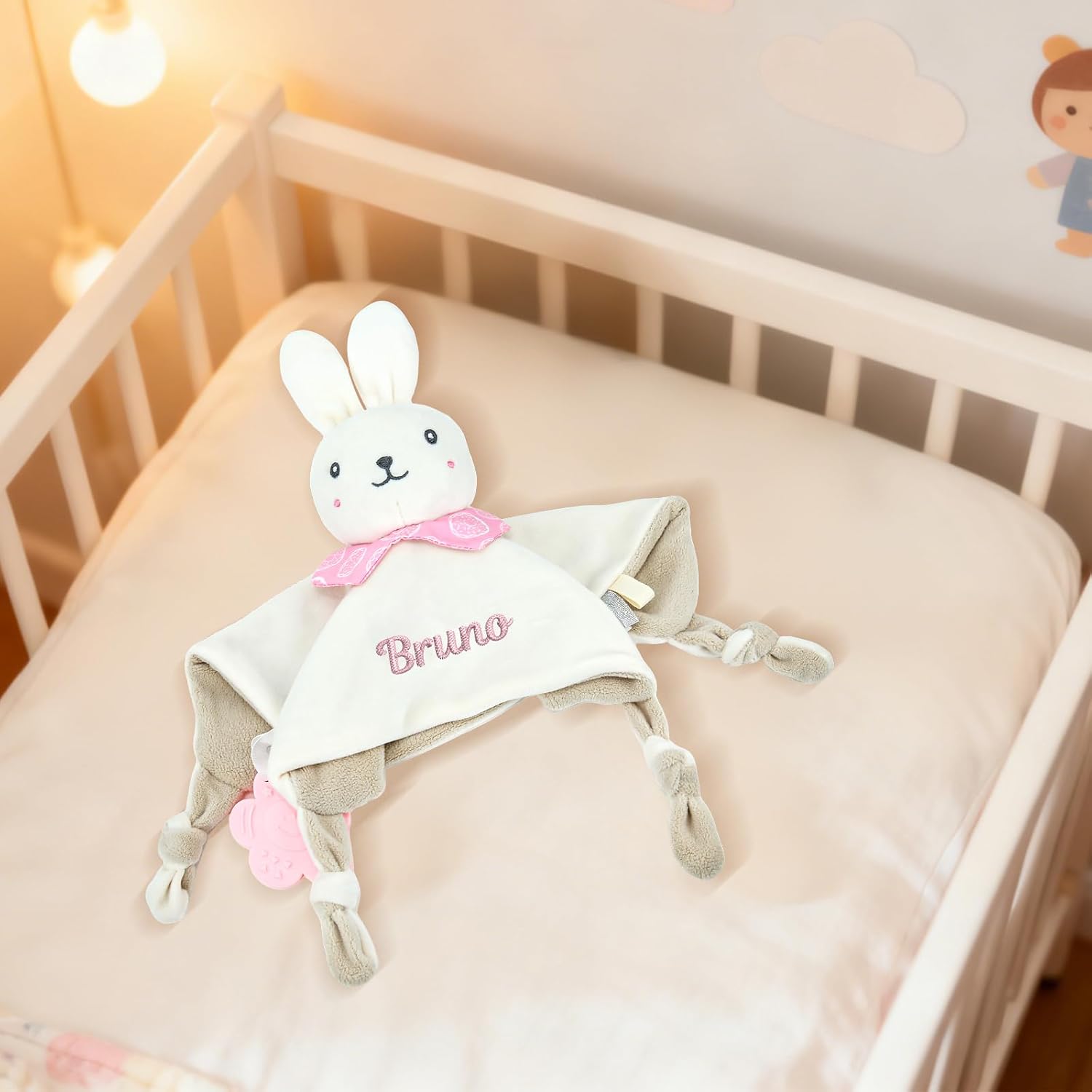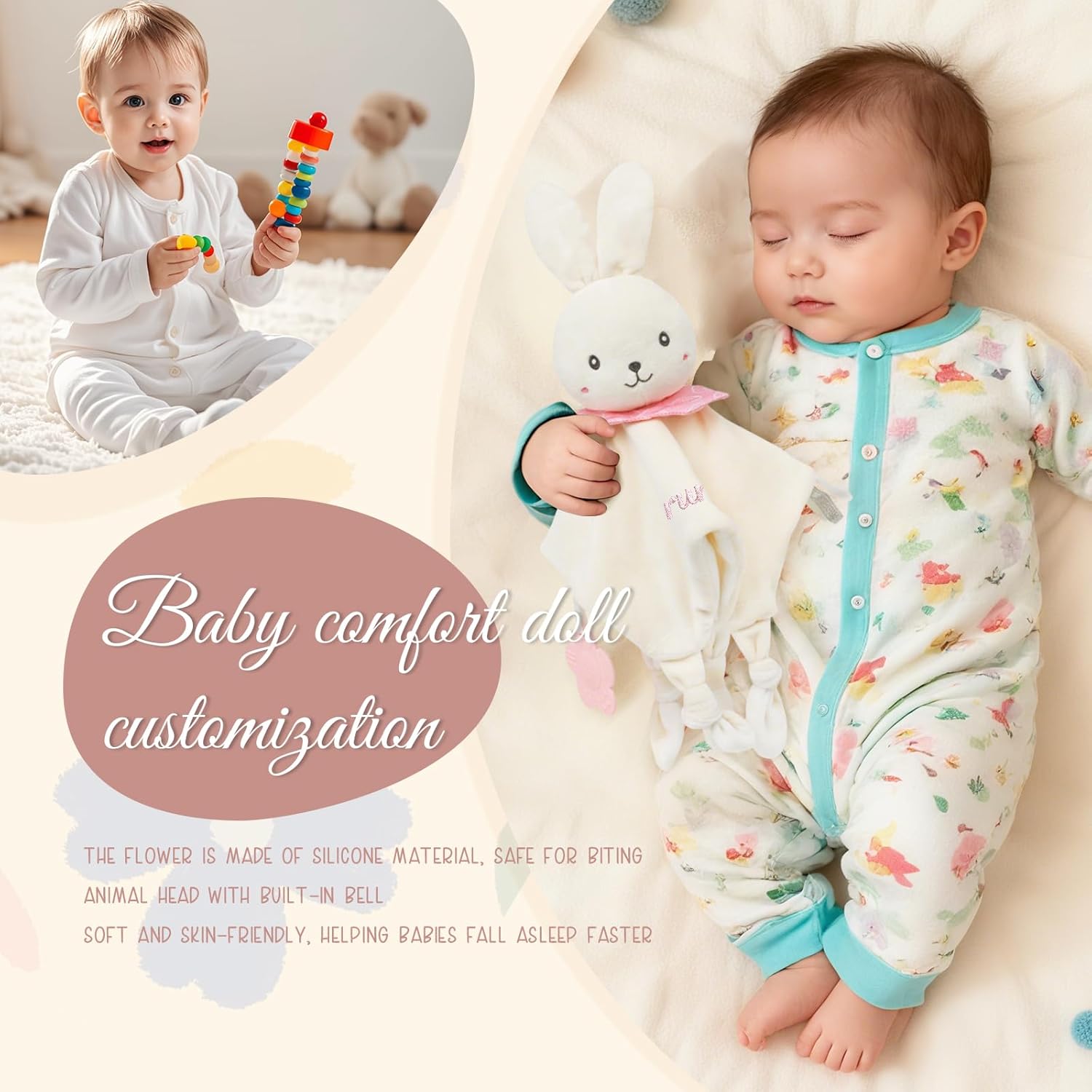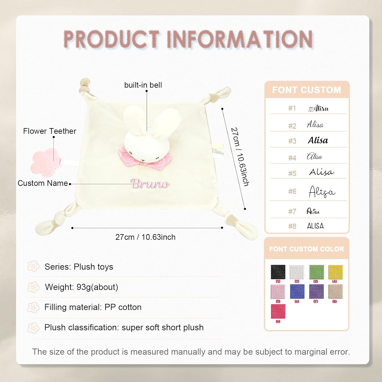 Coperta personalizzata per neonati: ricama il nome, il soprannome o una data speciale del tuo bambino sulla parte anteriore della coperta. Scegli tra diversi caratteri e colori. Il ricamo è resistente e non si sfilaccia, creando un regalo davvero unico e personalizzato. Materiale ultra morbido: realizzata in morbidissimo tessuto felpato con imbottitura in cotone PP, questa copertina personalizzata per neonati offre un tocco delicato che non irrita la pelle sensibile. La sua texture delicata e delicata sulla pelle aiuta a calmare le emozioni, aumenta la sicurezza e garantisce un sonno tranquillo. Caratteristiche multisensoriali rilassanti: la testa dell'animale incorpora un delicato sonaglio, mentre gli angoli annodati facilitano la presa. Include un massaggiagengive in silicone a forma di fiore per masticare in sicurezza, alleviando il disagio della dentizione e stimolando l'esplorazione sensoriale. Leggero, portatile e facile da tenere: con una dimensione di circa 27×27 cm e un peso di circa 93 g, questo giocattolo personalizzato è facile da afferrare per i bambini senza sembrare pesante. Perfetto per la casa, il passeggino o come compagno di viaggio. Regalo per neonati: questo giocattolo personalizzato (copertina/copertina di conforto) è progettato appositamente per neonati e bambini piccoli. Disponibile in diversi modelli di animali, è ideale per neonati, feste di un mese/cento giorni, compleanni, baby shower e occasioni simili.