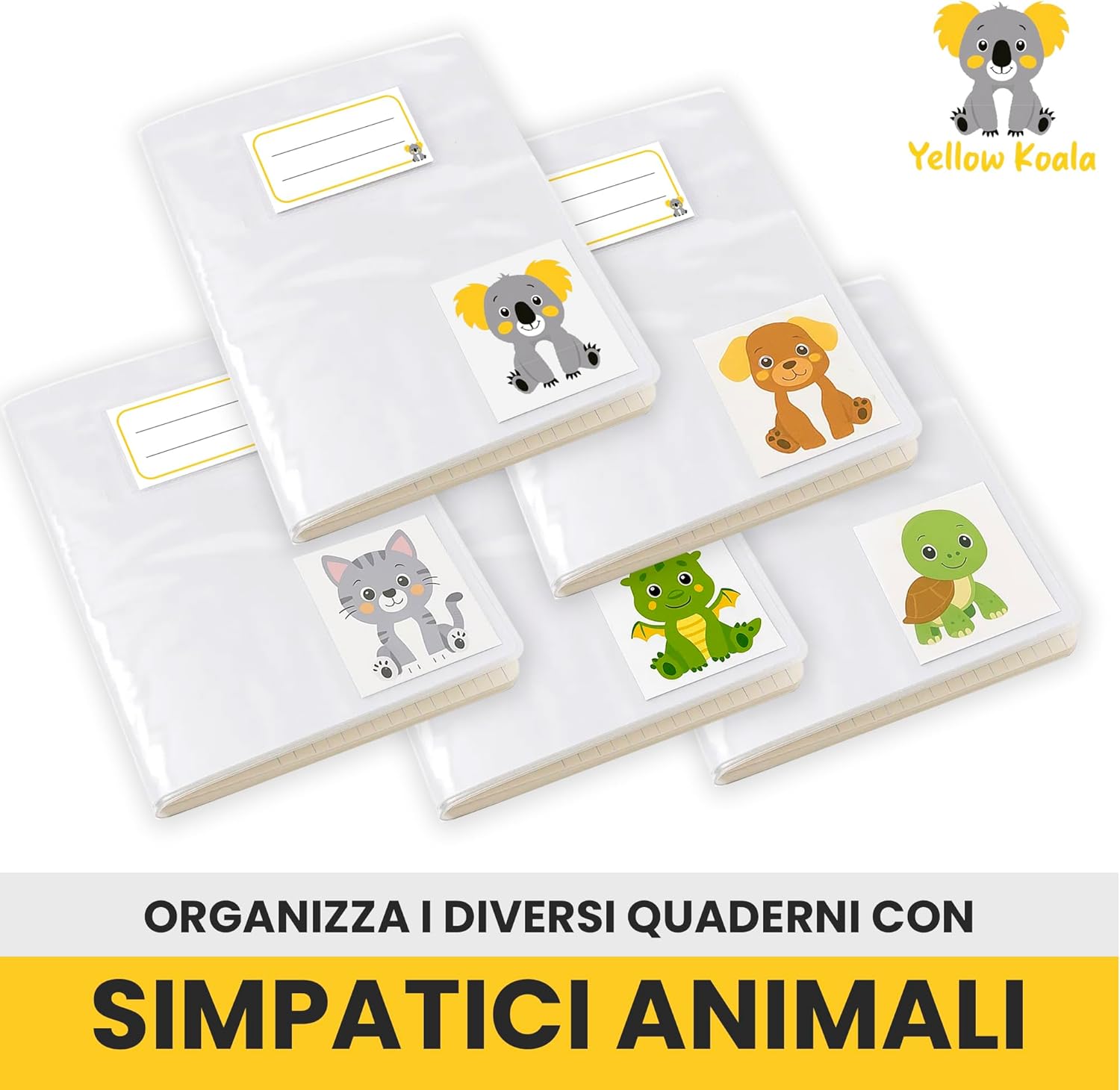 Set da 10 copertine A4 trasparenti – Ogni confezione contiene 10 copertine protettive in formato 30,5 x 21,3 cm, perfette per rivestire i quaderni scolastici standard e mantenerli sempre in ordine. Materiale resistente e impermeabile – Le copertine proteggono i quaderni da sporco, graffi, pieghe e umidità, garantendo una durata maggiore anche con un utilizzo quotidiano intenso. Con etichette personalizzabili – Ogni copertina include un’etichetta con spazio per scrivere nome, cognome e materia, rendendo più semplice organizzare e riconoscere i quaderni. 5 simpatici animali diversi – Le illustrazioni di drago, cane, gatto, tartaruga e koala rendono lo studio più divertente e aiutano i bambini a distinguere facilmente le diverse materie. Ideali per la scuola primaria e oltre – Un accessorio utile per bambini, ragazzi e studenti che vogliono quaderni protetti e ben organizzati in cartella o nello zaino. Protezione efficace contro l’usura – Senza copertina i quaderni tendono a strapparsi e rovinarsi; con le copertine Yellow Koala restano sempre in buono stato più a lungo. Facili da inserire e da rimuovere – Le copertine si applicano velocemente senza colla né forbici: basta inserire il quaderno per avere subito protezione e ordine.